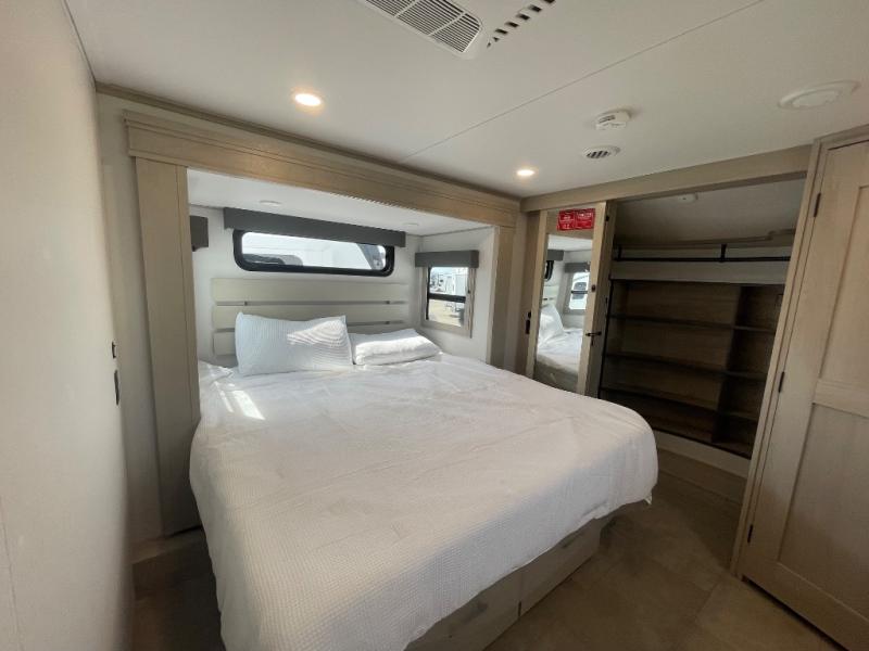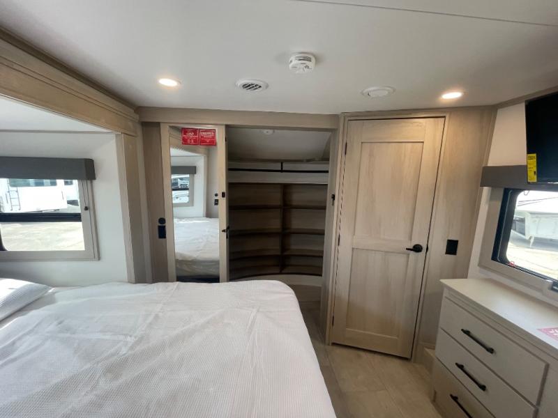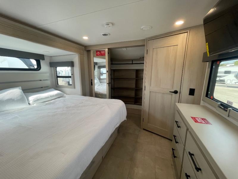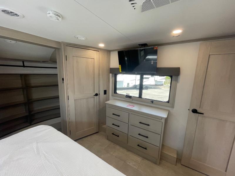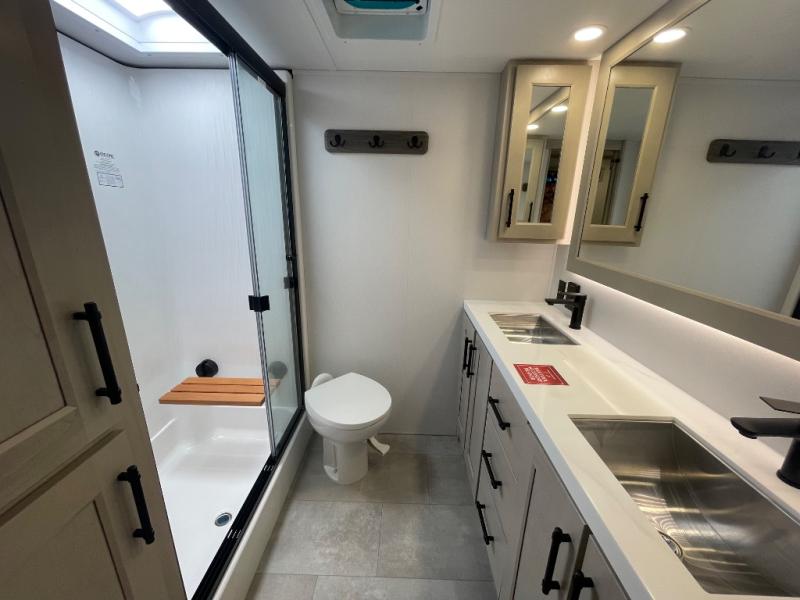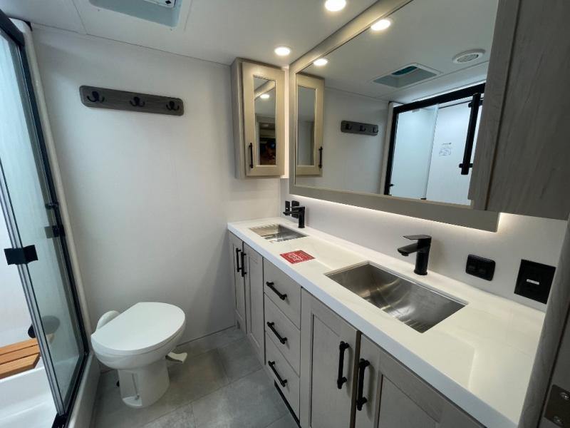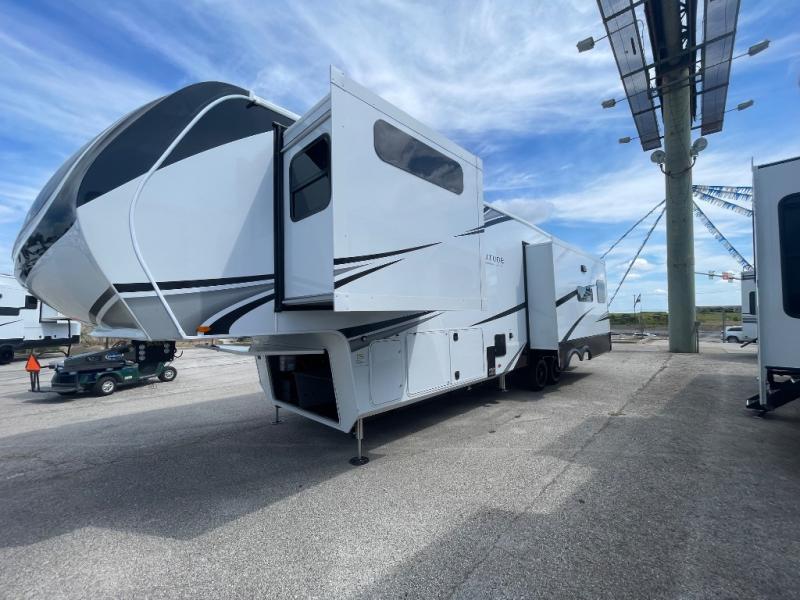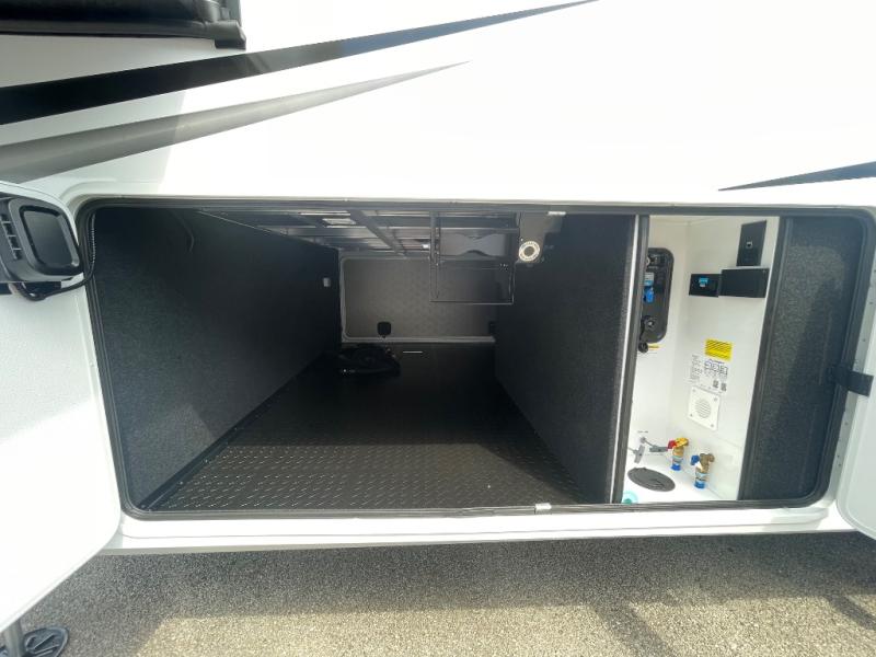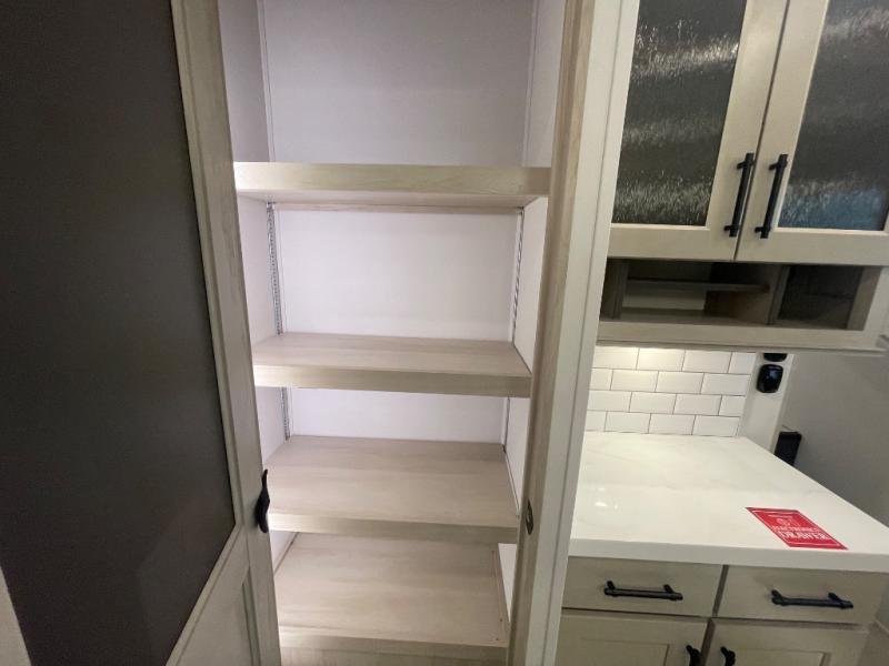 Are you looking to upgrade from a travel trailer to a fifth wheel? If so, this model will be perfect for you! Once you arrive at the campground, you can unload your gear from the pass-through storage, put out the two power awnings, then relax with a cold drink. Inside, you can kick your feet up on the theater seating, play a game at the free-standing dinette, or relax on the tri-fold sofa. The chef of your group will have a kitchen island with a Smart sink, dishwasher prep if you want the option to make cleaning up easier, plus a spacious 20 cu. ft. 12V refrigerator. There is also a built-in oven, plus a pantry and a hutch for storage galore! Having two bath sinks in the full bath is sure to be a big convenience when getting ready for bed, and the queen bed slide out in the front bedroom will provide a great night's rest. You will also find a front wardrobe, a slide top dresser, plus washer/dryer prep!