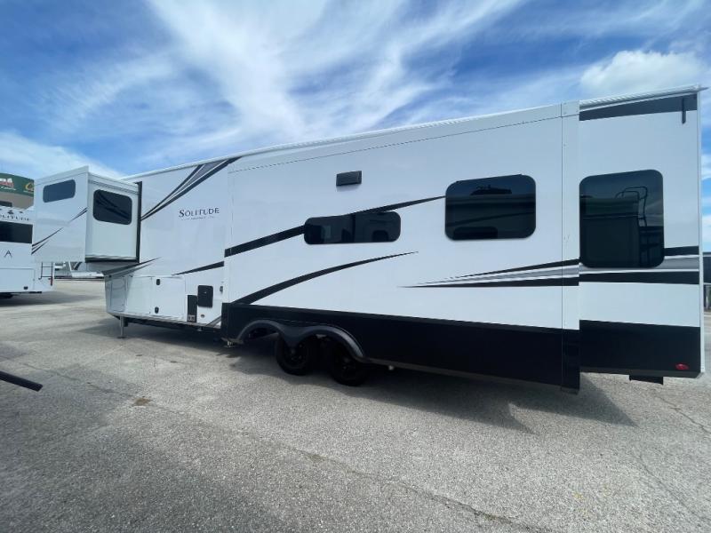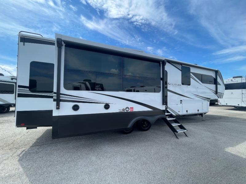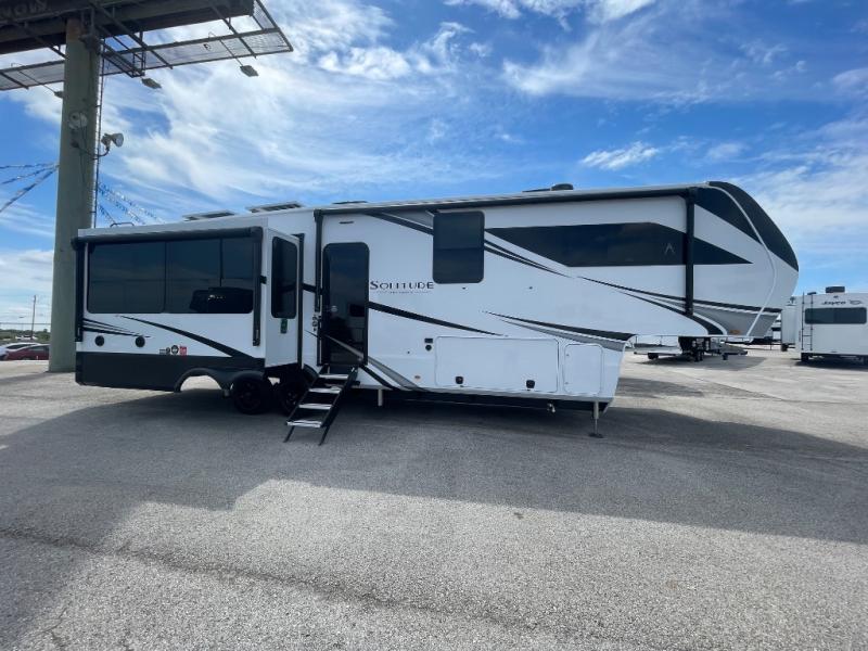 Each Solitude fifth wheel by Grand Design features a 101" wide-body construction, heavy duty 8,000 lb. axles, frameless tinted windows, and high-gloss gel coat sidewalls. You can camp year around thanks to the Weather-Tek Package that includes a 35K BTU high-capacity furnace, an all-in-one enclosed and heated utility center, and a fully enclosed underbelly with heated tanks and storage. Inside, you'll love the premium roller shades, hardwood cabinet doors, solid surface countertops, plus residential finishes throughout to make you truly feel at home. Each model also includes a MORryde CRE3000 suspension system, self adjusting brakes, and a MORryde pin box that will provide smooth towing from home to campground. Affordable luxury is possible with the Solitude fifth wheels; choose yours today!