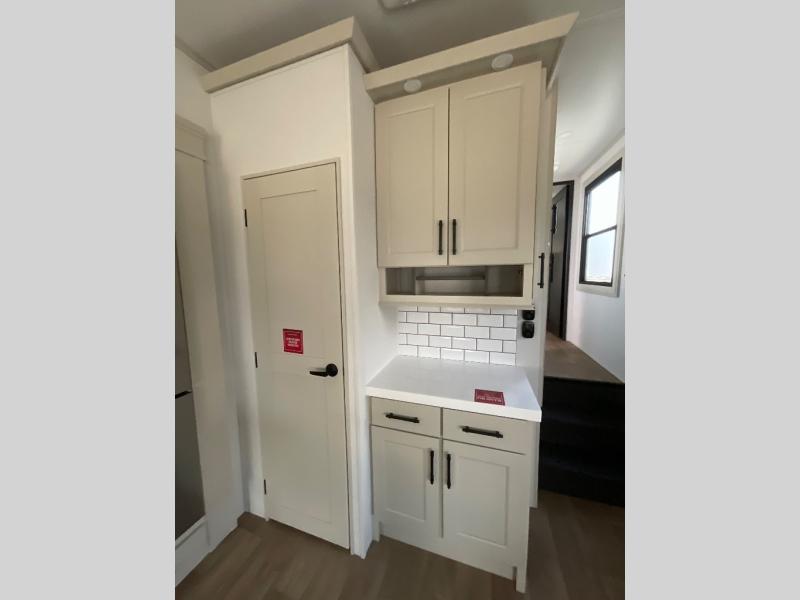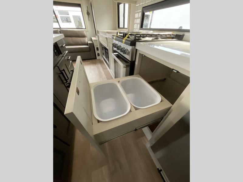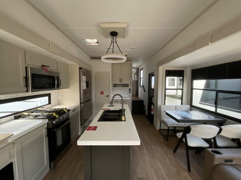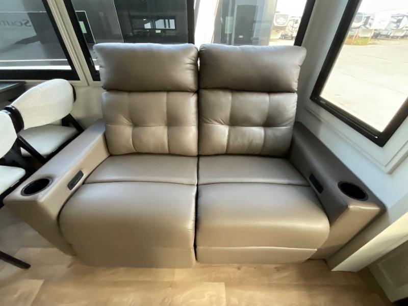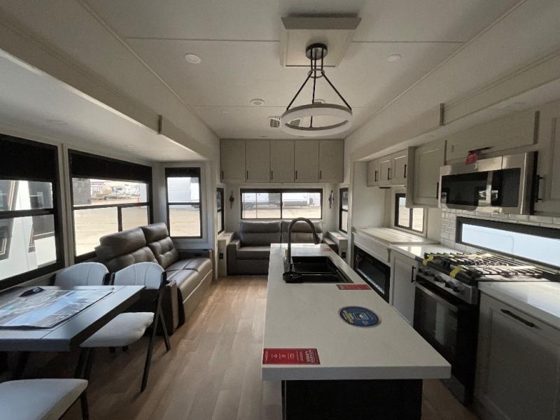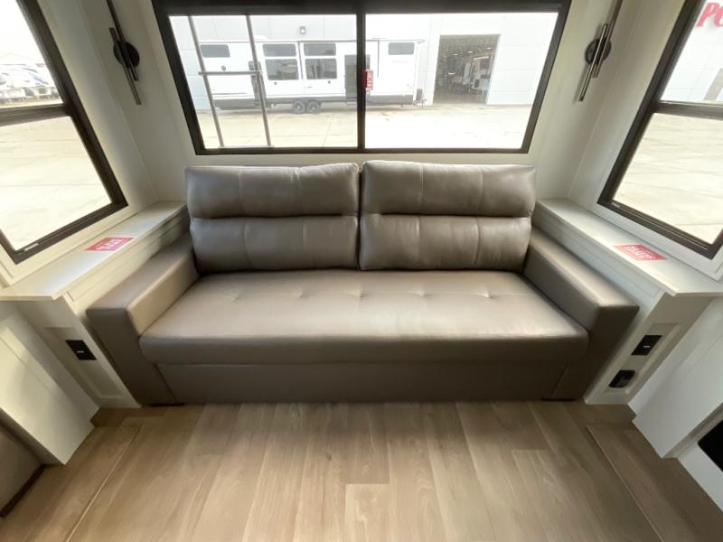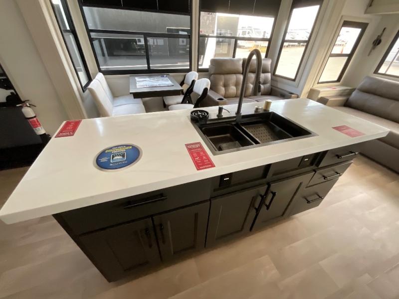 Are you looking to upgrade from a travel trailer to a fifth wheel? If so, this model will be perfect for you! Once you arrive at the campground, you can unload your gear from the pass-through storage, put out the two power awnings, then relax with a cold drink. Inside, you can kick your feet up on the theater seating, play a game at the free-standing dinette, or relax on the tri-fold sofa. The chef of your group will have a kitchen island with a Smart sink, dishwasher prep if you want the option to make cleaning up easier, plus a spacious 20 cu. ft. 12V refrigerator. There is also a built-in oven, plus a pantry and a hutch for storage galore! Having two bath sinks in the full bath is sure to be a big convenience when getting ready for bed, and the queen bed slide out in the front bedroom will provide a great night's rest. You will also find a front wardrobe, a slide top dresser, plus washer/dryer prep!