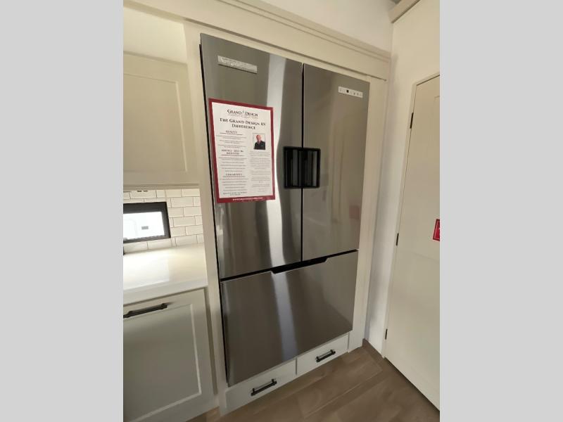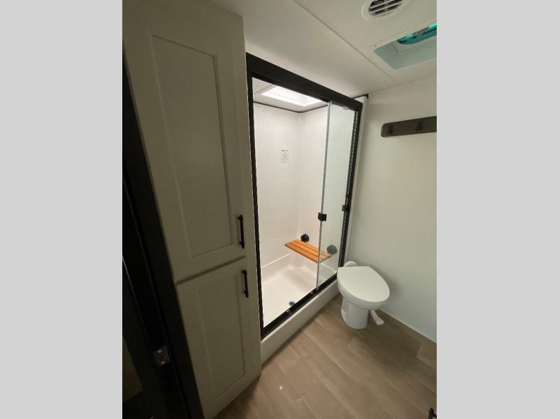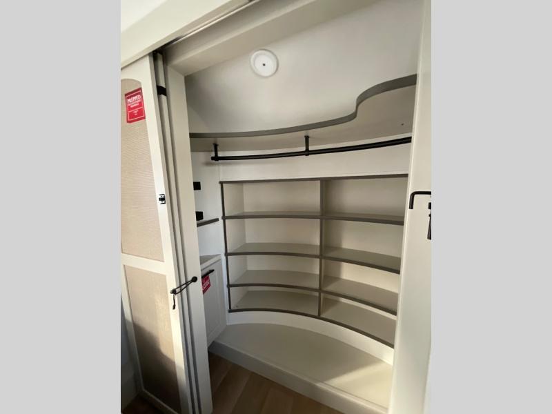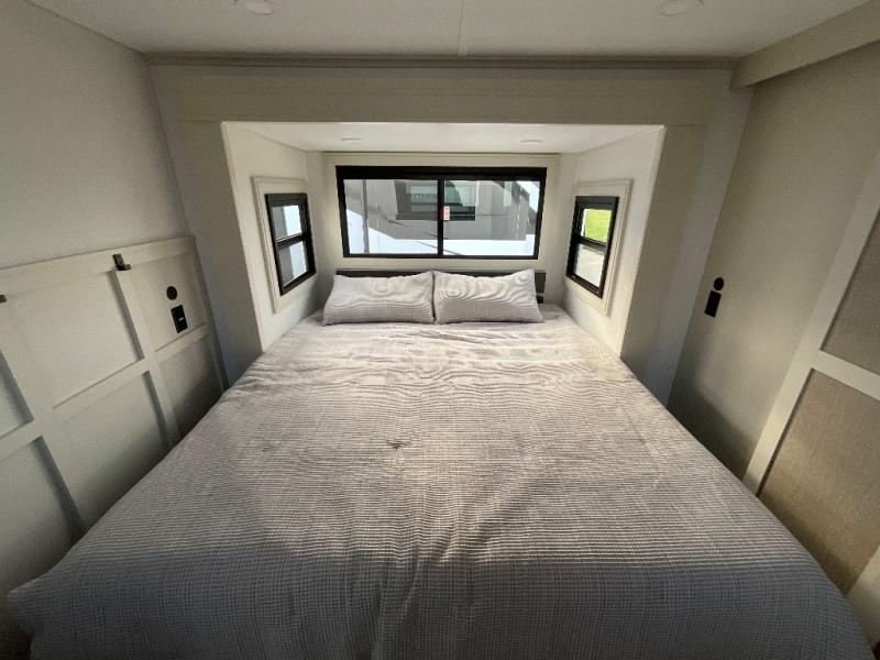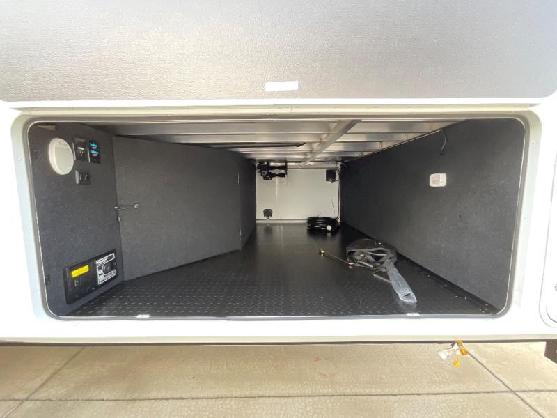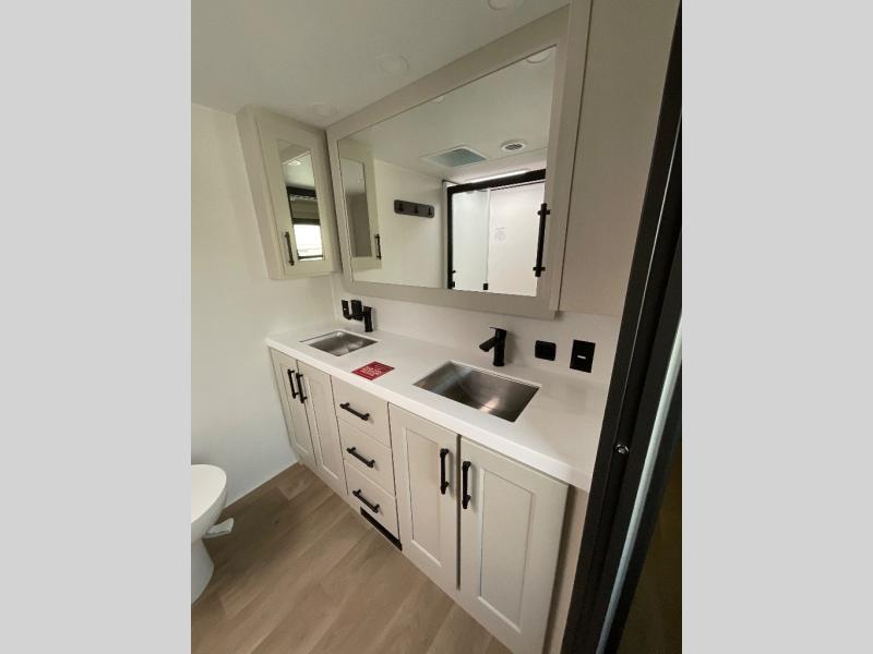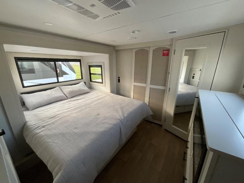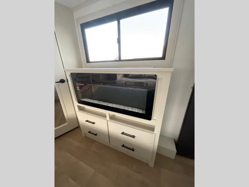 Are you looking to upgrade from a travel trailer to a fifth wheel? If so, this model will be perfect for you! Once you arrive at the campground, you can unload your gear from the pass-through storage, put out the two power awnings, then relax with a cold drink. Inside, you can kick your feet up on the theater seating, play a game at the free-standing dinette, or relax on the tri-fold sofa. The chef of your group will have a kitchen island with a Smart sink, dishwasher prep if you want the option to make cleaning up easier, plus a spacious 20 cu. ft. 12V refrigerator. There is also a built-in oven, plus a pantry and a hutch for storage galore! Having two bath sinks in the full bath is sure to be a big convenience when getting ready for bed, and the queen bed slide out in the front bedroom will provide a great night's rest. You will also find a front wardrobe, a slide top dresser, plus washer/dryer prep!