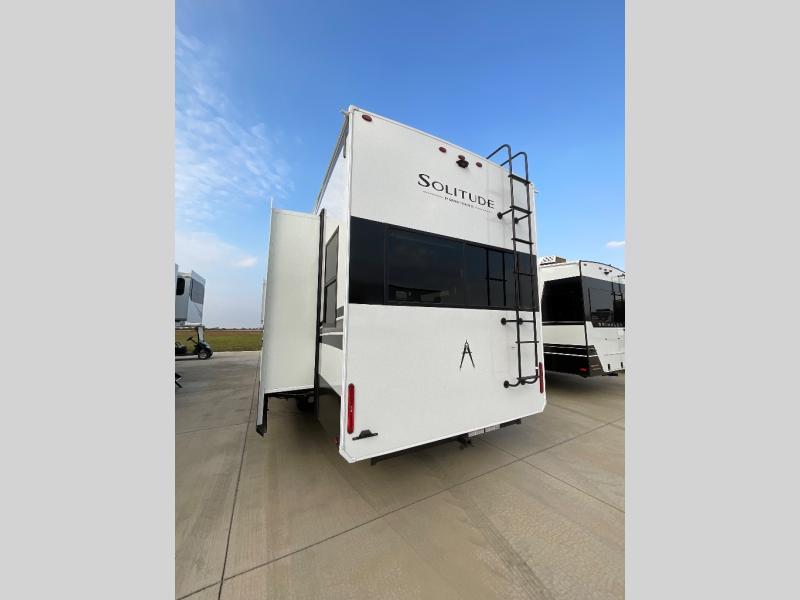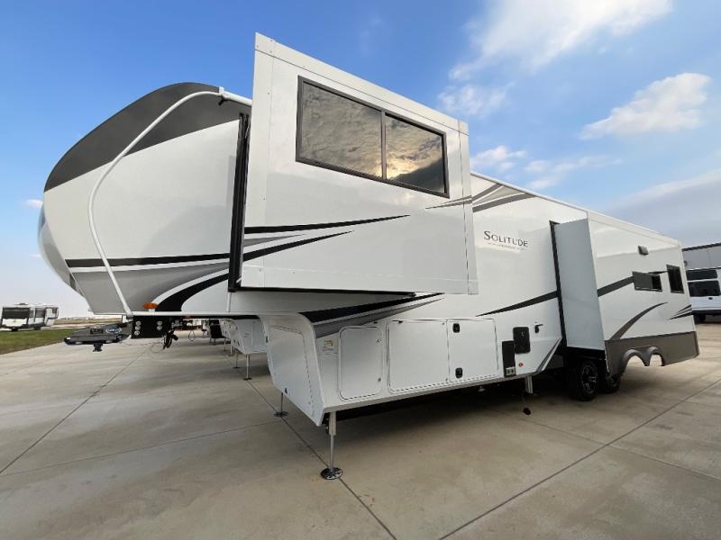 Each Solitude fifth wheel by Grand Design features a 101" wide-body construction, heavy duty 8,000 lb. axles, frameless tinted windows, and high-gloss gel coat sidewalls. You can camp year around thanks to the Weather-Tek Package that includes a 35K BTU high-capacity furnace, an all-in-one enclosed and heated utility center, and a fully enclosed underbelly with heated tanks and storage. Inside, you'll love the premium roller shades, hardwood cabinet doors, solid surface countertops, plus residential finishes throughout to make you truly feel at home. Each model also includes a MORryde CRE3000 suspension system, self adjusting brakes, and a MORryde pin box that will provide smooth towing from home to campground. Affordable luxury is possible with the Solitude fifth wheels; choose yours today!