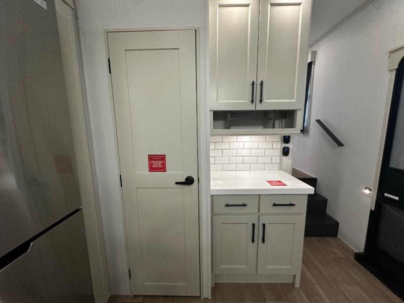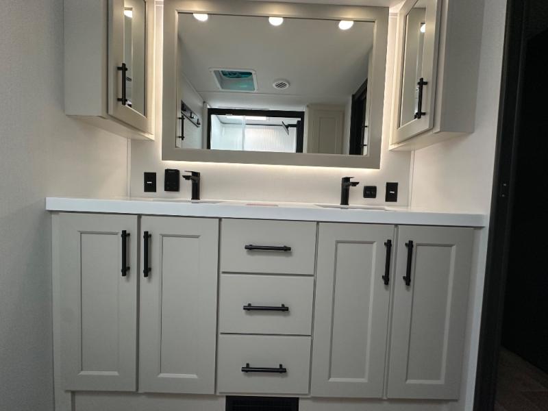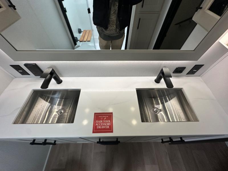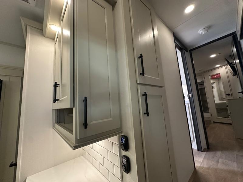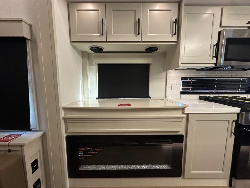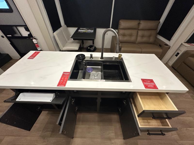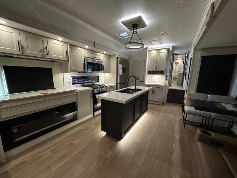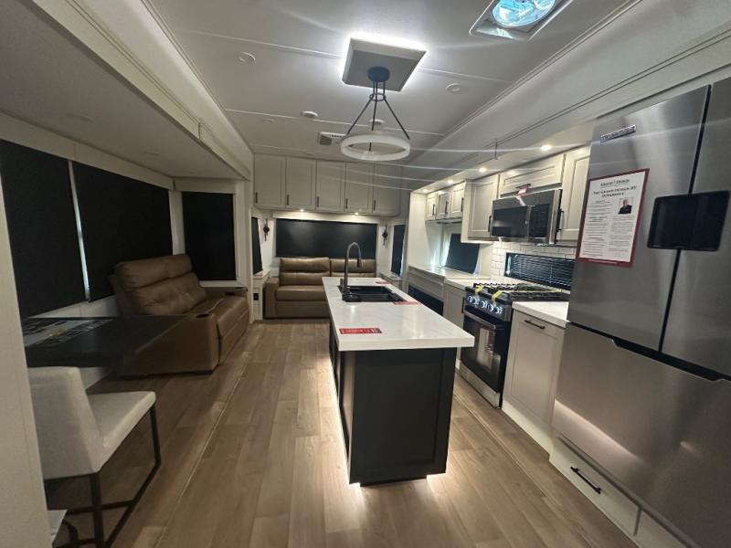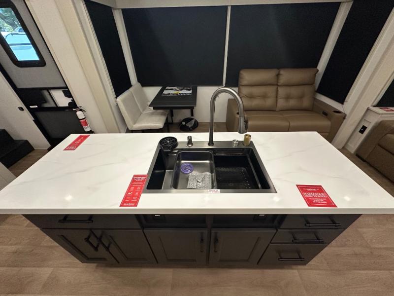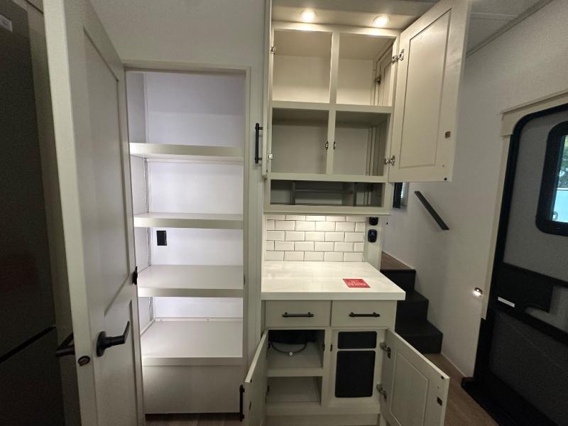 Are you looking to upgrade from a travel trailer to a fifth wheel? If so, this model will be perfect for you! Once you arrive at the campground, you can unload your gear from the pass-through storage, put out the two power awnings, then relax with a cold drink. Inside, you can kick your feet up on the theater seating, play a game at the free-standing dinette, or relax on the tri-fold sofa. The chef of your group will have a kitchen island with a Smart sink, dishwasher prep if you want the option to make cleaning up easier, plus a spacious 20 cu. ft. 12V refrigerator. There is also a built-in oven, plus a pantry and a hutch for storage galore! Having two bath sinks in the full bath is sure to be a big convenience when getting ready for bed, and the queen bed slide out in the front bedroom will provide a great night's rest. You will also find a front wardrobe, a slide top dresser, plus washer/dryer prep!