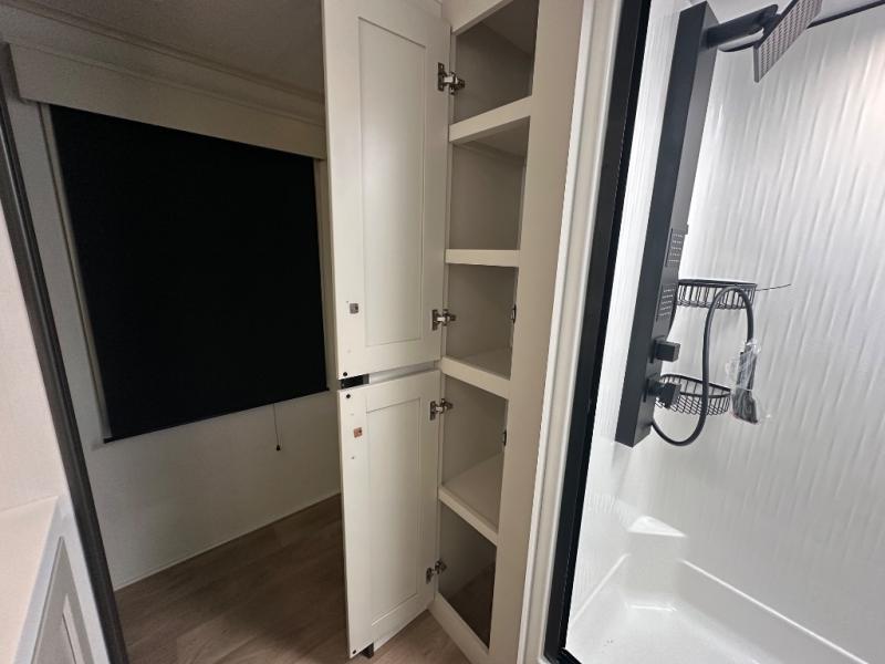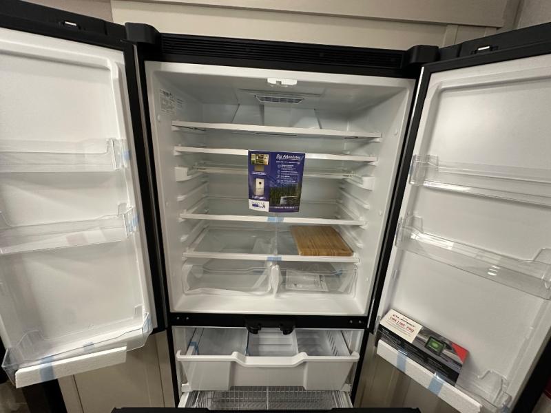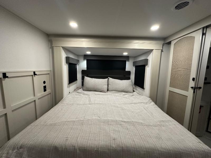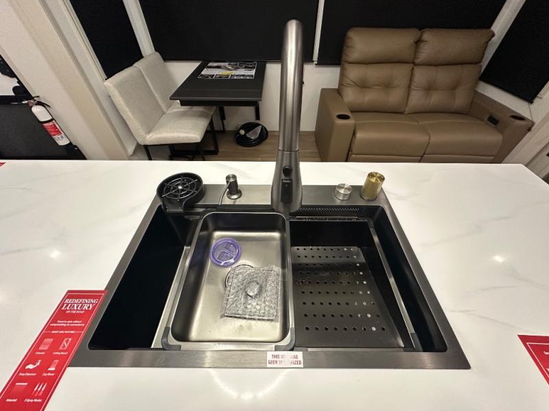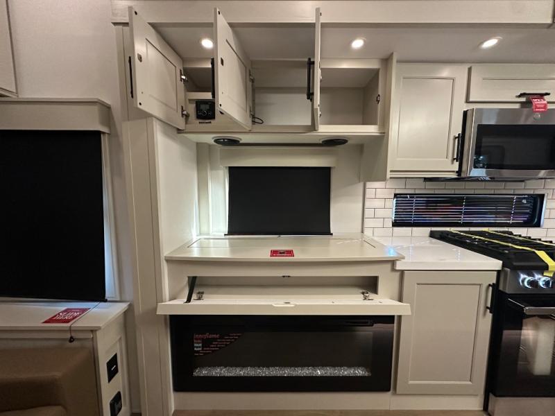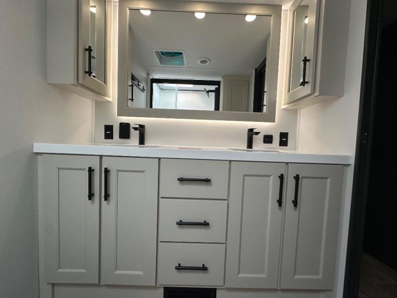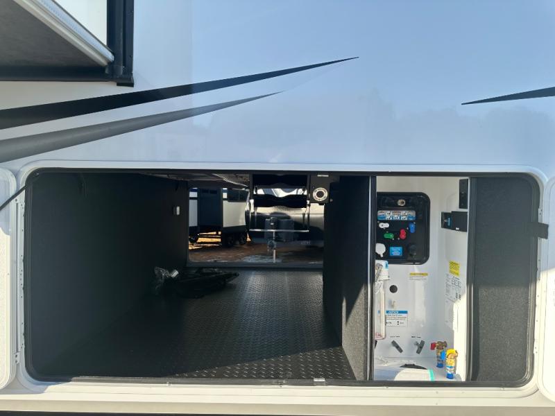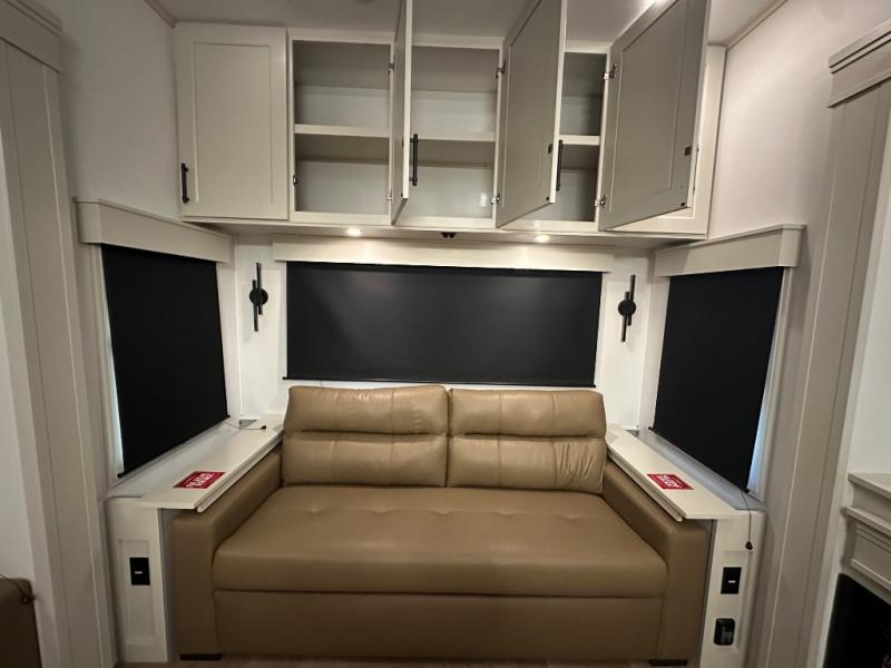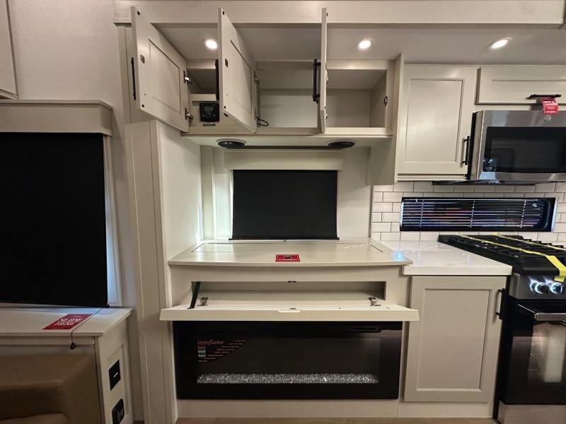 Are you looking to upgrade from a travel trailer to a fifth wheel? If so, this model will be perfect for you! Once you arrive at the campground, you can unload your gear from the pass-through storage, put out the two power awnings, then relax with a cold drink. Inside, you can kick your feet up on the theater seating, play a game at the free-standing dinette, or relax on the tri-fold sofa. The chef of your group will have a kitchen island with a Smart sink, dishwasher prep if you want the option to make cleaning up easier, plus a spacious 20 cu. ft. 12V refrigerator. There is also a built-in oven, plus a pantry and a hutch for storage galore! Having two bath sinks in the full bath is sure to be a big convenience when getting ready for bed, and the queen bed slide out in the front bedroom will provide a great night's rest. You will also find a front wardrobe, a slide top dresser, plus washer/dryer prep!