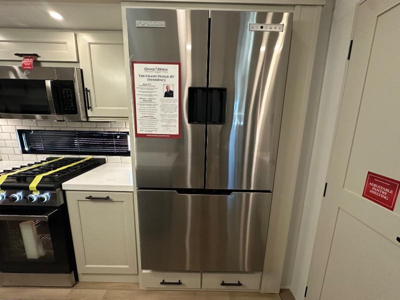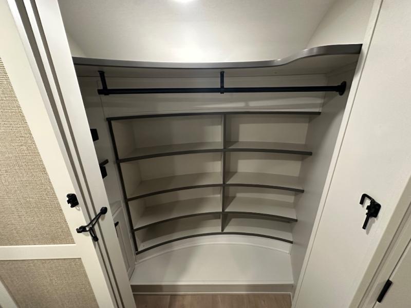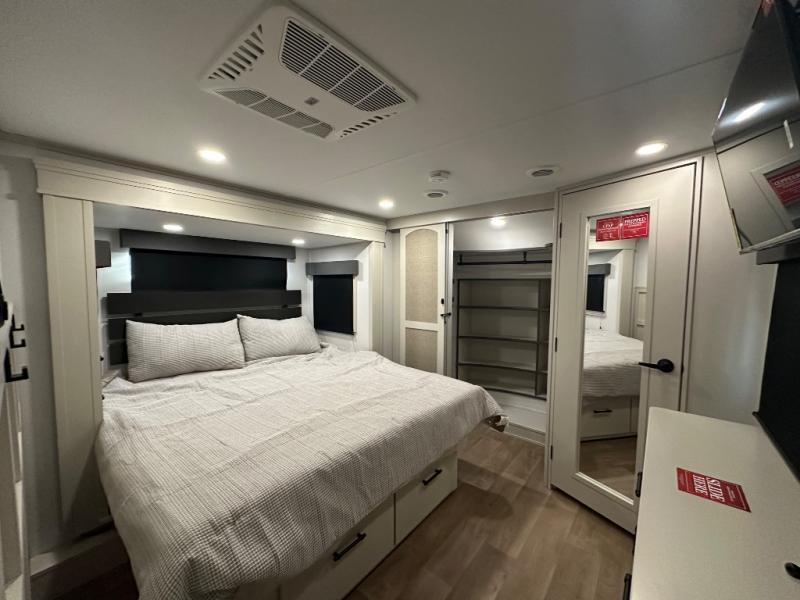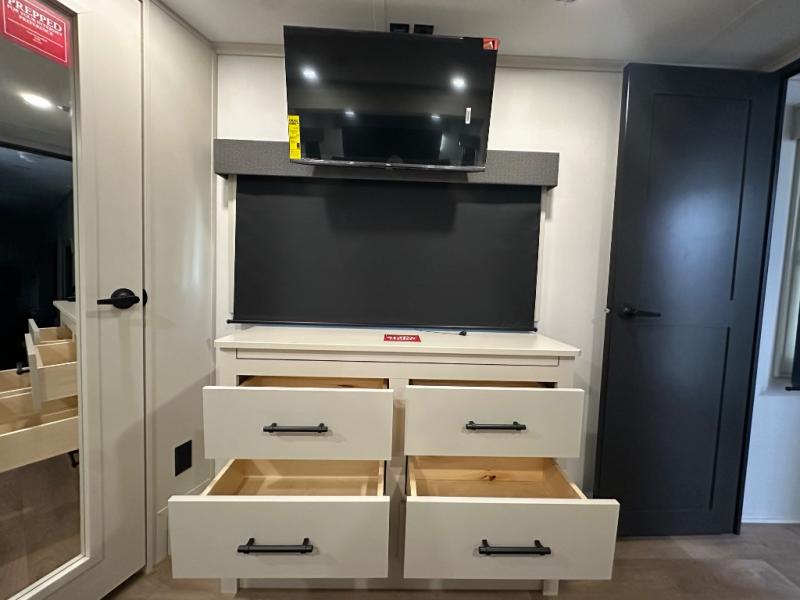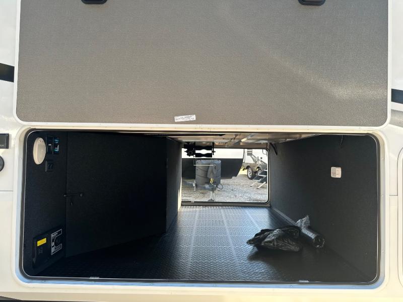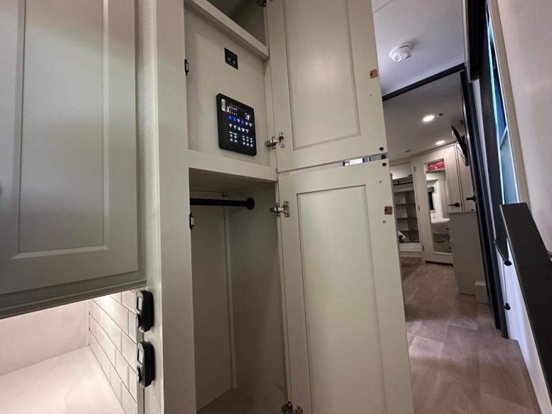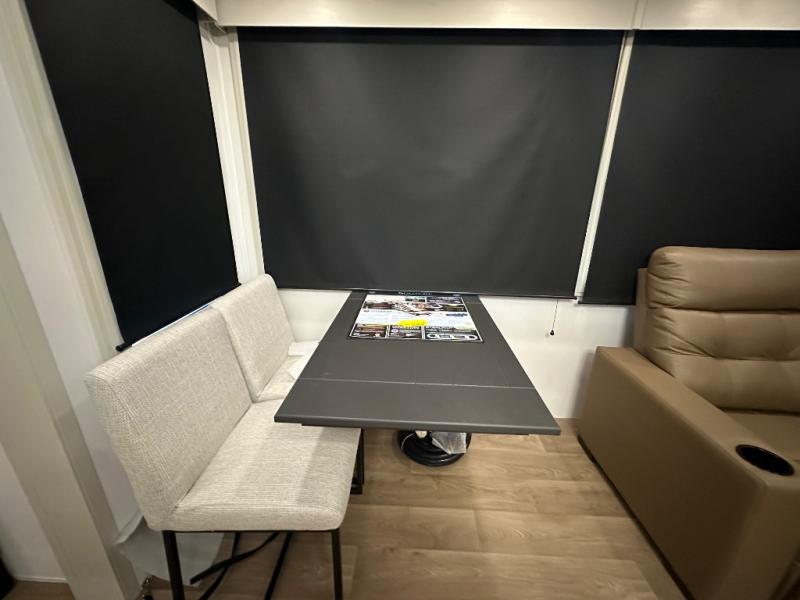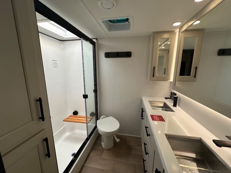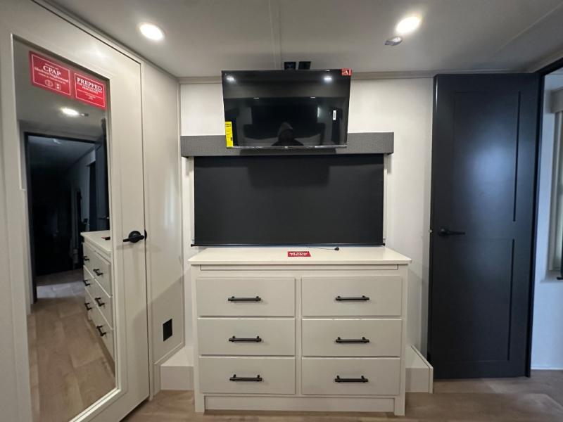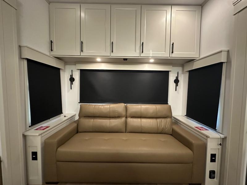 Are you looking to upgrade from a travel trailer to a fifth wheel? If so, this model will be perfect for you! Once you arrive at the campground, you can unload your gear from the pass-through storage, put out the two power awnings, then relax with a cold drink. Inside, you can kick your feet up on the theater seating, play a game at the free-standing dinette, or relax on the tri-fold sofa. The chef of your group will have a kitchen island with a Smart sink, dishwasher prep if you want the option to make cleaning up easier, plus a spacious 20 cu. ft. 12V refrigerator. There is also a built-in oven, plus a pantry and a hutch for storage galore! Having two bath sinks in the full bath is sure to be a big convenience when getting ready for bed, and the queen bed slide out in the front bedroom will provide a great night's rest. You will also find a front wardrobe, a slide top dresser, plus washer/dryer prep!