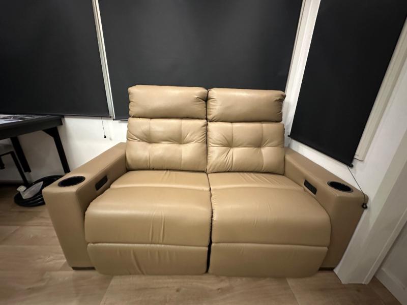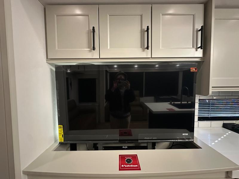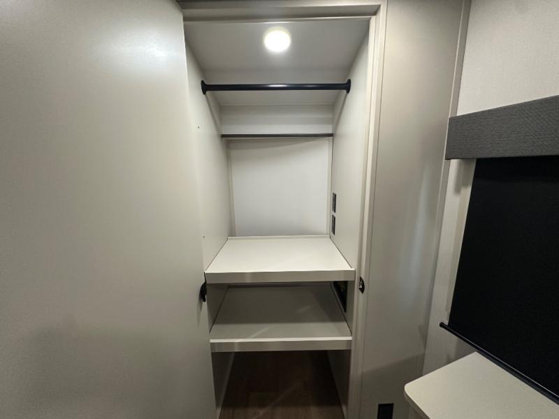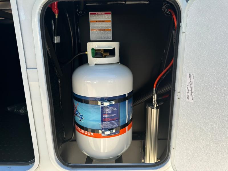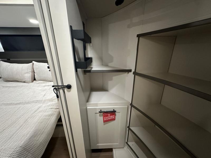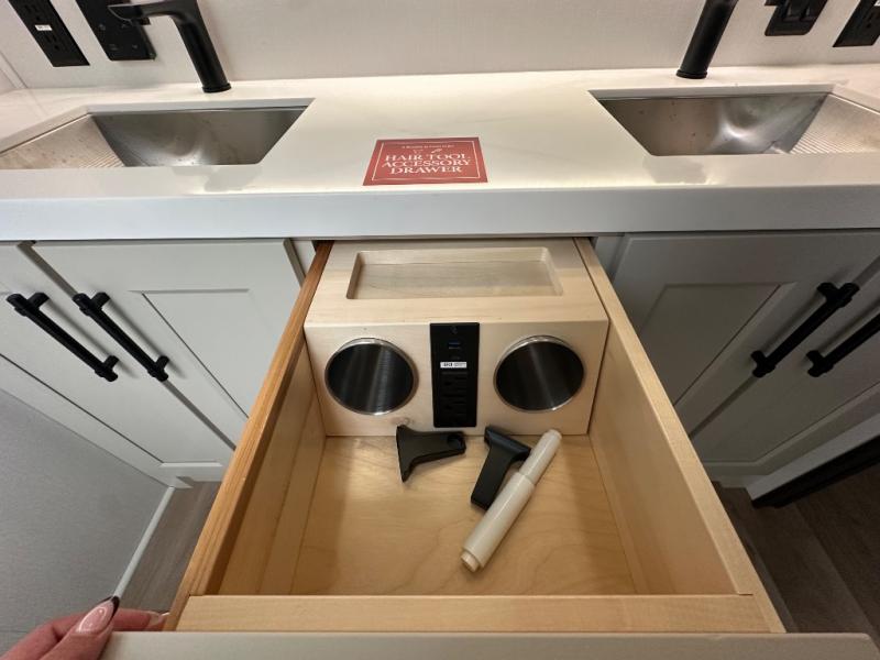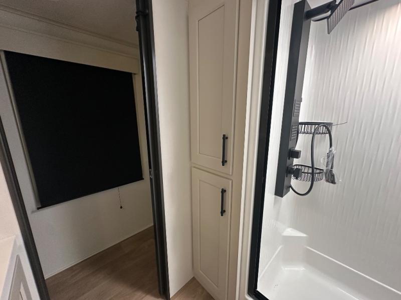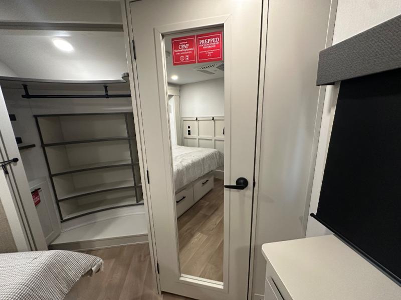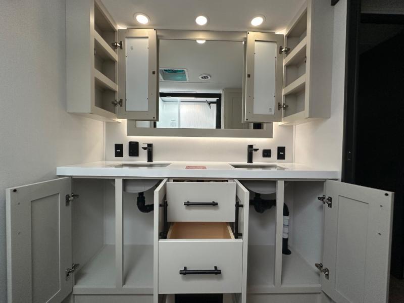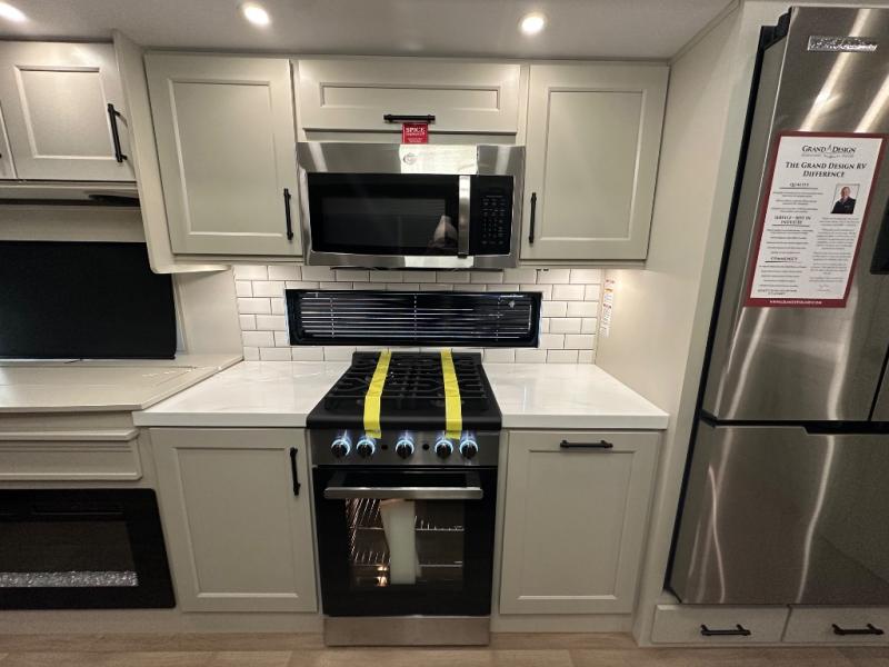 Are you looking to upgrade from a travel trailer to a fifth wheel? If so, this model will be perfect for you! Once you arrive at the campground, you can unload your gear from the pass-through storage, put out the two power awnings, then relax with a cold drink. Inside, you can kick your feet up on the theater seating, play a game at the free-standing dinette, or relax on the tri-fold sofa. The chef of your group will have a kitchen island with a Smart sink, dishwasher prep if you want the option to make cleaning up easier, plus a spacious 20 cu. ft. 12V refrigerator. There is also a built-in oven, plus a pantry and a hutch for storage galore! Having two bath sinks in the full bath is sure to be a big convenience when getting ready for bed, and the queen bed slide out in the front bedroom will provide a great night's rest. You will also find a front wardrobe, a slide top dresser, plus washer/dryer prep!