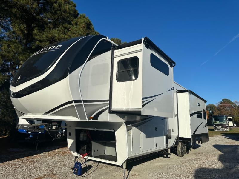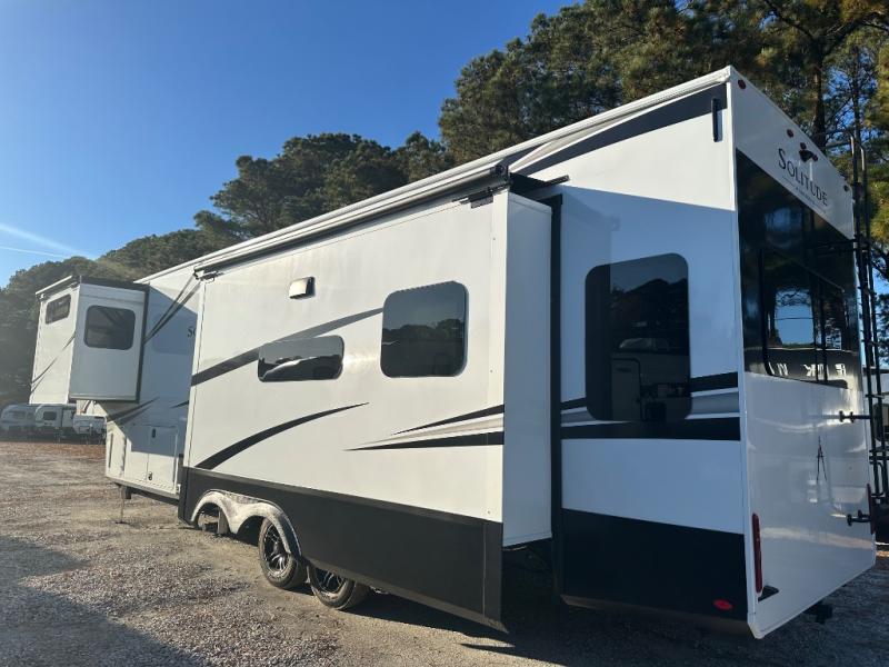 Each Solitude fifth wheel by Grand Design features a 101" wide-body construction, heavy duty 8,000 lb. axles, frameless tinted windows, and high-gloss gel coat sidewalls. You can camp year around thanks to the Weather-Tek Package that includes a 35K BTU high-capacity furnace, an all-in-one enclosed and heated utility center, and a fully enclosed underbelly with heated tanks and storage. Inside, you'll love the premium roller shades, hardwood cabinet doors, solid surface countertops, plus residential finishes throughout to make you truly feel at home. Each model also includes a MORryde CRE3000 suspension system, self adjusting brakes, and a MORryde pin box that will provide smooth towing from home to campground. Affordable luxury is possible with the Solitude fifth wheels; choose yours today!