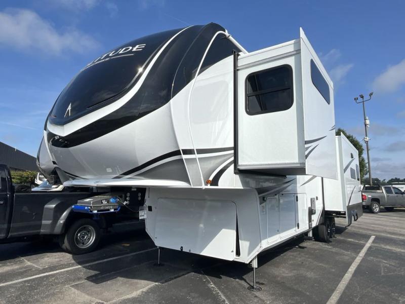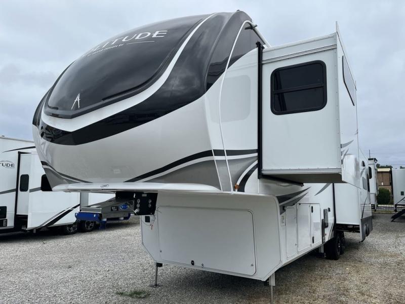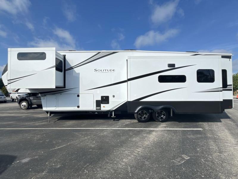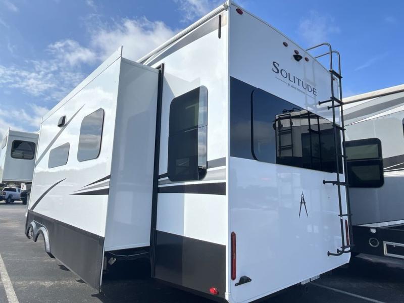 Each Solitude fifth wheel by Grand Design features a 101" wide-body construction, heavy duty 8,000 lb. axles, frameless tinted windows, and high-gloss gel coat sidewalls. You can camp year around thanks to the Weather-Tek Package that includes a 35K BTU high-capacity furnace, an all-in-one enclosed and heated utility center, and a fully enclosed underbelly with heated tanks and storage. Inside, you'll love the premium roller shades, hardwood cabinet doors, solid surface countertops, plus residential finishes throughout to make you truly feel at home. Each model also includes a MORryde CRE3000 suspension system, self adjusting brakes, and a MORryde pin box that will provide smooth towing from home to campground. Affordable luxury is possible with the Solitude fifth wheels; choose yours today!