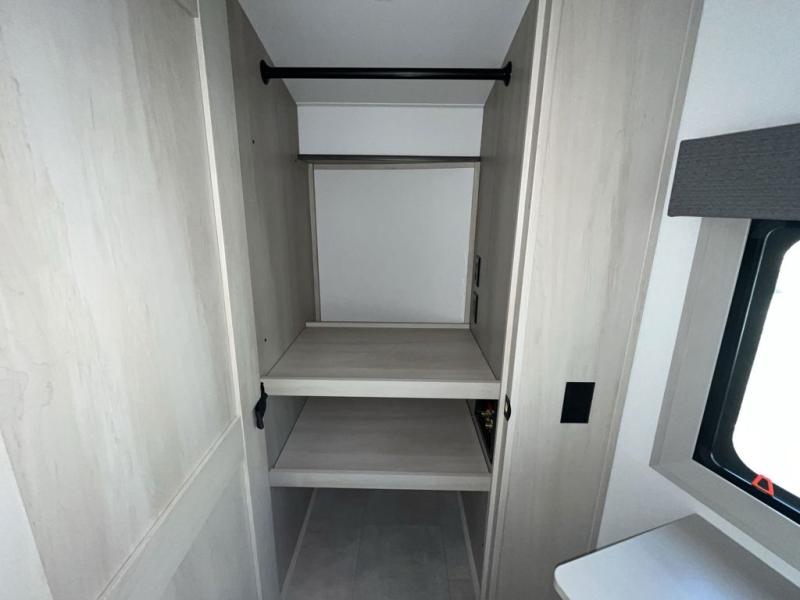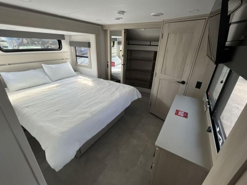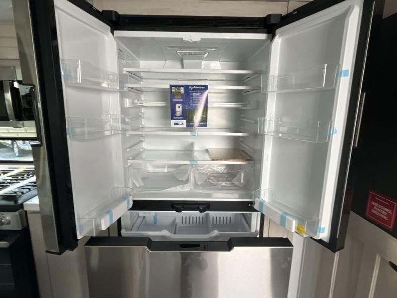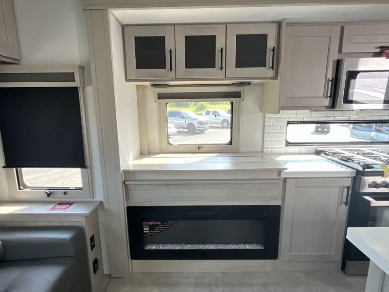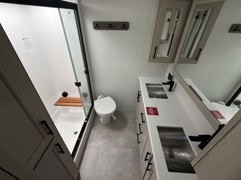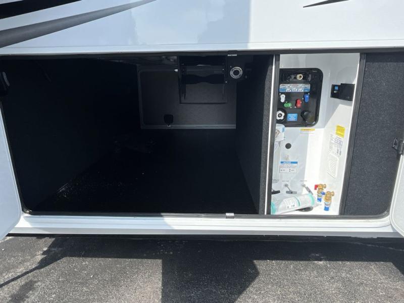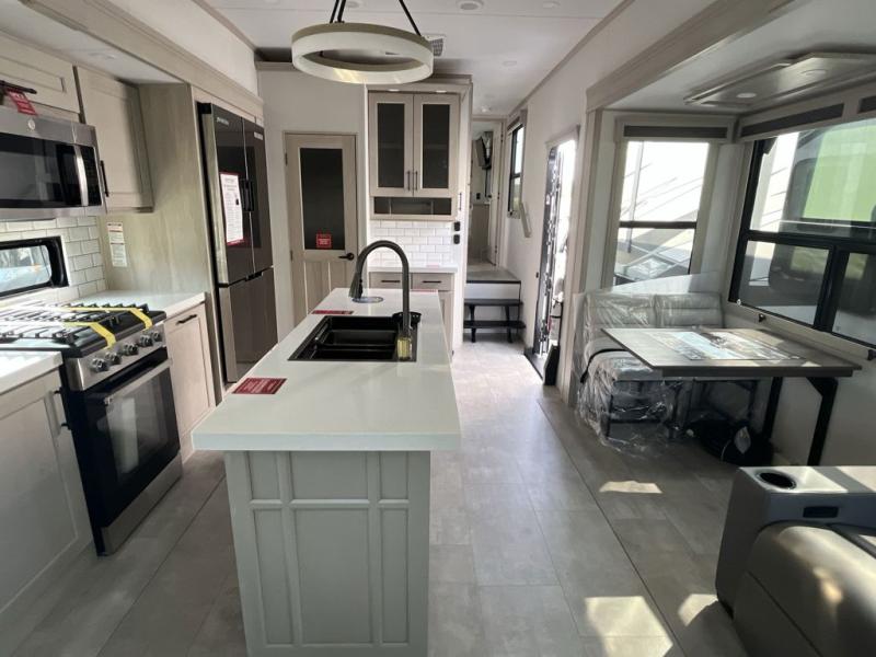 Are you looking to upgrade from a travel trailer to a fifth wheel? If so, this model will be perfect for you! Once you arrive at the campground, you can unload your gear from the pass-through storage, put out the two power awnings, then relax with a cold drink. Inside, you can kick your feet up on the theater seating, play a game at the free-standing dinette, or relax on the tri-fold sofa. The chef of your group will have a kitchen island with a Smart sink, dishwasher prep if you want the option to make cleaning up easier, plus a spacious 20 cu. ft. 12V refrigerator. There is also a built-in oven, plus a pantry and a hutch for storage galore! Having two bath sinks in the full bath is sure to be a big convenience when getting ready for bed, and the queen bed slide out in the front bedroom will provide a great night's rest. You will also find a front wardrobe, a slide top dresser, plus washer/dryer prep!