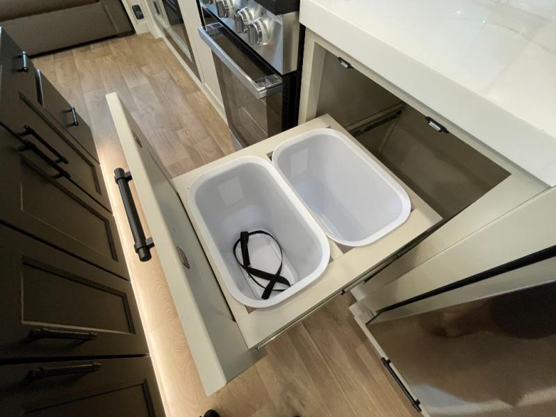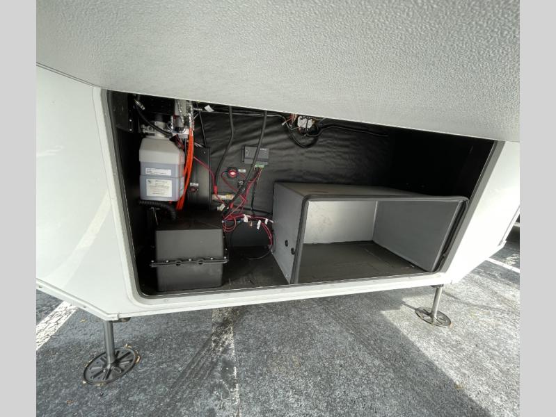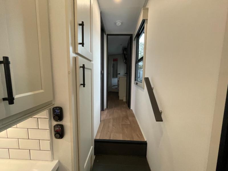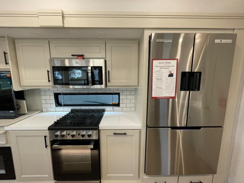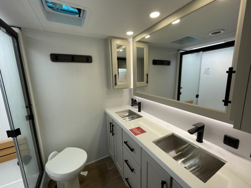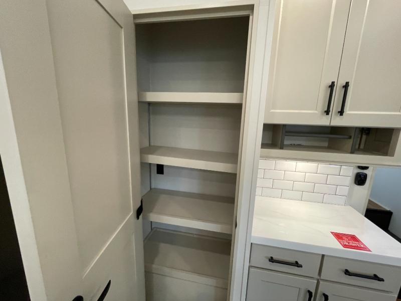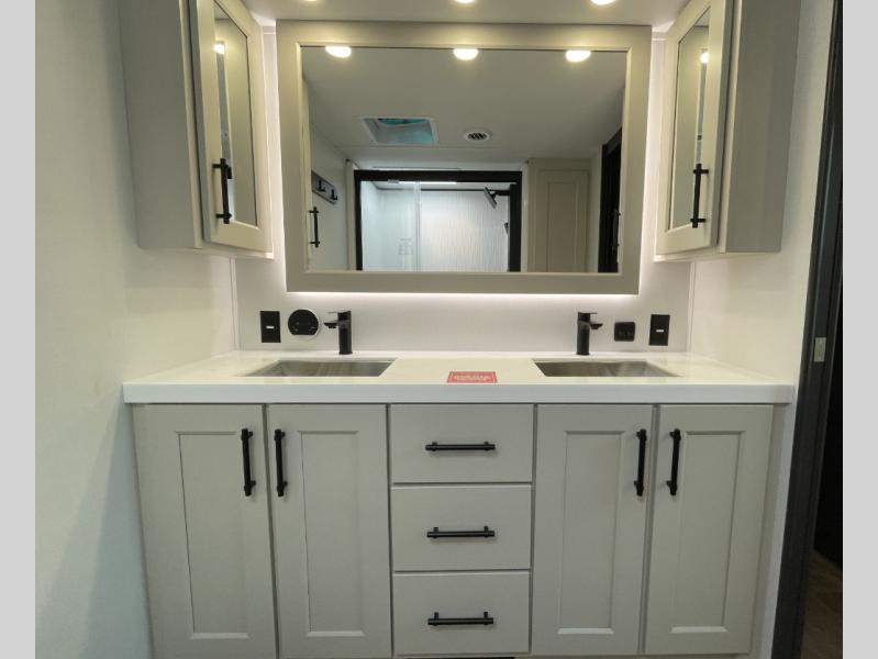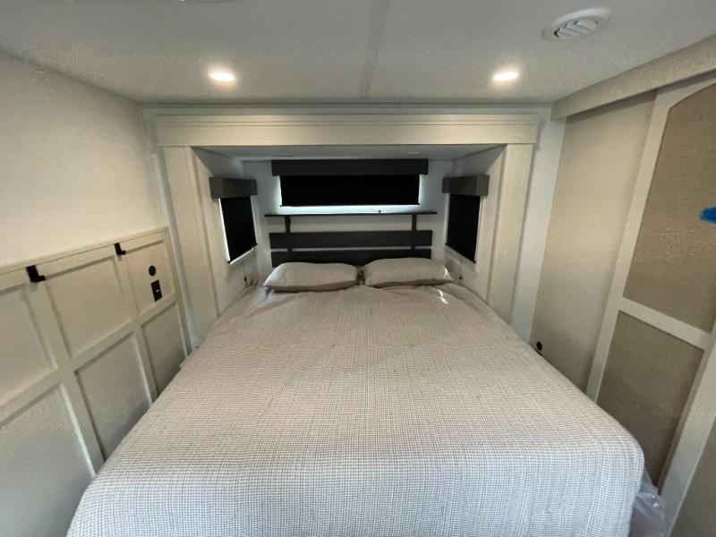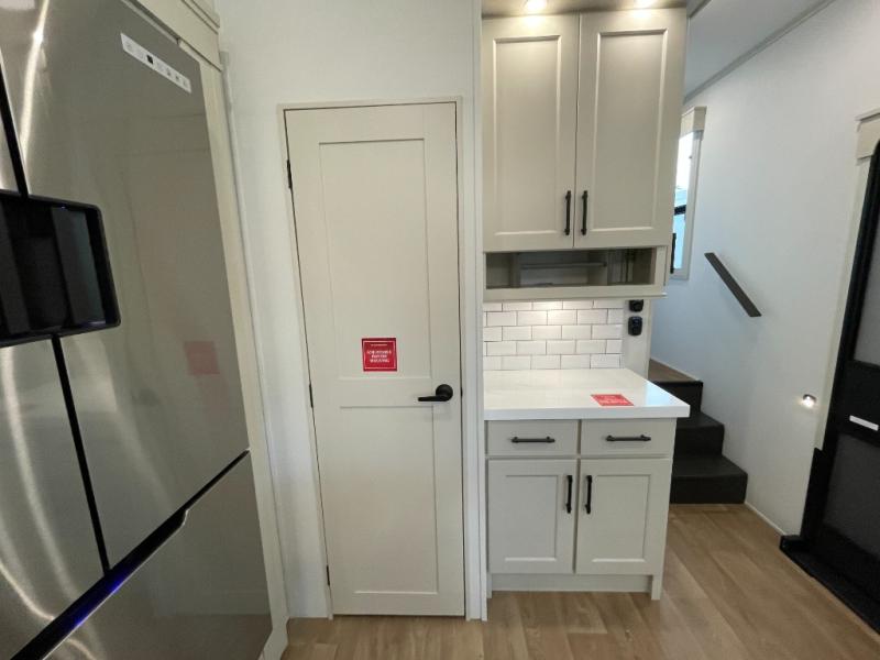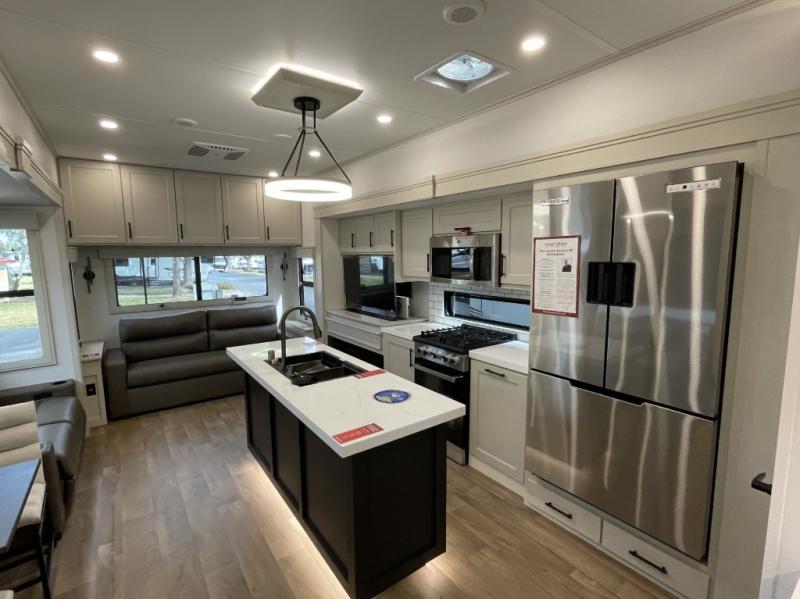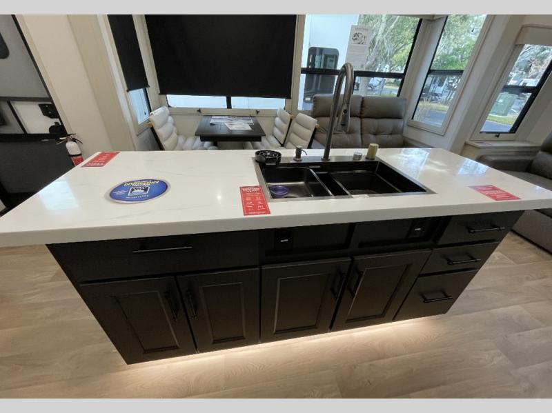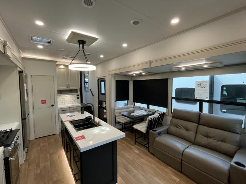 Are you looking to upgrade from a travel trailer to a fifth wheel? If so, this model will be perfect for you! Once you arrive at the campground, you can unload your gear from the pass-through storage, put out the two power awnings, then relax with a cold drink. Inside, you can kick your feet up on the theater seating, play a game at the free-standing dinette, or relax on the tri-fold sofa. The chef of your group will have a kitchen island with a Smart sink, dishwasher prep if you want the option to make cleaning up easier, plus a spacious 20 cu. ft. 12V refrigerator. There is also a built-in oven, plus a pantry and a hutch for storage galore! Having two bath sinks in the full bath is sure to be a big convenience when getting ready for bed, and the queen bed slide out in the front bedroom will provide a great night's rest. You will also find a front wardrobe, a slide top dresser, plus washer/dryer prep!