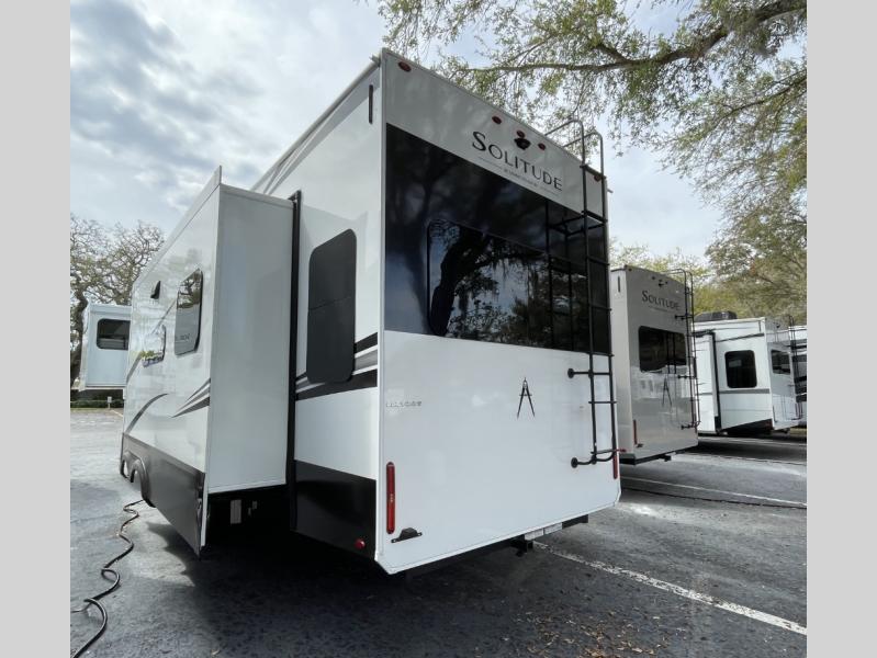 Each Solitude fifth wheel by Grand Design features a 101" wide-body construction, heavy duty 8,000 lb. axles, frameless tinted windows, and high-gloss gel coat sidewalls. You can camp year around thanks to the Weather-Tek Package that includes a 35K BTU high-capacity furnace, an all-in-one enclosed and heated utility center, and a fully enclosed underbelly with heated tanks and storage. Inside, you'll love the premium roller shades, hardwood cabinet doors, solid surface countertops, plus residential finishes throughout to make you truly feel at home. Each model also includes a MORryde CRE3000 suspension system, self adjusting brakes, and a MORryde pin box that will provide smooth towing from home to campground. Affordable luxury is possible with the Solitude fifth wheels; choose yours today!