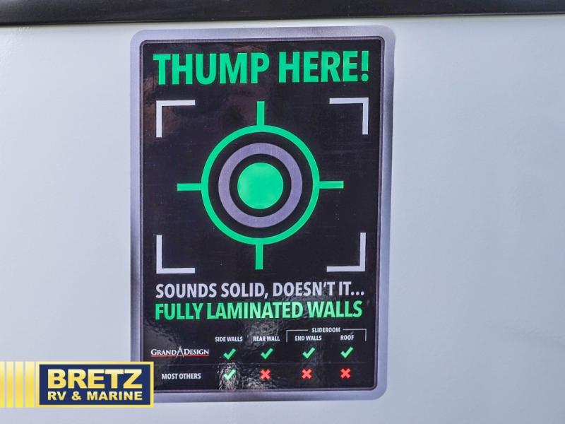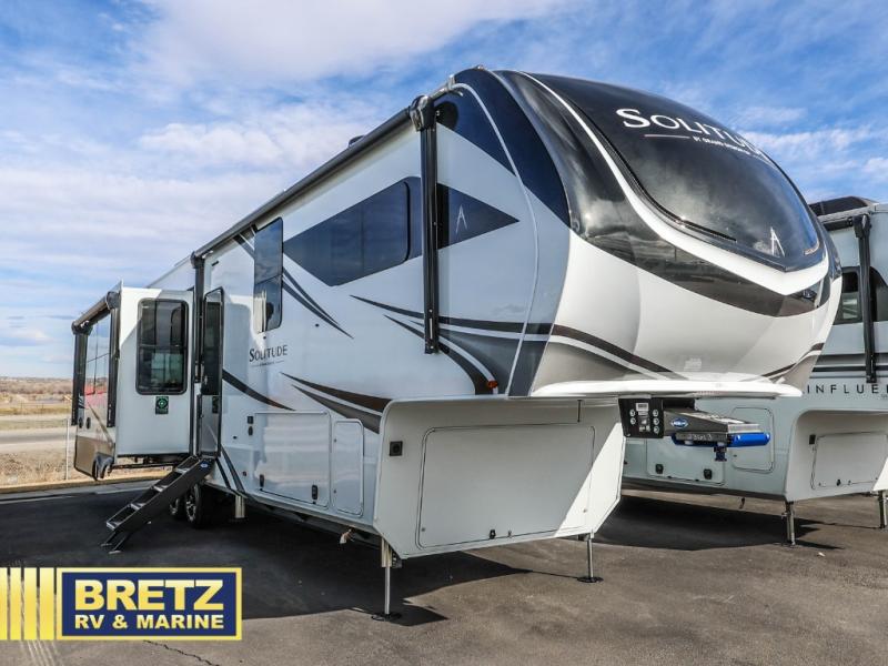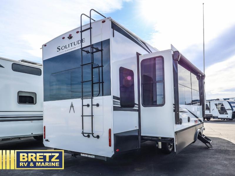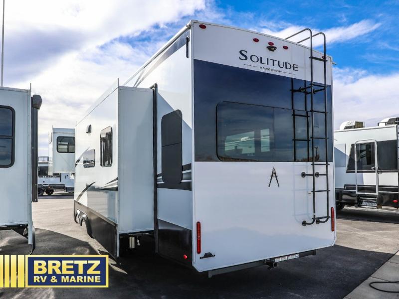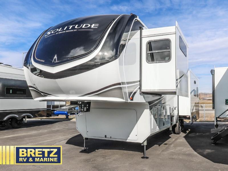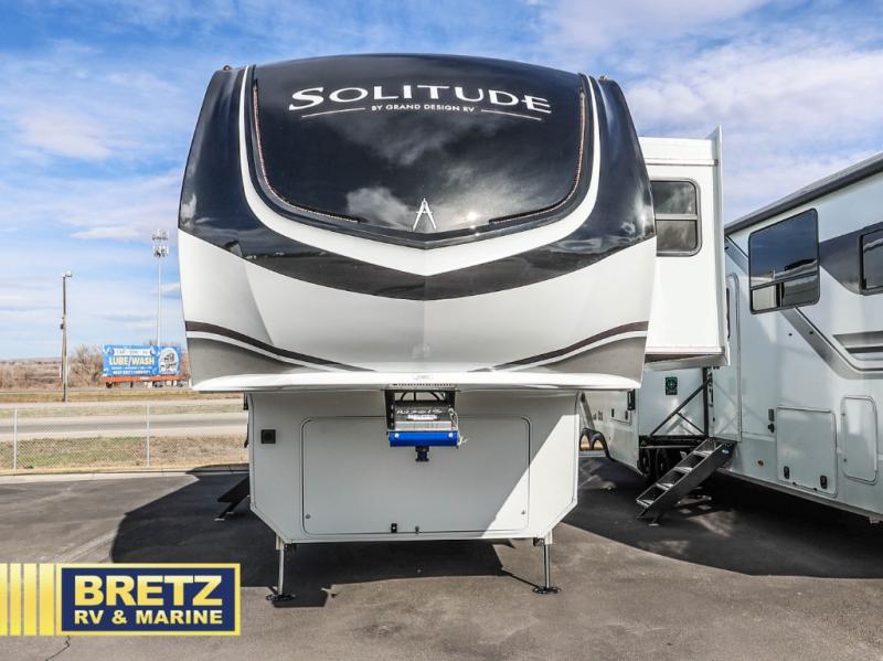 Each Solitude fifth wheel by Grand Design features a 101" wide-body construction, heavy duty 8,000 lb. axles, frameless tinted windows, and high-gloss gel coat sidewalls. You can camp during harsh weather thanks to the Weather-Tek Package that includes a 35K BTU high-capacity furnace, an all-in-one enclosed and heated utility center, and a fully enclosed underbelly with heated tanks and storage. Inside, you'll love the premium roller shades, hardwood cabinet doors, solid surface countertops, plus residential finishes throughout to make you truly feel at home. Each model also includes a MORryde CRE3000 suspension system, and a MORryde pin box that will provide smooth towing from home to campground. Affordable luxury is possible with the Solitude fifth wheels; choose yours today!