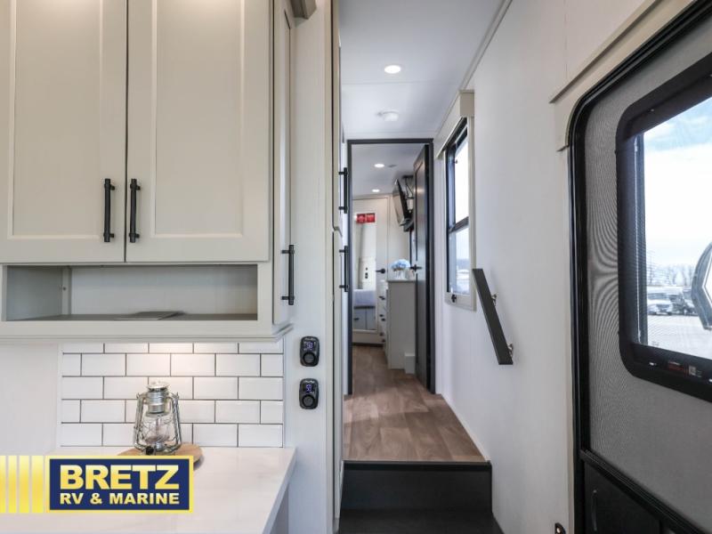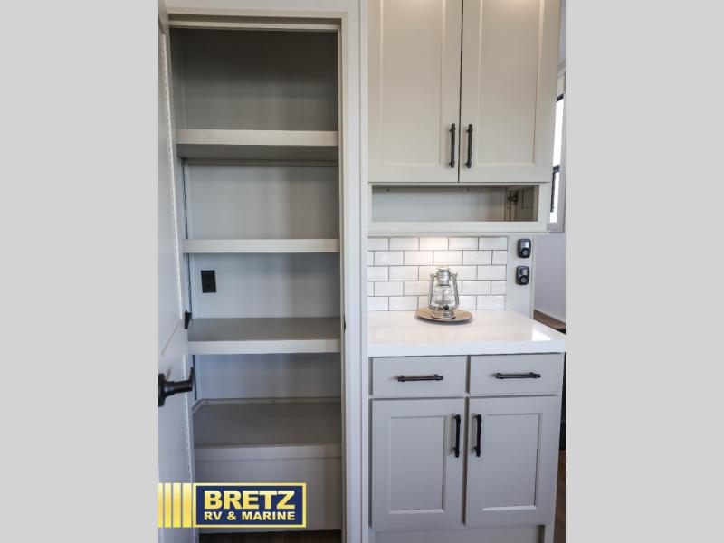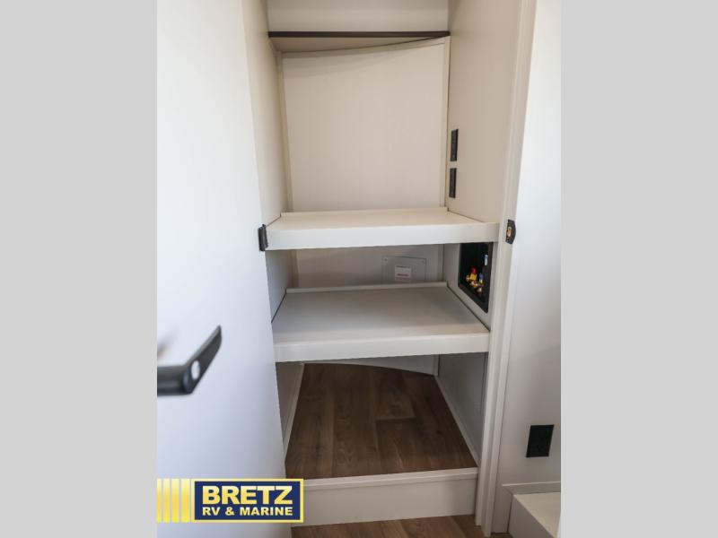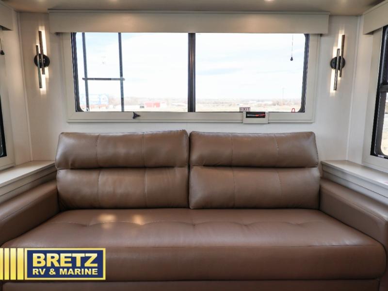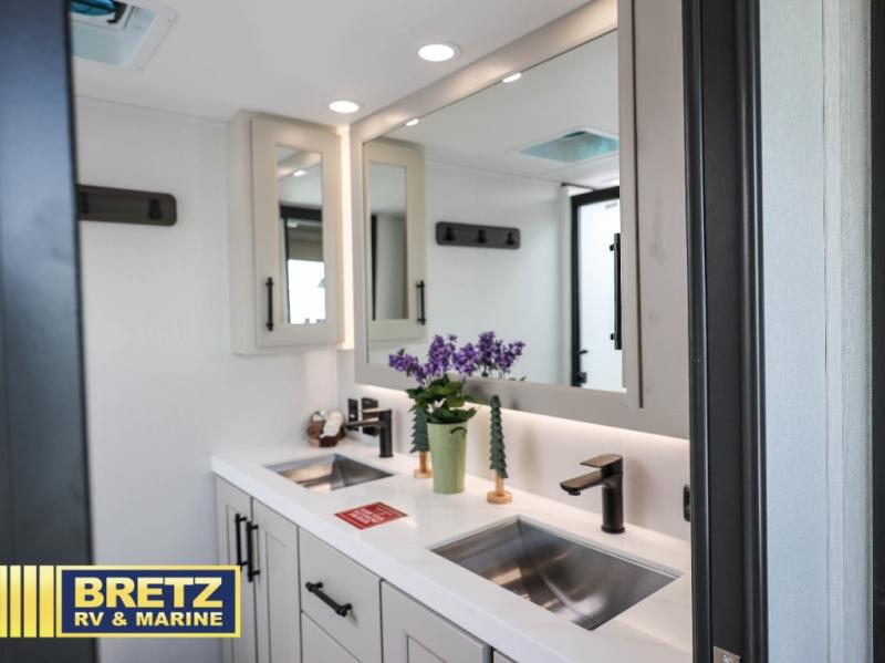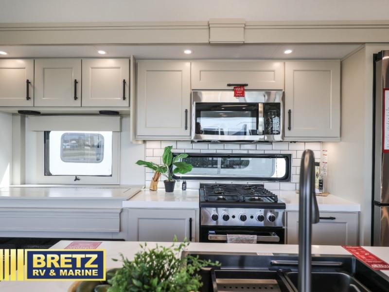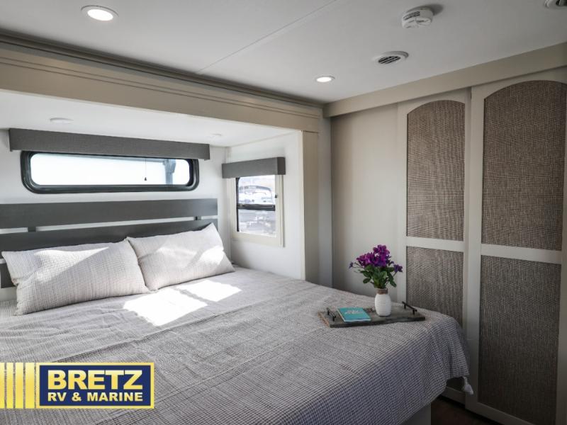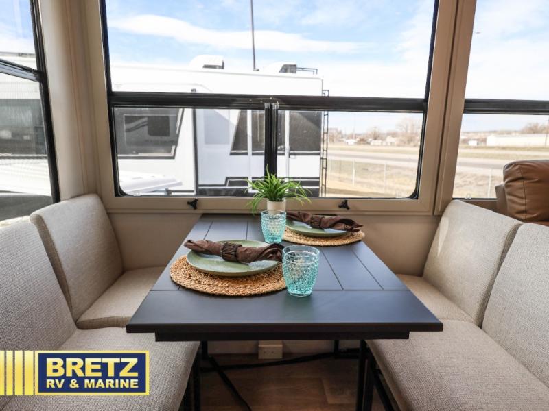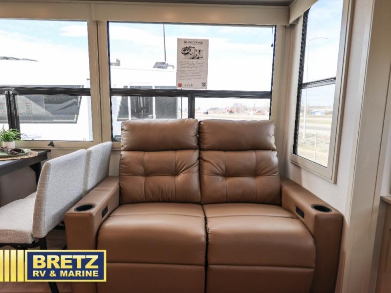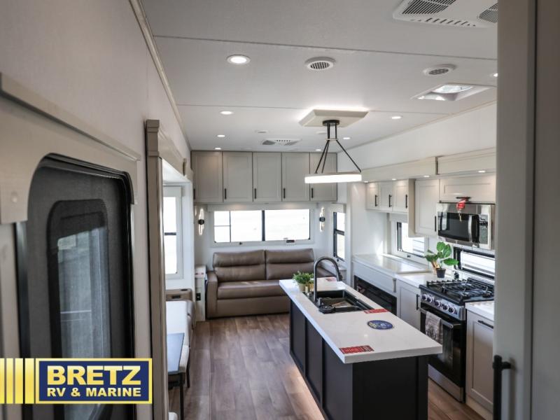Are you looking to upgrade from a travel trailer to a fifth wheel? If so, this model will be perfect for you! Once you arrive at the campground, you can unload your gear from the pass-through storage, put out the two power awnings, then relax with a cold drink. Inside, you can kick your feet up on the theater seating, play a game at the free-standing dinette, or relax on the tri-fold sofa. The chef of your group will have a kitchen island with a Smart sink, dishwasher prep if you want the option to make cleaning up easier, plus a spacious 20 cu. ft. refrigerator. There is also a built-in oven, plus a pantry for storage galore! Having two bath sinks in the full bath is sure to be a big convenience when getting ready for bed, and the queen bed slide out in the front bedroom will provide a great night's rest. You will also find a front wardrobe, a slide top dresser, plus washer/dryer prep!