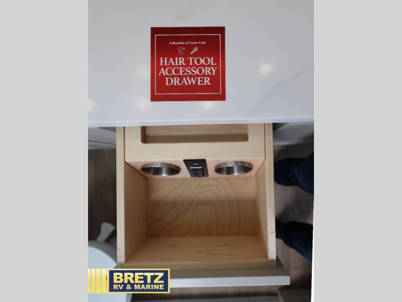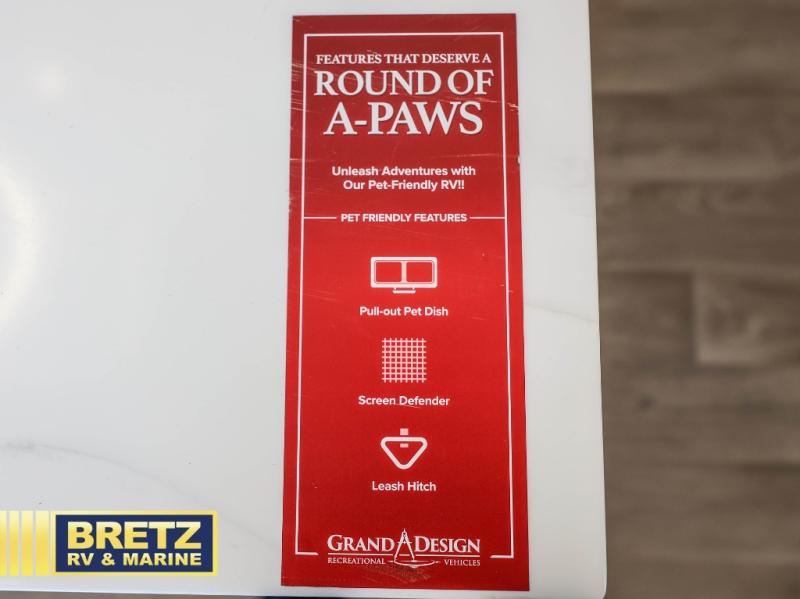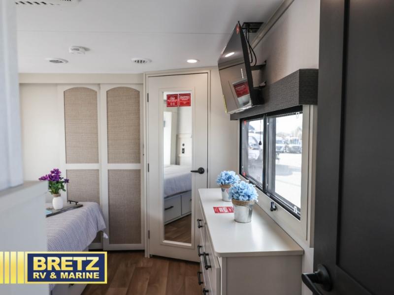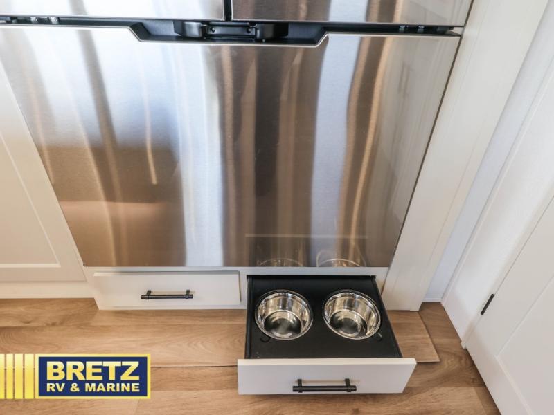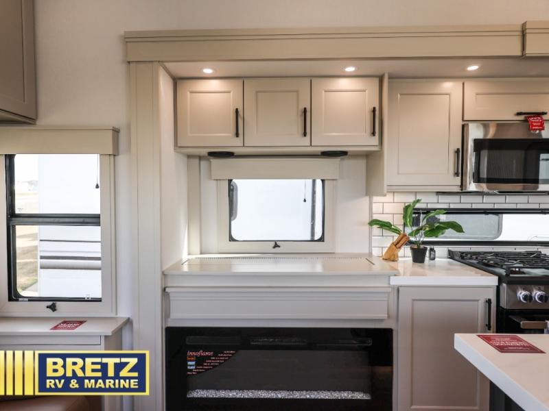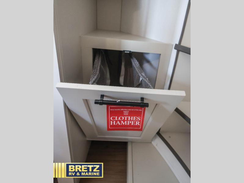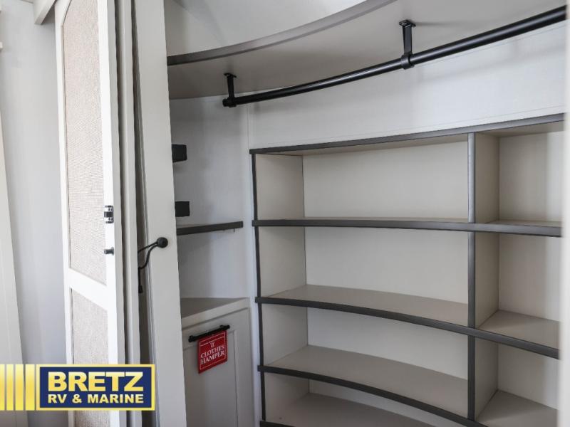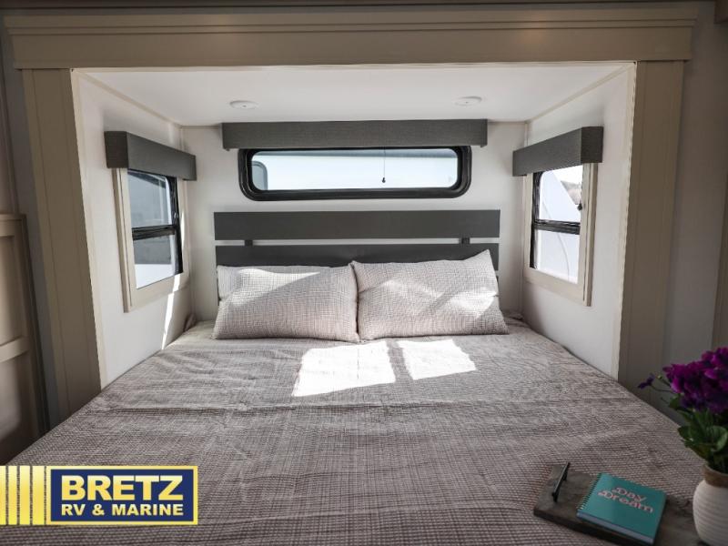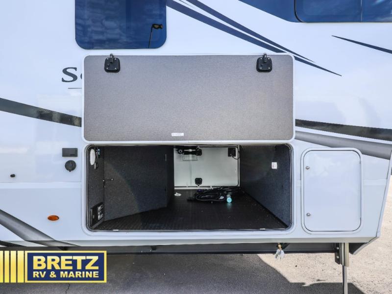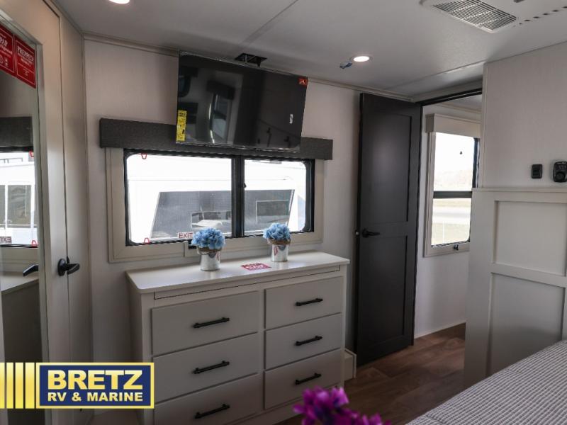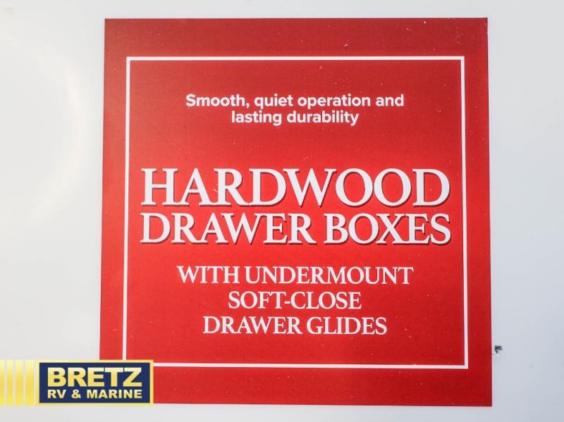 Are you looking to upgrade from a travel trailer to a fifth wheel? If so, this model will be perfect for you! Once you arrive at the campground, you can unload your gear from the pass-through storage, put out the two power awnings, then relax with a cold drink. Inside, you can kick your feet up on the theater seating, play a game at the free-standing dinette, or relax on the tri-fold sofa. The chef of your group will have a kitchen island with a Smart sink, dishwasher prep if you want the option to make cleaning up easier, plus a spacious 20 cu. ft. refrigerator. There is also a built-in oven, plus a pantry for storage galore! Having two bath sinks in the full bath is sure to be a big convenience when getting ready for bed, and the queen bed slide out in the front bedroom will provide a great night's rest. You will also find a front wardrobe, a slide top dresser, plus washer/dryer prep!