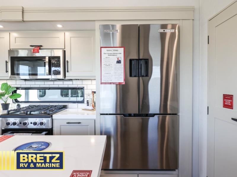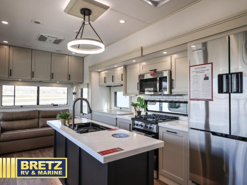 Luxury fifth wheel with residential comforts, spacious design, and premium features for extended travel.
