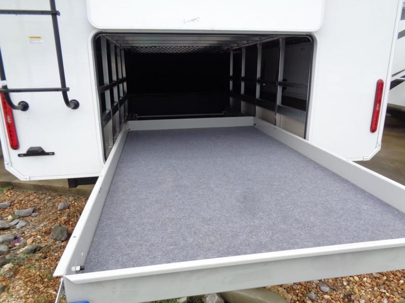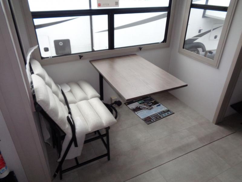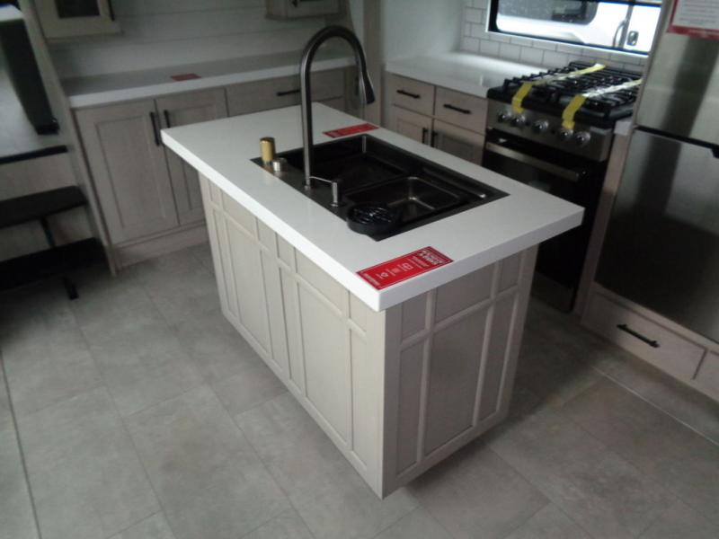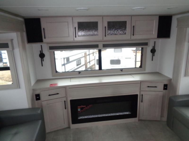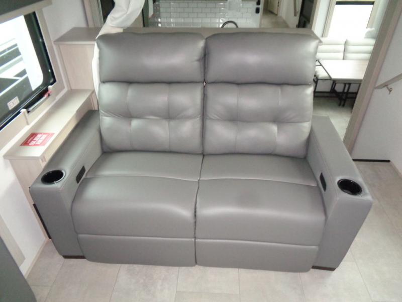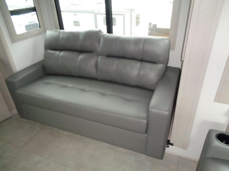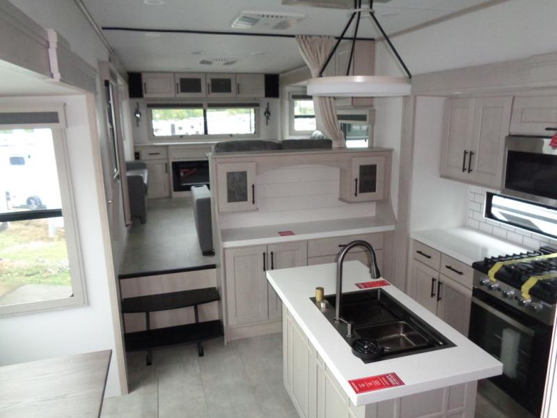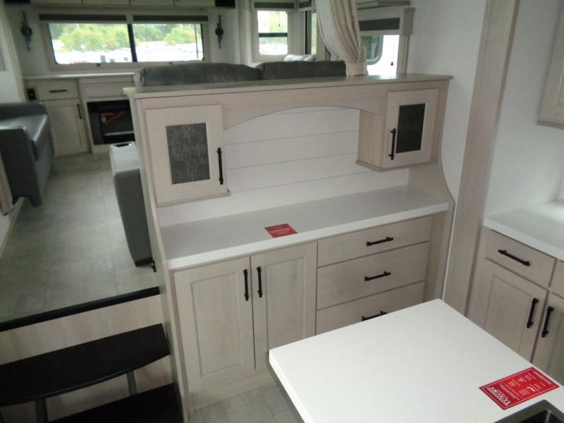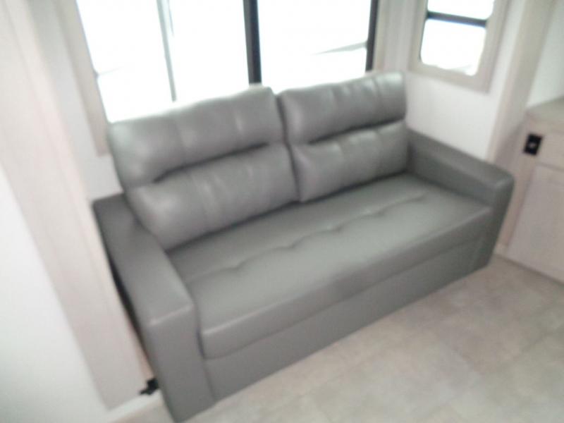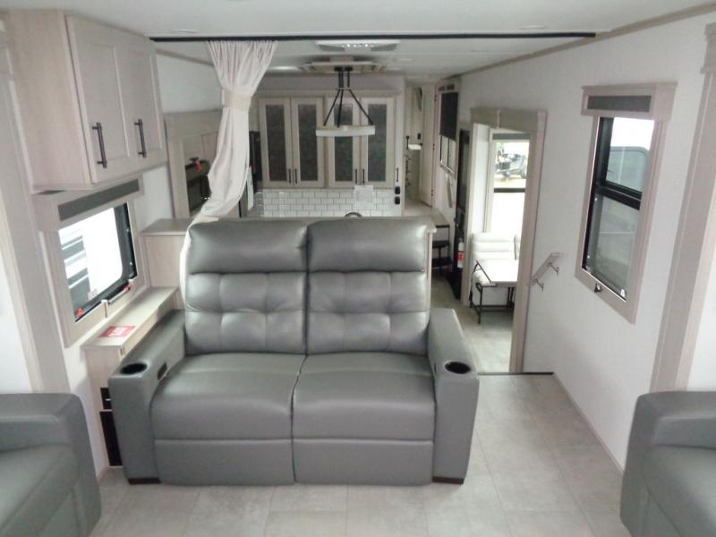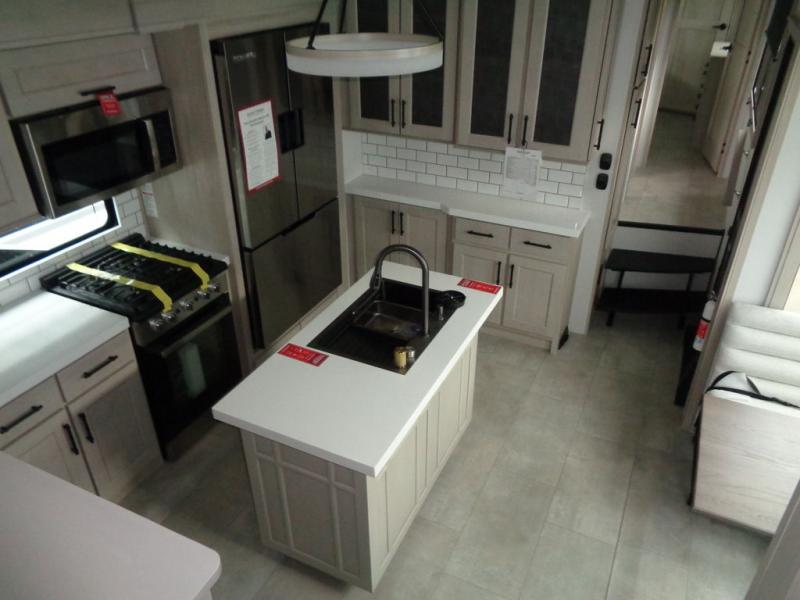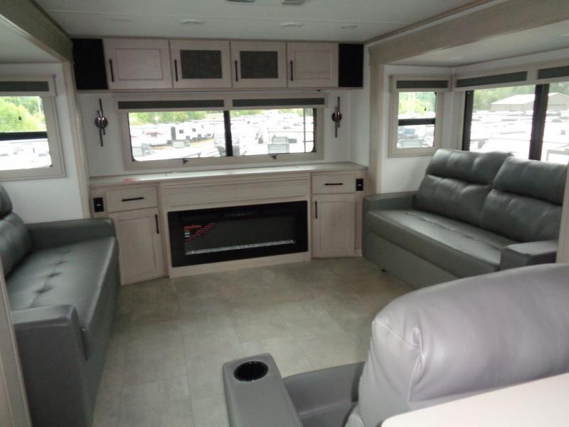 Each minute spent in this spacious fifth wheel will feel just like home! The rear living area includes a rear entertainment center with an LED Smart TV and a fireplace, overhead cabinets, theater seating, plus two tri-fold sofas for your guests to sleep on. You will have the front private bedroom all to yourselves with a queen bed slide out that can be switched out for an optional king bed, and the front closet provides all the space you need to store your belongings. This model includes a spacious full bath plus dual bath sinks for ultimate convenience. The chef of your group will love the middle kitchen with its convenient island including double sinks, a residential cooktop and built-in oven, 20 cu. ft. refrigerator, and free-standing dinette. Head outdoors to find a 16' power awning with LED lights and middle pass through along with rear storage including a sliding tray, and you might want to add the optional pull-out kitchen.