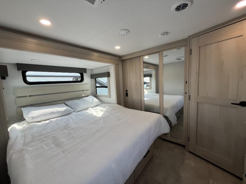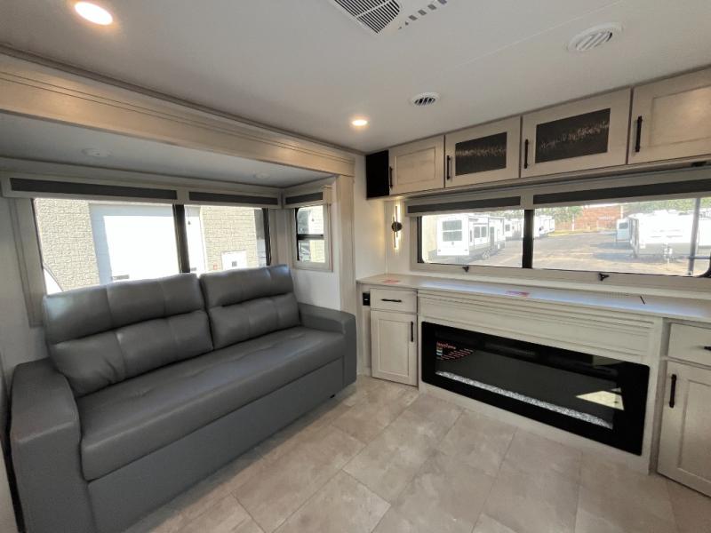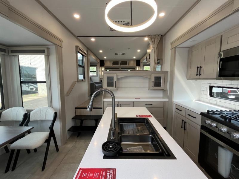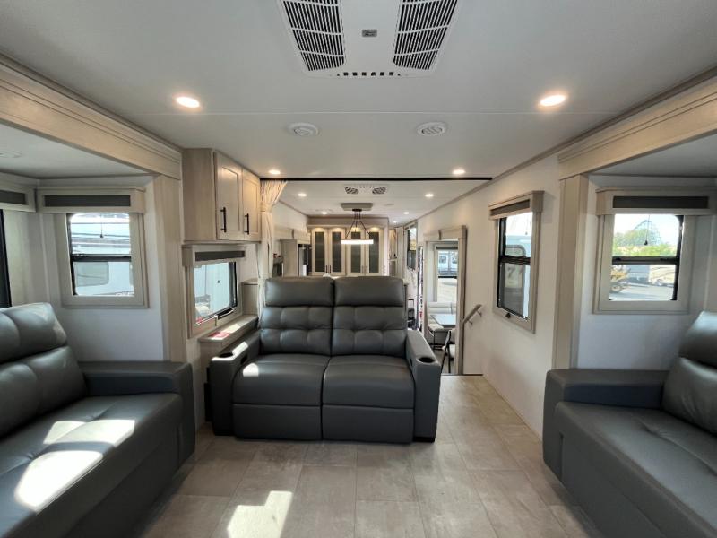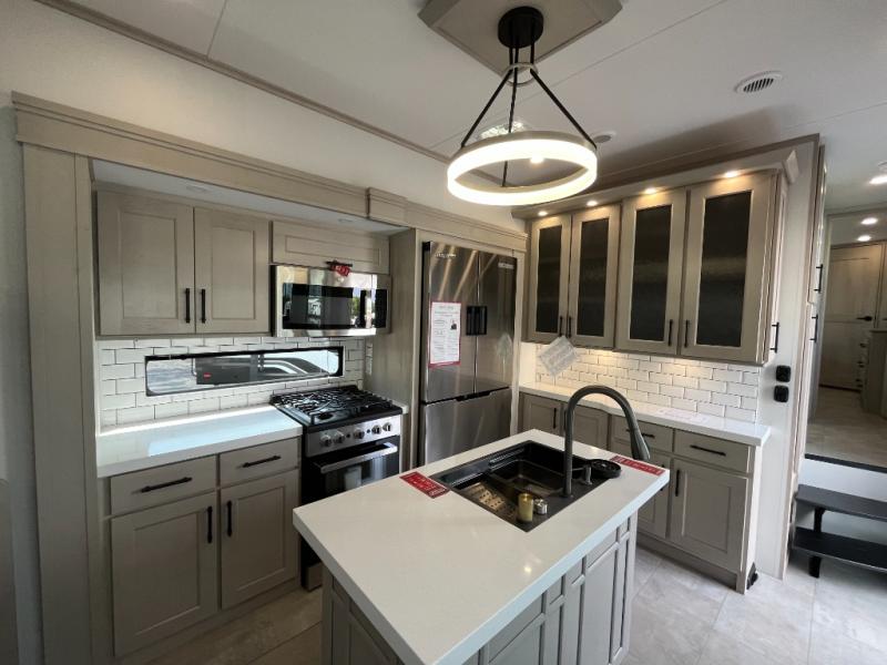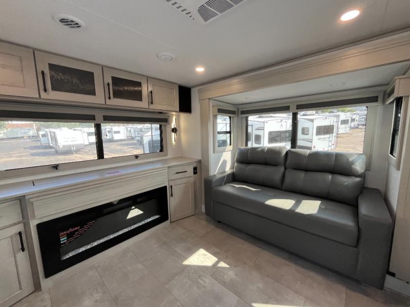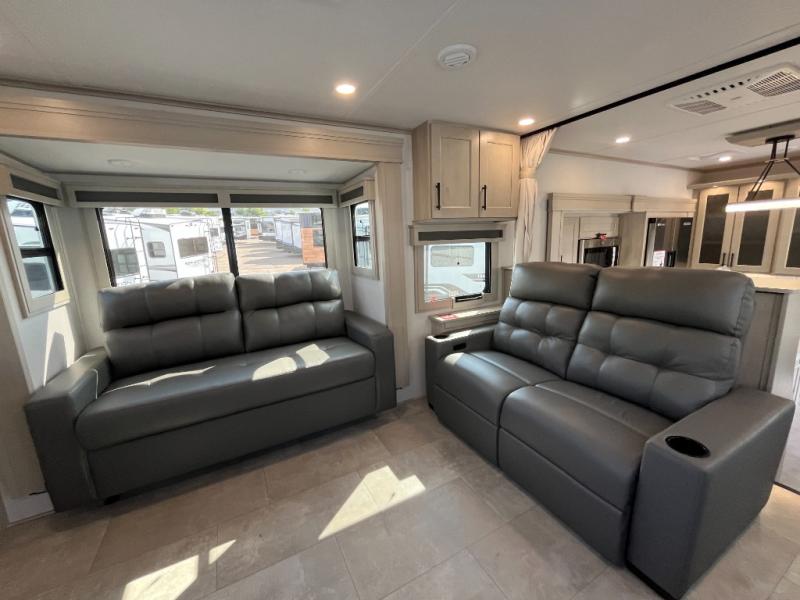 Each minute spent in this spacious fifth wheel will feel just like home! The rear living area includes a rear entertainment center with an LED Smart TV and a fireplace, overhead cabinets, theater seating, plus two tri-fold sofas for your guests to sleep on. You will have the front private bedroom all to yourselves with a queen bed slide out that can be switched out for an optional king bed, and the front closet provides all the space you need to store your belongings. This model includes a spacious full bath plus dual bath sinks for ultimate convenience. The chef of your group will love the middle kitchen with its convenient island including double sinks, a residential cooktop and built-in oven, 20 cu. ft. refrigerator, and free-standing dinette. Head outdoors to find a 16' power awning with LED lights and middle pass through along with rear storage including a sliding tray, and you might want to add the optional pull-out kitchen.