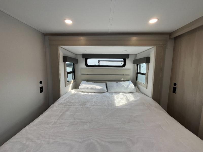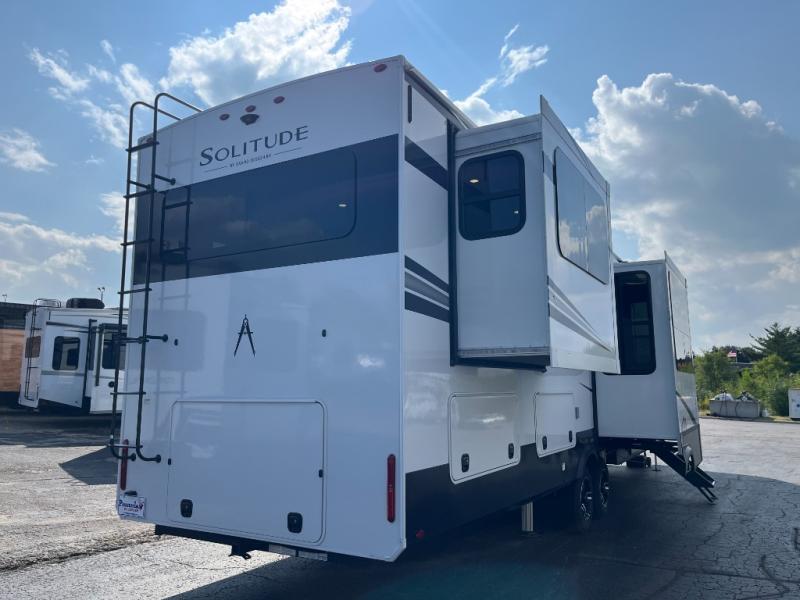 Each Solitude fifth wheel by Grand Design features a 101" wide-body construction, heavy duty 8,000 lb. axles, frameless tinted windows, and high-gloss gel coat sidewalls. You can camp year around thanks to the Weather-Tek Package that includes a 35K BTU high-capacity furnace, an all-in-one enclosed and heated utility center, and a fully enclosed underbelly with heated tanks and storage. Inside, you'll love the premium roller shades, hardwood cabinet doors, solid surface countertops, plus residential finishes throughout to make you truly feel at home. Each model also includes a MORryde CRE3000 suspension system, self adjusting brakes, and a MORryde pin box that will provide smooth towing from home to campground. Affordable luxury is possible with the Solitude fifth wheels; choose yours today!