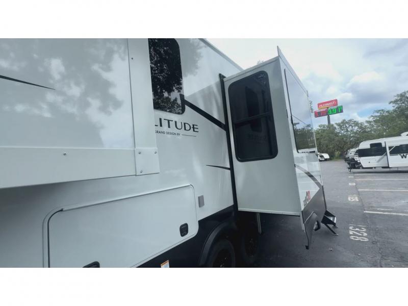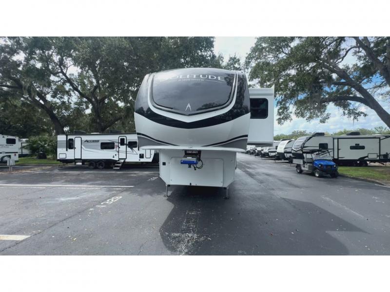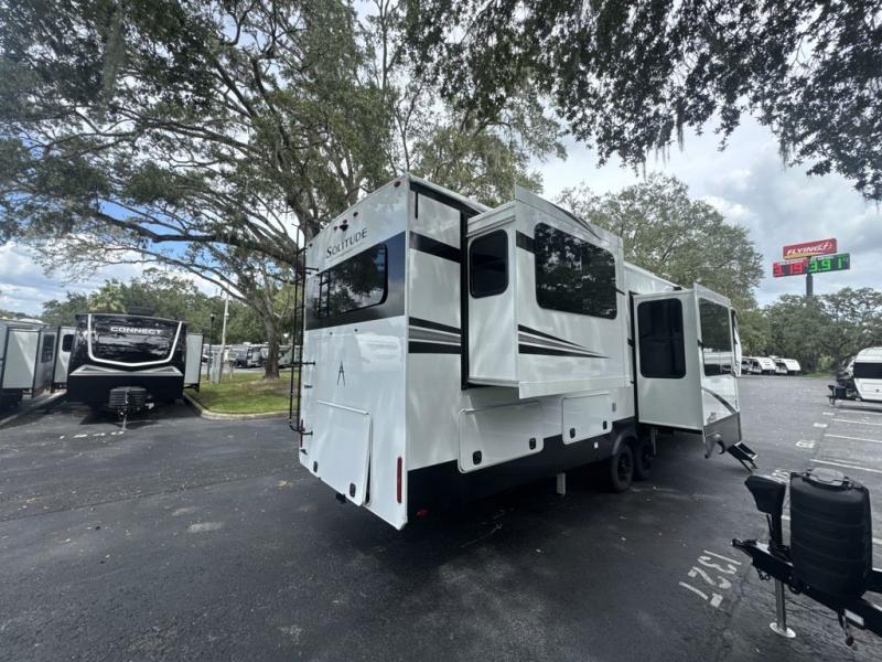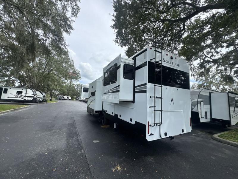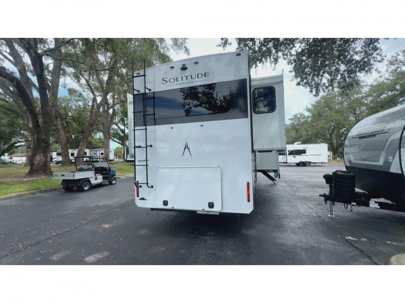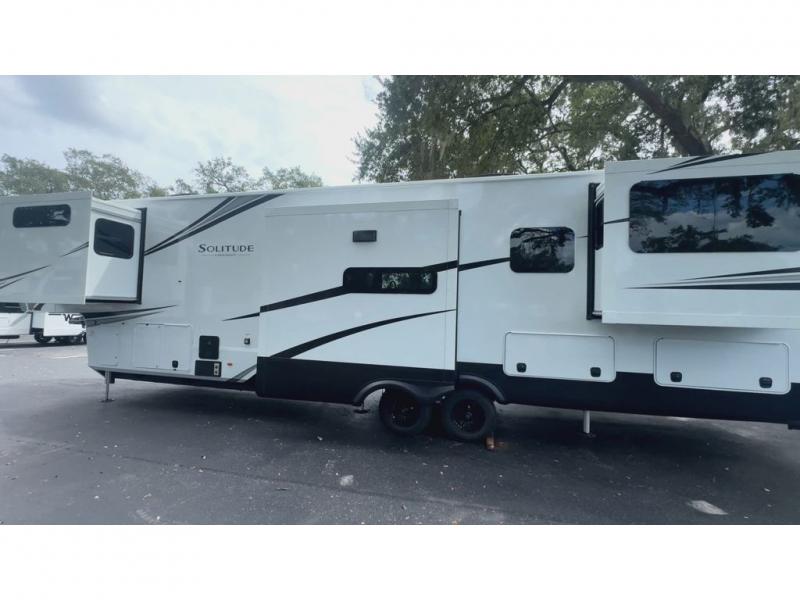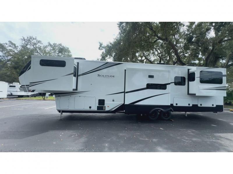 Each Solitude fifth wheel by Grand Design features a 101" wide-body construction, heavy duty 8,000 lb. axles, frameless tinted windows, and high-gloss gel coat sidewalls. You can camp year around thanks to the Weather-Tek Package that includes a 35K BTU high-capacity furnace, an all-in-one enclosed and heated utility center, and a fully enclosed underbelly with heated tanks and storage. Inside, you'll love the premium roller shades, hardwood cabinet doors, solid surface countertops, plus residential finishes throughout to make you truly feel at home. Each model also includes a MORryde CRE3000 suspension system, self adjusting brakes, and a MORryde pin box that will provide smooth towing from home to campground. Affordable luxury is possible with the Solitude fifth wheels; choose yours today!