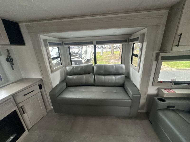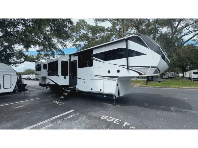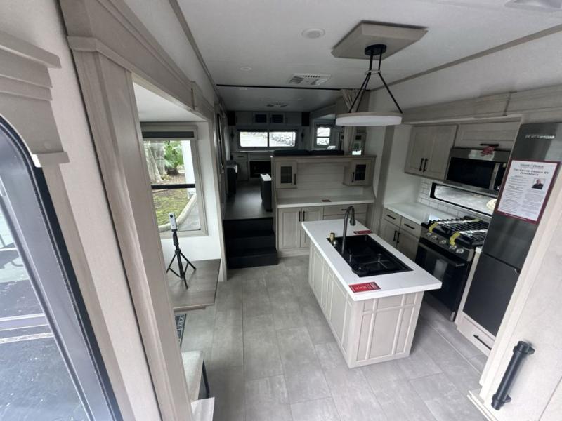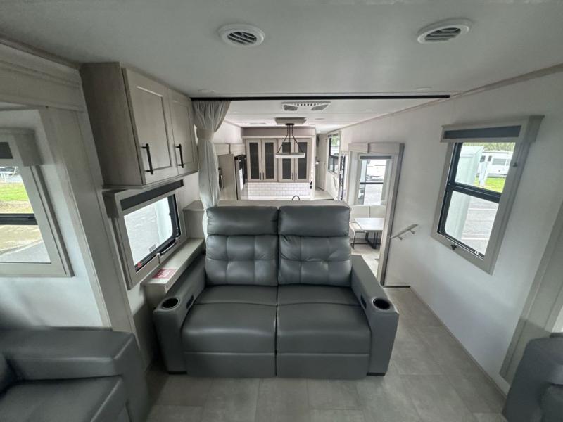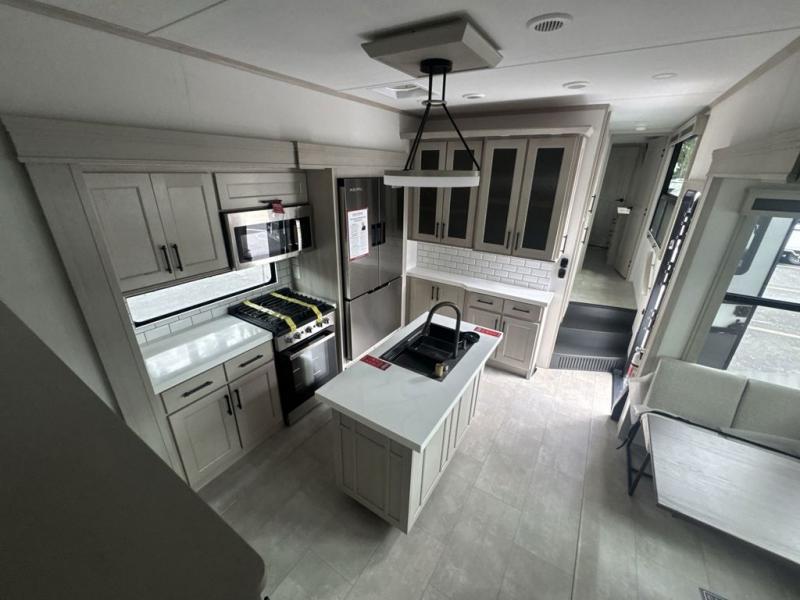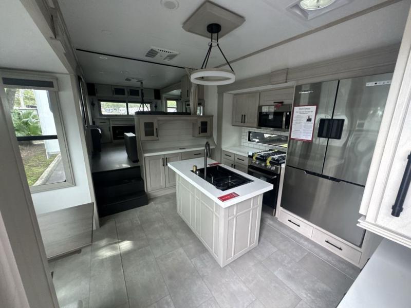Each minute spent in this spacious fifth wheel will feel just like home! The rear living area includes a rear entertainment center with an LED Smart TV and a fireplace, overhead cabinets, theater seating, plus two tri-fold sofas for your guests to sleep on. You will have the front private bedroom all to yourselves with a queen bed slide out that can be switched out for an optional king bed, and the front closet provides all the space you need to store your belongings. This model includes a spacious full bath plus dual bath sinks for ultimate convenience. The chef of your group will love the middle kitchen with its convenient island including double sinks, a residential cooktop and built-in oven, 20 cu. ft. refrigerator, and free-standing dinette. Head outdoors to find a 16' power awning with LED lights and middle pass through along with rear storage including a sliding tray, and you might want to add the optional pull-out kitchen.