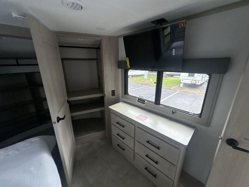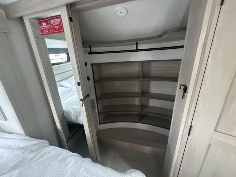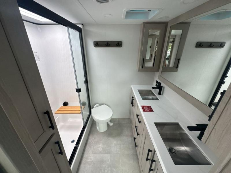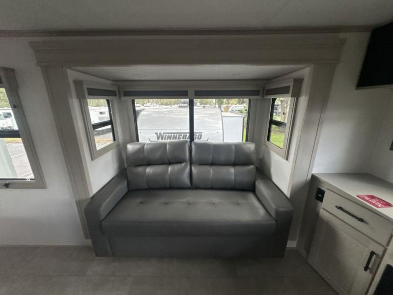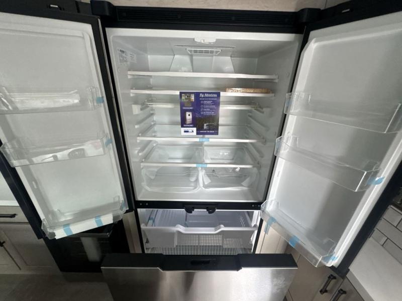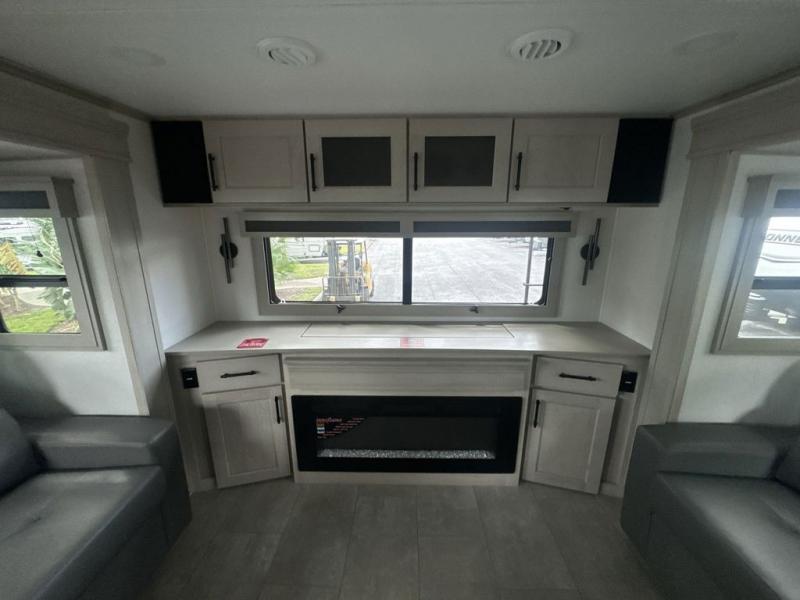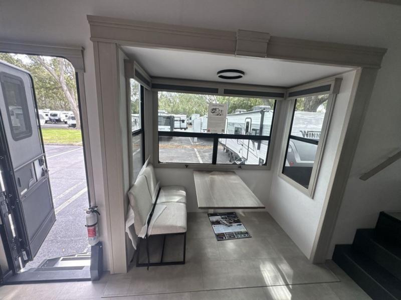 Each minute spent in this spacious fifth wheel will feel just like home! The rear living area includes a rear entertainment center with an LED Smart TV and a fireplace, overhead cabinets, theater seating, plus two tri-fold sofas for your guests to sleep on. You will have the front private bedroom all to yourselves with a queen bed slide out that can be switched out for an optional king bed, and the front closet provides all the space you need to store your belongings. This model includes a spacious full bath plus dual bath sinks for ultimate convenience. The chef of your group will love the middle kitchen with its convenient island including double sinks, a residential cooktop and built-in oven, 20 cu. ft. refrigerator, and free-standing dinette. Head outdoors to find a 16' power awning with LED lights and middle pass through along with rear storage including a sliding tray, and you might want to add the optional pull-out kitchen.