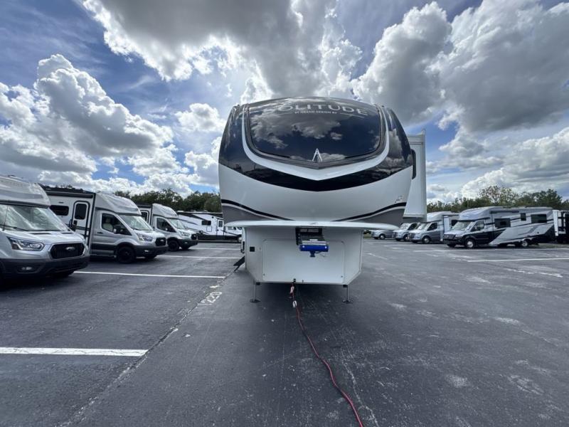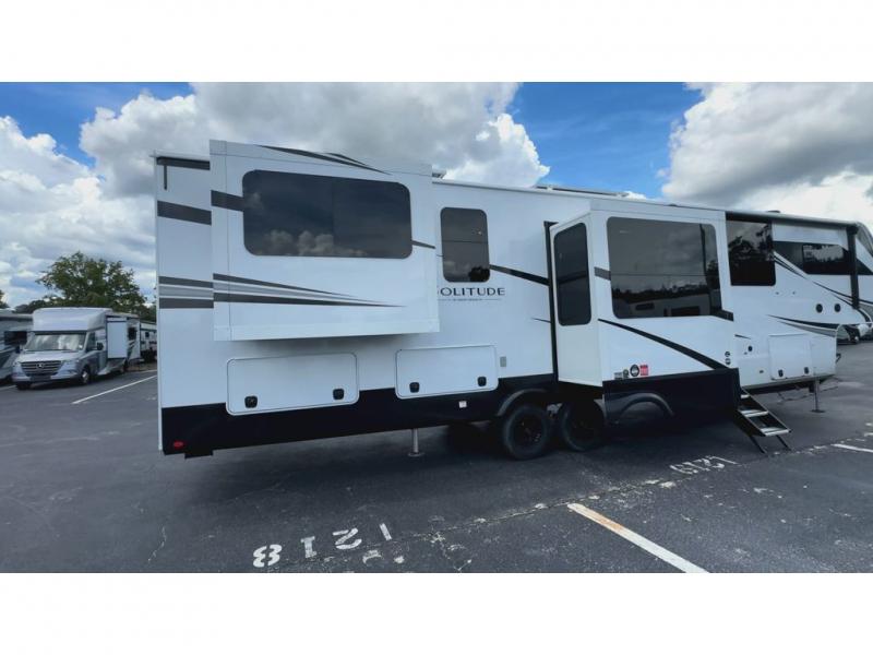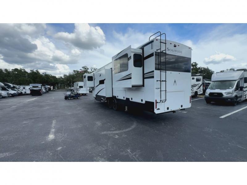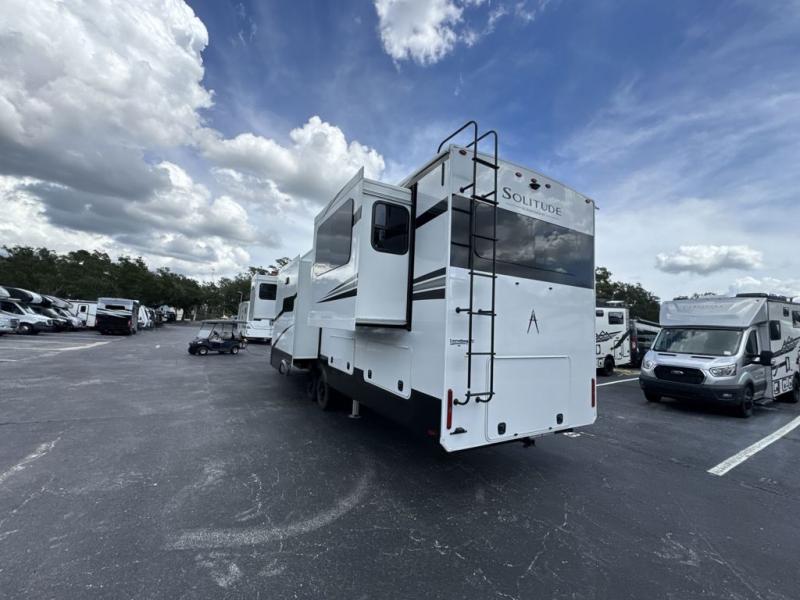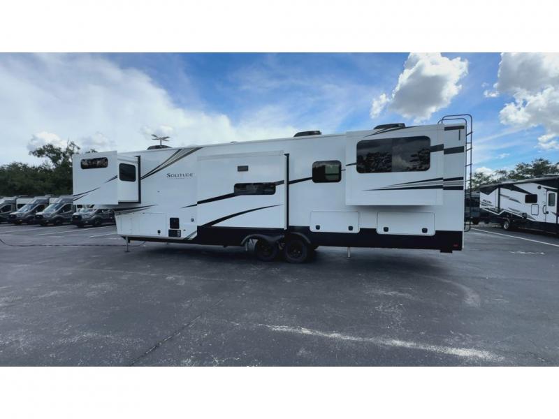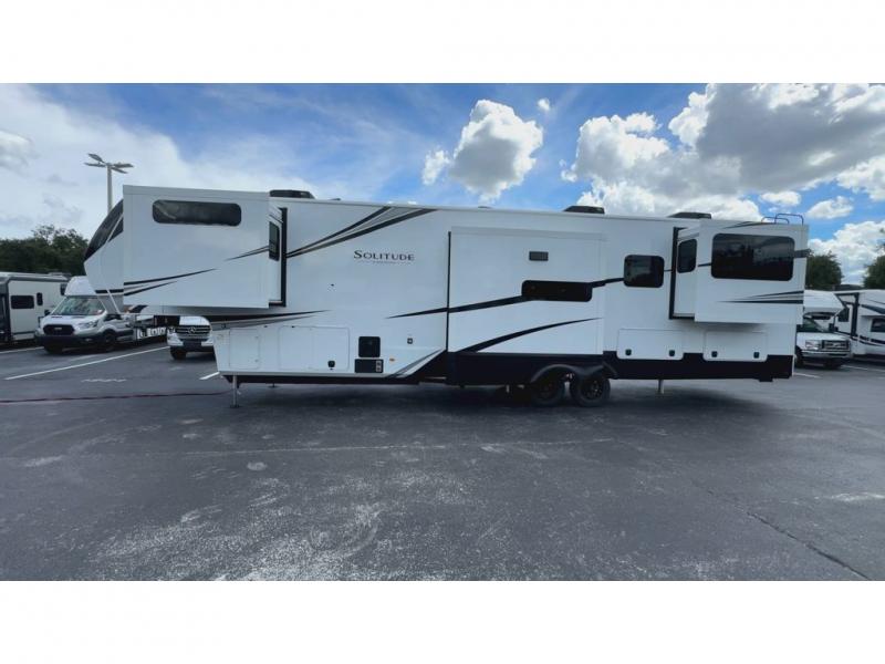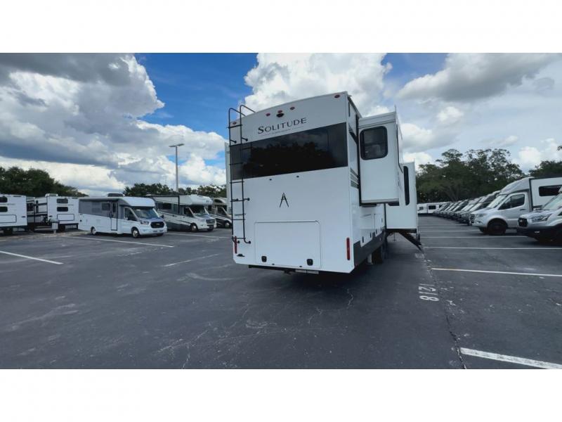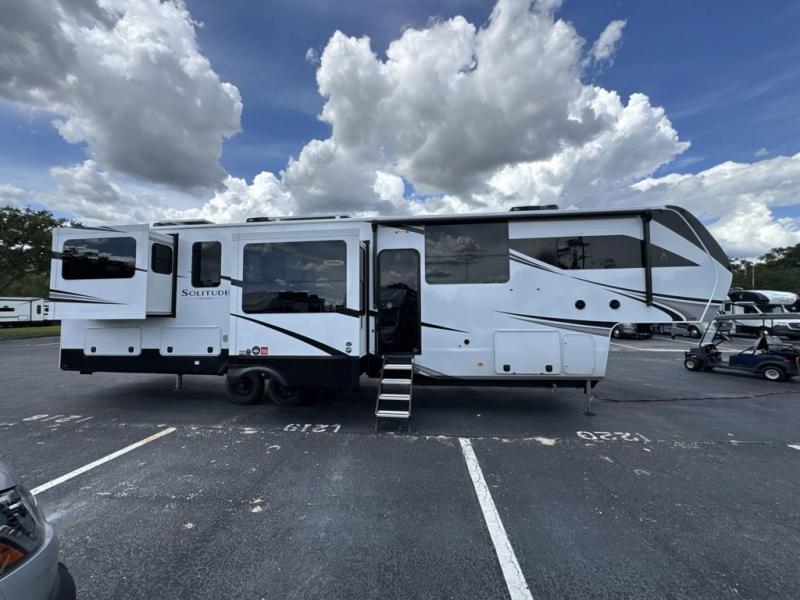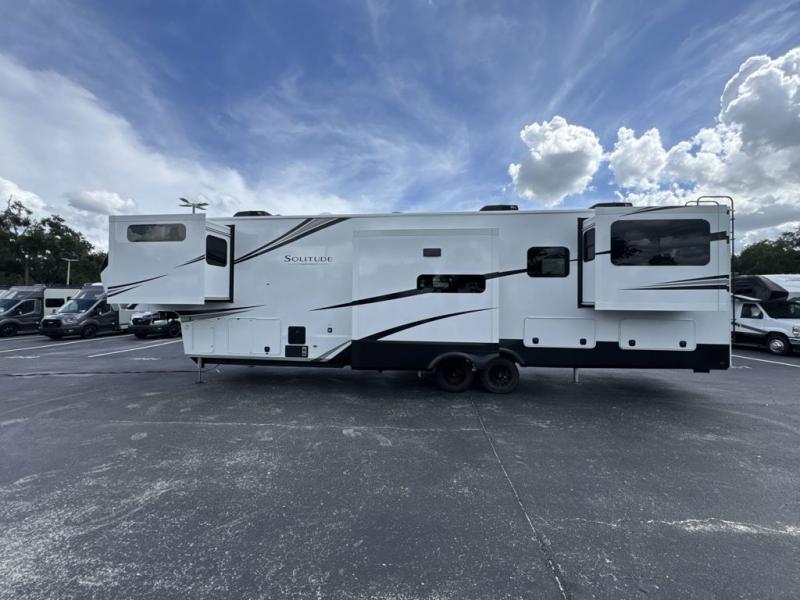 Each Solitude fifth wheel by Grand Design features a 101" wide-body construction, heavy duty 8,000 lb. axles, frameless tinted windows, and high-gloss gel coat sidewalls. You can camp year around thanks to the Weather-Tek Package that includes a 35K BTU high-capacity furnace, an all-in-one enclosed and heated utility center, and a fully enclosed underbelly with heated tanks and storage. Inside, you'll love the premium roller shades, hardwood cabinet doors, solid surface countertops, plus residential finishes throughout to make you truly feel at home. Each model also includes a MORryde CRE3000 suspension system, self adjusting brakes, and a MORryde pin box that will provide smooth towing from home to campground. Affordable luxury is possible with the Solitude fifth wheels; choose yours today!