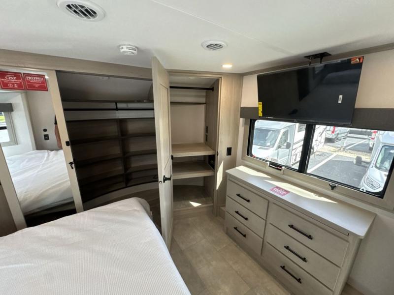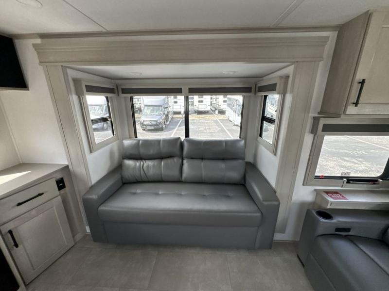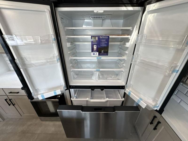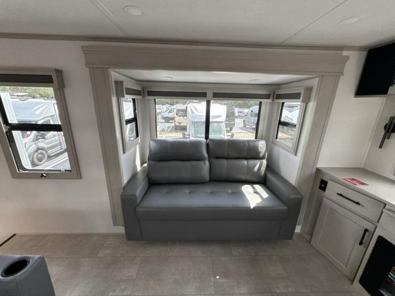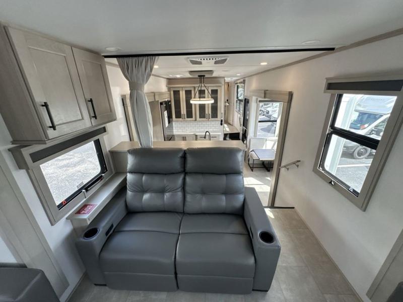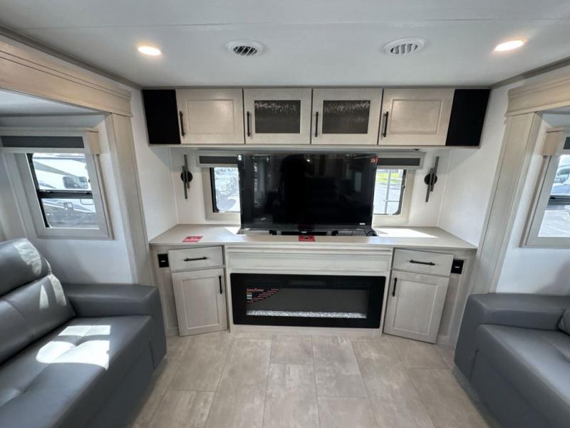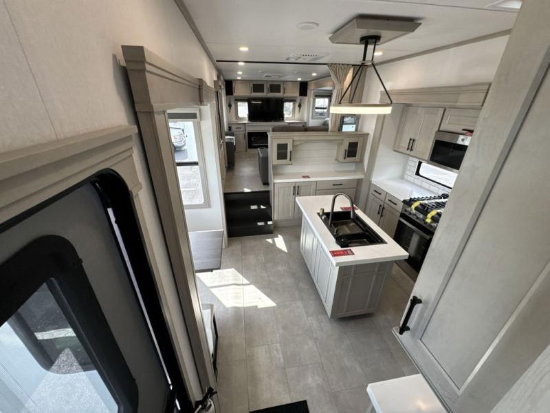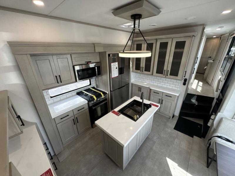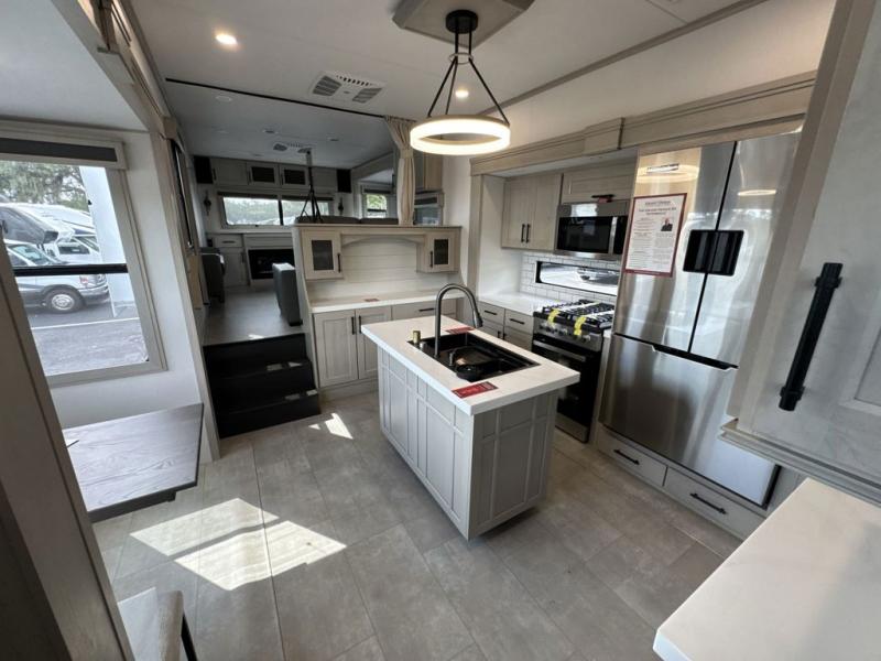 Each minute spent in this spacious fifth wheel will feel just like home! The rear living area includes a rear entertainment center with an LED Smart TV and a fireplace, overhead cabinets, theater seating, plus two tri-fold sofas for your guests to sleep on. You will have the front private bedroom all to yourselves with a queen bed slide out that can be switched out for an optional king bed, and the front closet provides all the space you need to store your belongings. This model includes a spacious full bath plus dual bath sinks for ultimate convenience. The chef of your group will love the middle kitchen with its convenient island including double sinks, a residential cooktop and built-in oven, 20 cu. ft. refrigerator, and free-standing dinette. Head outdoors to find a 16' power awning with LED lights and middle pass through along with rear storage including a sliding tray, and you might want to add the optional pull-out kitchen.