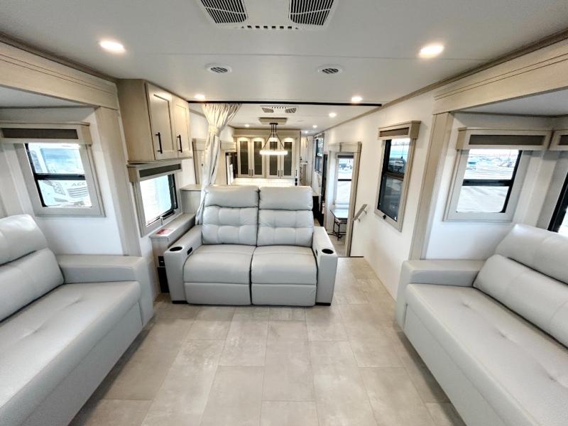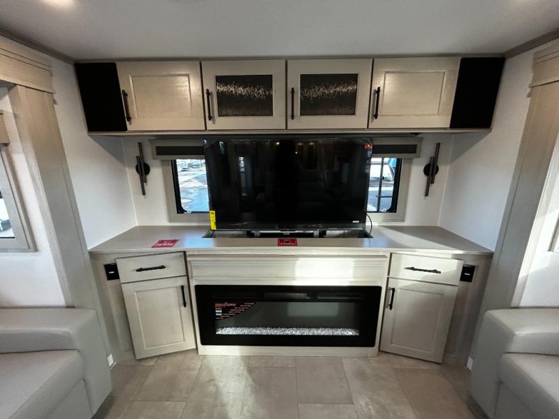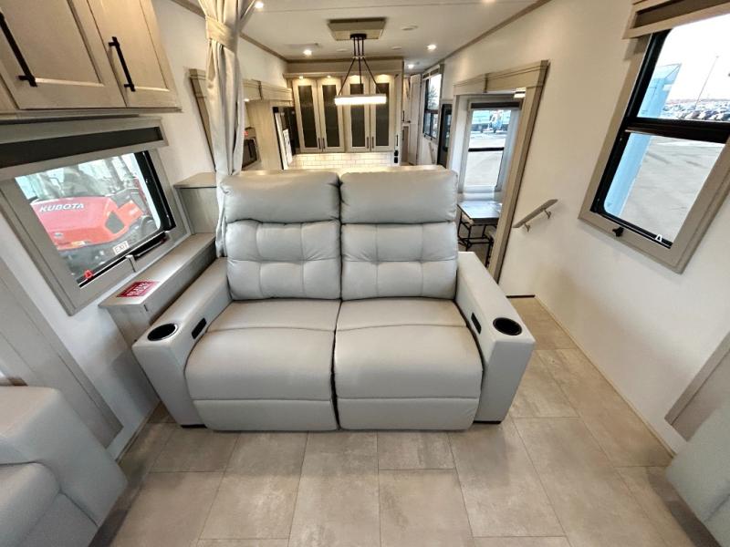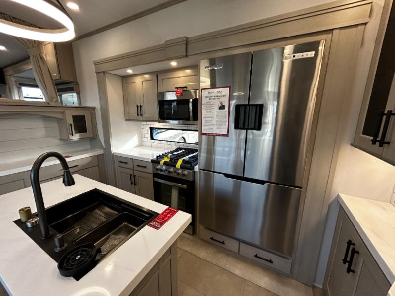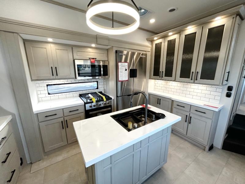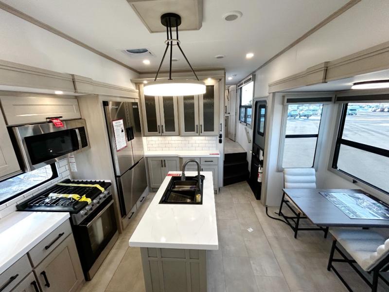 Each minute spent in this spacious fifth wheel will feel just like home! The rear living area includes a rear entertainment center with an LED Smart TV and a fireplace, overhead cabinets, theater seating, plus two tri-fold sofas for your guests to sleep on. You will have the front private bedroom all to yourselves with a queen bed slide out that can be switched out for an optional king bed, and the front closet provides all the space you need to store your belongings. This model includes a spacious full bath plus dual bath sinks for ultimate convenience. The chef of your group will love the middle kitchen with its convenient island including double sinks, a residential cooktop and built-in oven, 20 cu. ft. refrigerator, and free-standing dinette. Head outdoors to find a 16' power awning with LED lights and middle pass through along with rear storage including a sliding tray, and you might want to add the optional pull-out kitchen.