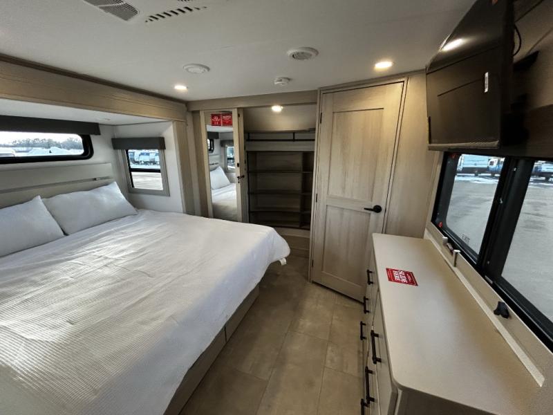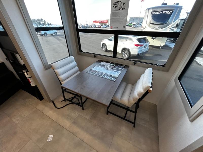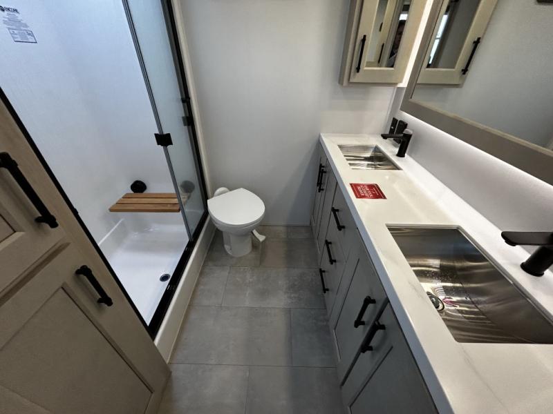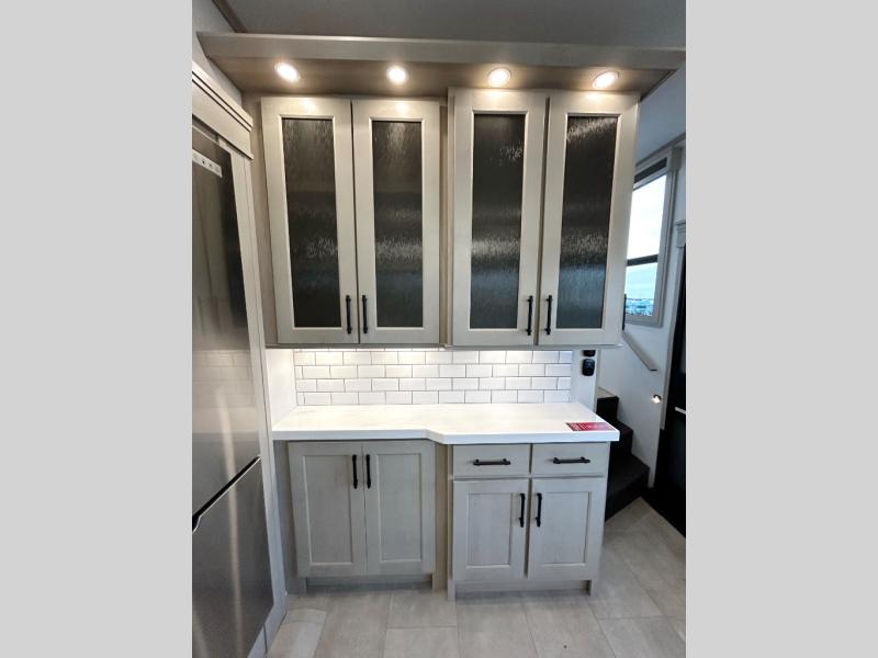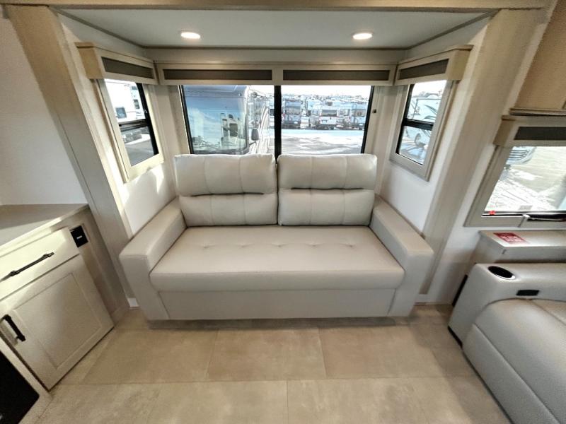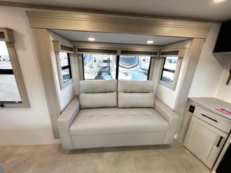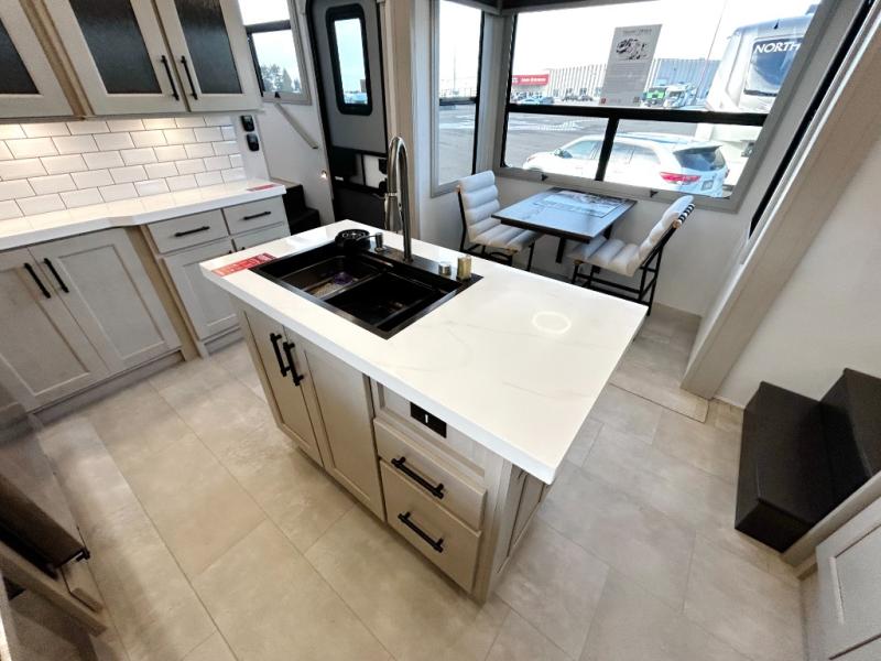 Each minute spent in this spacious fifth wheel will feel just like home! The rear living area includes a rear entertainment center with an LED Smart TV and a fireplace, overhead cabinets, theater seating, plus two tri-fold sofas for your guests to sleep on. You will have the front private bedroom all to yourselves with a queen bed slide out that can be switched out for an optional king bed, and the front closet provides all the space you need to store your belongings. This model includes a spacious full bath plus dual bath sinks for ultimate convenience. The chef of your group will love the middle kitchen with its convenient island including double sinks, a residential cooktop and built-in oven, 20 cu. ft. refrigerator, and free-standing dinette. Head outdoors to find a 16' power awning with LED lights and middle pass through along with rear storage including a sliding tray, and you might want to add the optional pull-out kitchen.