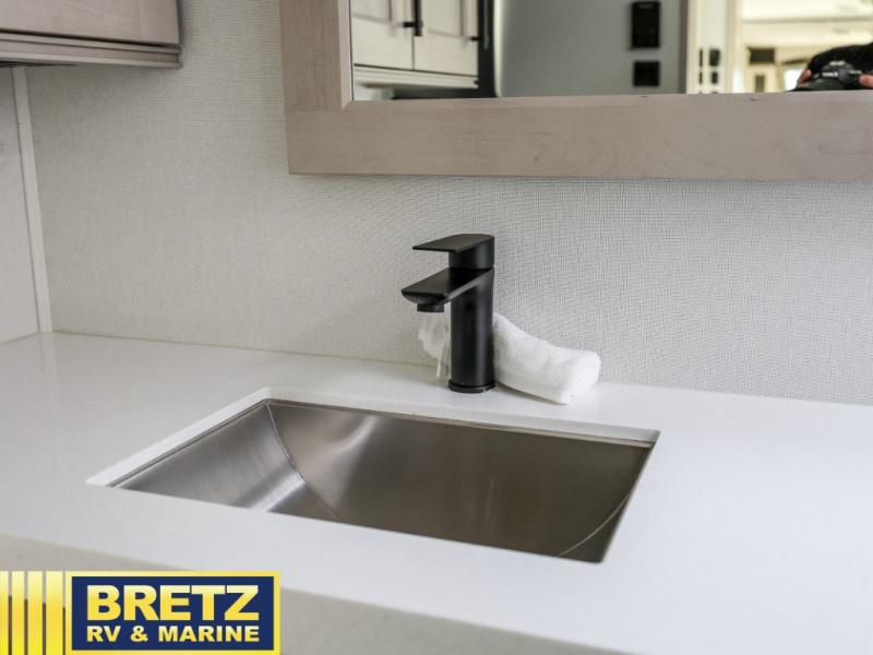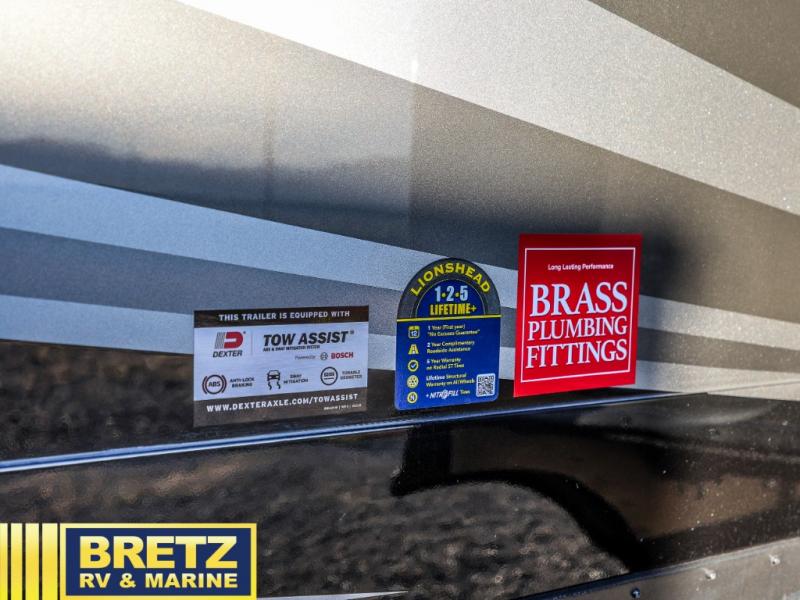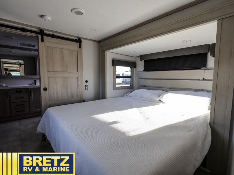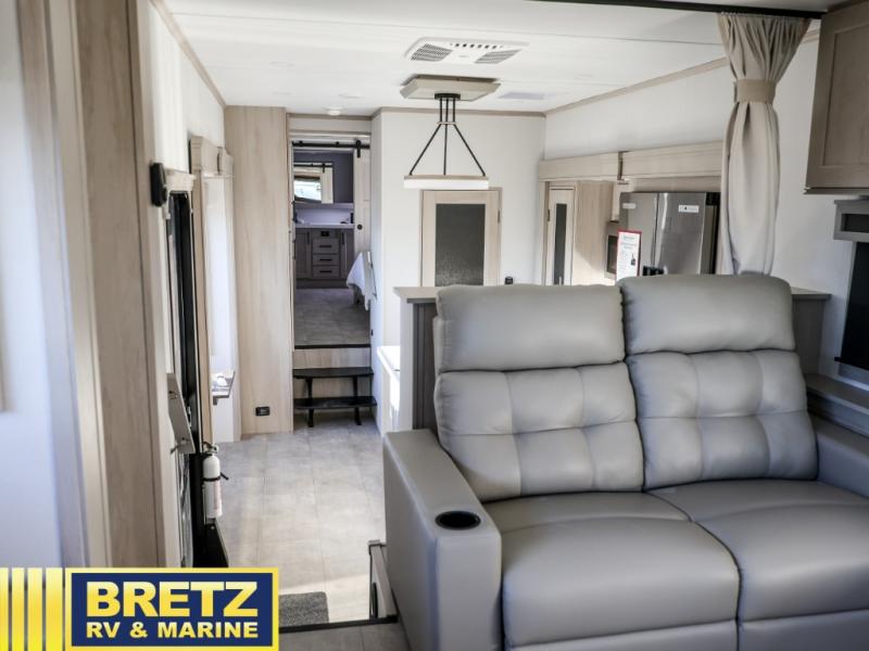Five slide outs, a full bathroom with dual sinks, a half bath off of the kitchen, and a separate front living room and entertainment area are a few reasons you will enjoy your time spent in this fifth wheel! The separate kitchen is a dream with stainless steel appliances including a built-in oven, a pantry and hutch with counter space, a kitchen island plus a free-standing dinette slide with windows for great views. The entertainment center offers an LED Smart TV with a fireplace below and storage, and the dual opposing tri-fold sofas provide added sleeping space at night. The master bedroom includes a queen bed plus space savings sliding doors that lead you to the rear full bathroom with dual sinks, linen storage, and washer/dryer prep. The exterior has several storage choices as well including a pass-through compartment for fishing poles and such, plus the unique sliding tray in the rear allows you to bring along larger items such as camping tables, portable grills, golf clubs, totes and more.