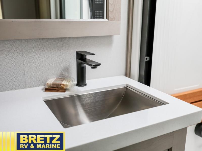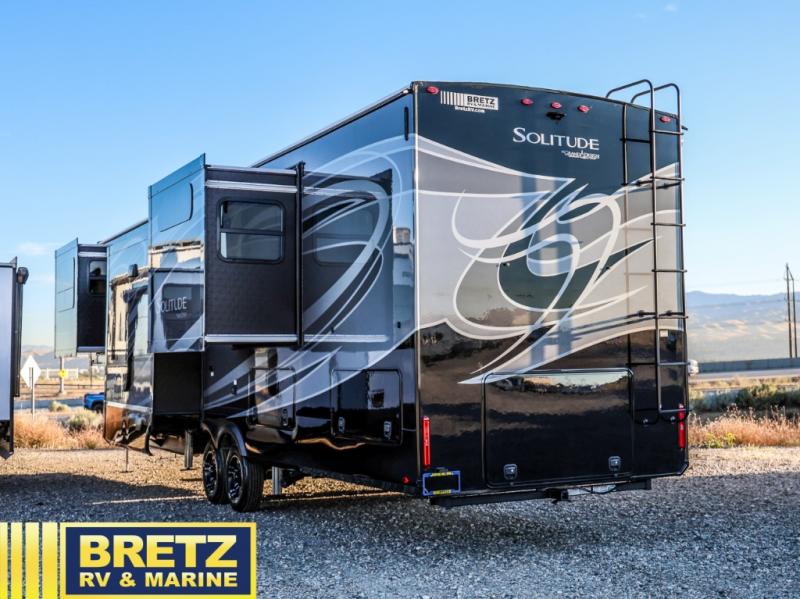 Each Solitude fifth wheel by Grand Design features a 101" wide-body construction, heavy duty 8,000 lb. axles, frameless tinted windows, and high-gloss gel coat sidewalls. You can camp year around thanks to the Weather-Tek Package that includes a 35K BTU high-capacity furnace, an all-in-one enclosed and heated utility center, and a fully enclosed underbelly with heated tanks and storage. Inside, you'll love the premium roller shades, hardwood cabinet doors, solid surface countertops, plus residential finishes throughout to make you truly feel at home. Each model also includes a MORryde CRE3000 suspension system, self adjusting brakes, and a MORryde pin box that will provide smooth towing from home to campground. Affordable luxury is possible with the Solitude fifth wheels; choose yours today!