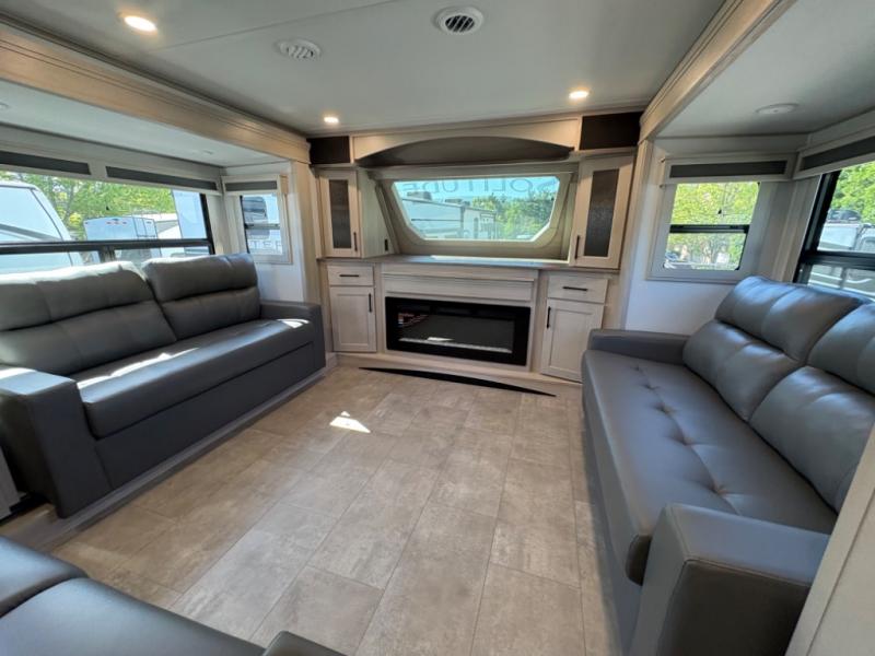 Enjoy true residential comfort in the Grand Design Solitude 380FL fifth wheel. This luxury RV features five slide outs and a unique front living area that includes two tri fold sofas, theater seating, an LED Smart TV, and a cozy fireplace.