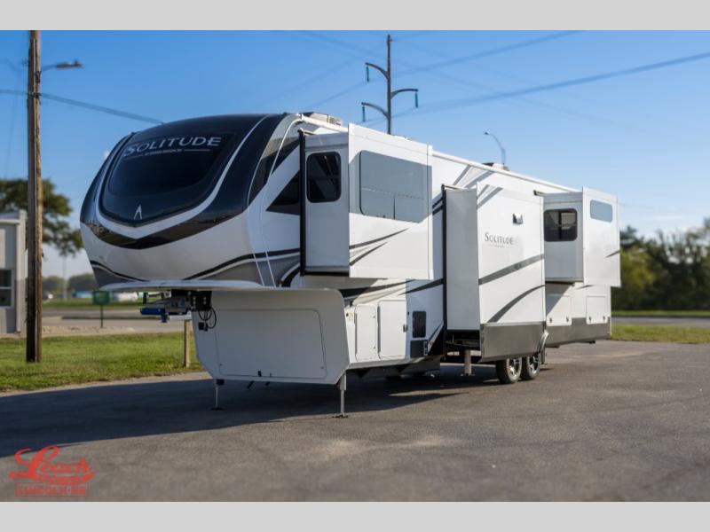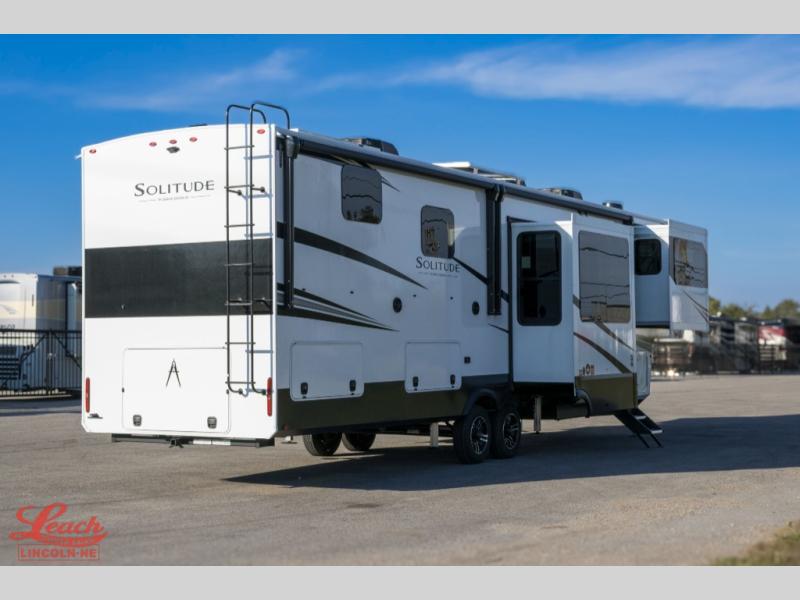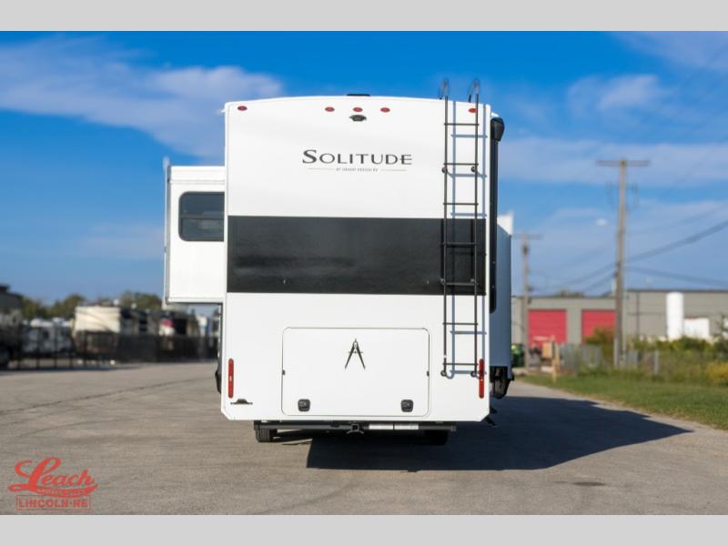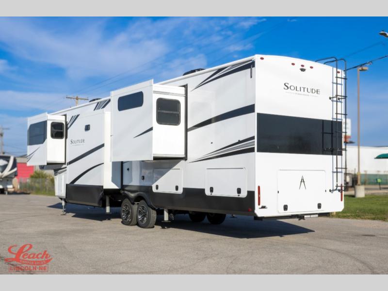Each Solitude fifth wheel by Grand Design features a 101" wide-body construction, heavy duty 8,000 lb. axles, frameless tinted windows, and high-gloss gel coat sidewalls. You can camp year around thanks to the Weather-Tek Package that includes a 35K BTU high-capacity furnace, an all-in-one enclosed and heated utility center, and a fully enclosed underbelly with heated tanks and storage. Inside, you'll love the premium roller shades, hardwood cabinet doors, solid surface countertops, plus residential finishes throughout to make you truly feel at home. Each model also includes a MORryde CRE3000 suspension system, self adjusting brakes, and a MORryde pin box that will provide smooth towing from home to campground. Affordable luxury is possible with the Solitude fifth wheels; choose yours today!