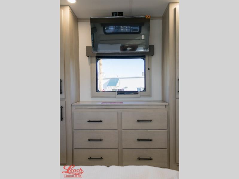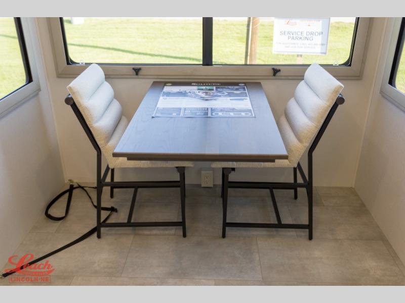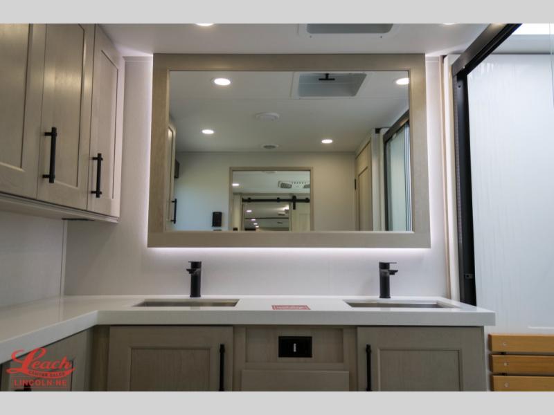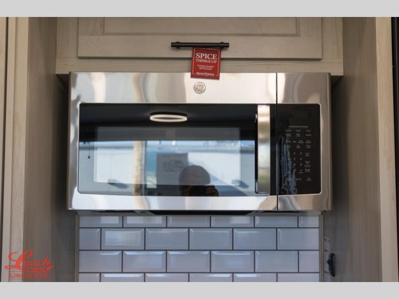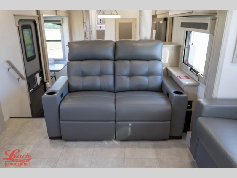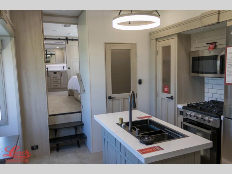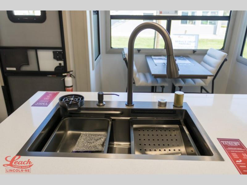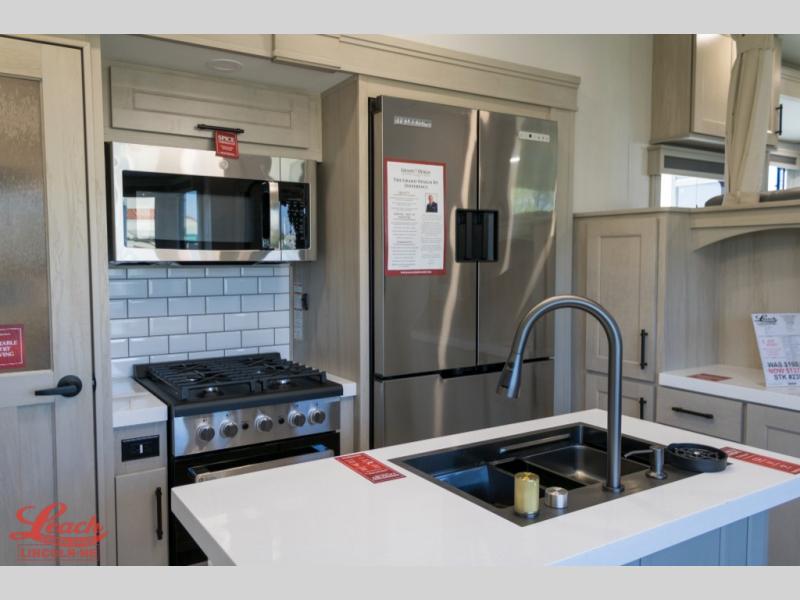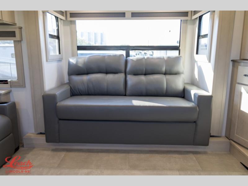 Five slide outs, a full bathroom with dual sinks, a half bath off of the kitchen, and a separate front living room and entertainment area are a few reasons you will enjoy your time spent in this fifth wheel! The separate kitchen is a dream with stainless steel appliances including a built-in oven, a pantry and hutch with counter space, a kitchen island plus a free-standing dinette slide with windows for great views. The entertainment center offers an LED Smart TV with a fireplace below and storage, and the dual opposing tri-fold sofas provide added sleeping space at night. The master bedroom includes a queen bed plus space savings sliding doors that lead you to the rear full bathroom with dual sinks, linen storage, and washer/dryer prep. The exterior has several storage choices as well including a pass-through compartment for fishing poles and such, plus the unique sliding tray in the rear allows you to bring along larger items such as camping tables, portable grills, golf clubs, totes and more.