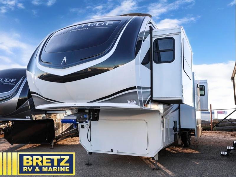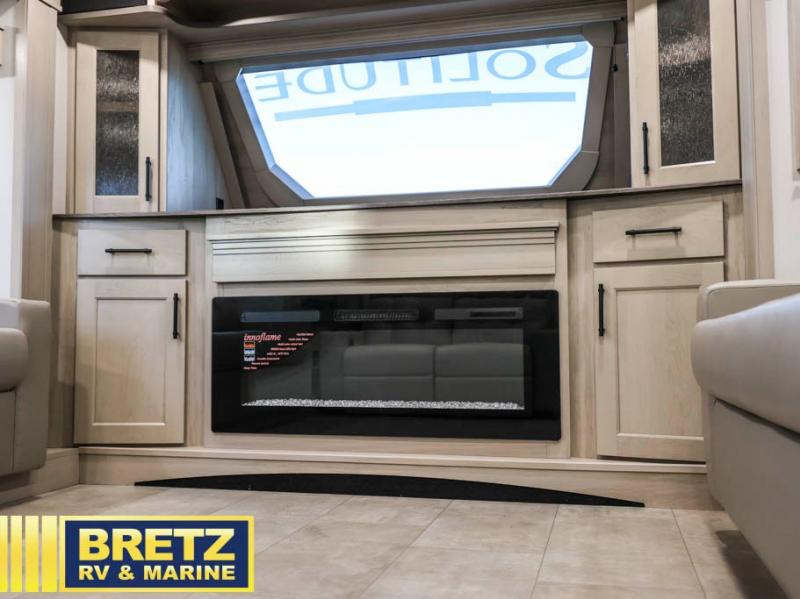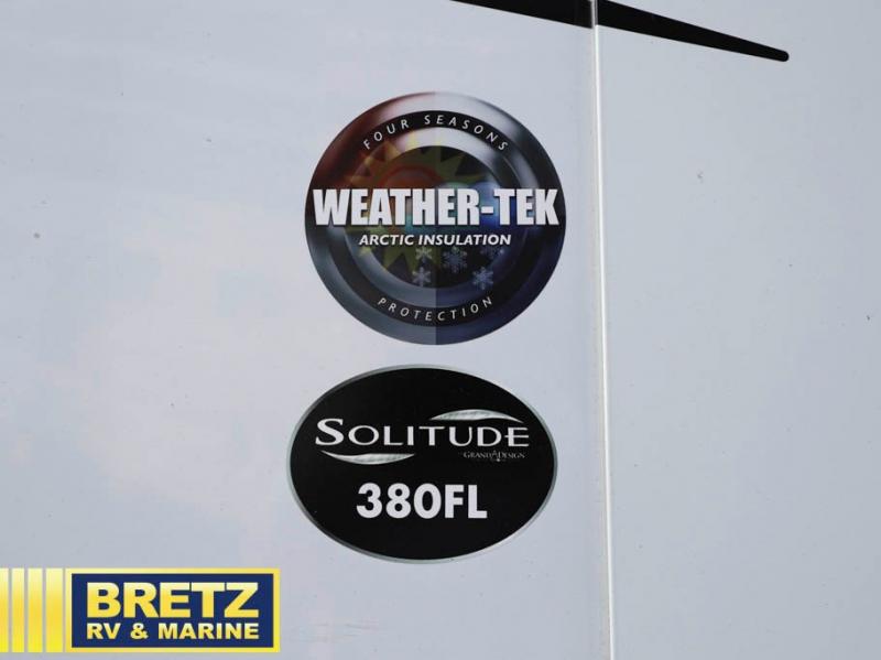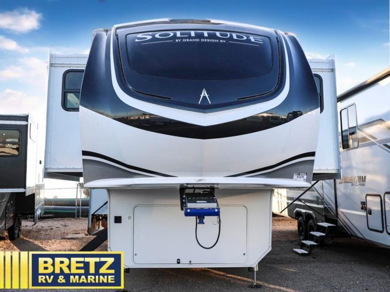 Each Solitude fifth wheel by Grand Design features a 101" wide-body construction, heavy duty 8,000 lb. axles, frameless tinted windows, and high-gloss gel coat sidewalls. You can camp year around thanks to the Weather-Tek Package that includes a 35K BTU high-capacity furnace, an all-in-one enclosed and heated utility center, and a fully enclosed underbelly with heated tanks and storage. Inside, you'll love the premium roller shades, hardwood cabinet doors, solid surface countertops, plus residential finishes throughout to make you truly feel at home. Each model also includes a MORryde CRE3000 suspension system, self adjusting brakes, and a MORryde pin box that will provide smooth towing from home to campground. Affordable luxury is possible with the Solitude fifth wheels; choose yours today!