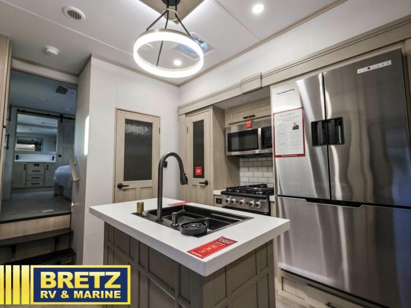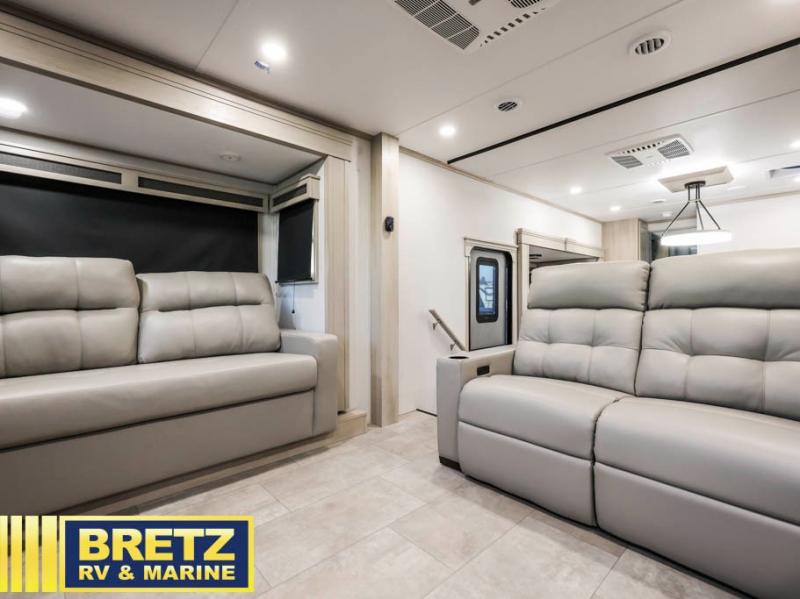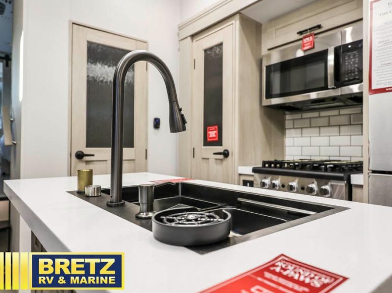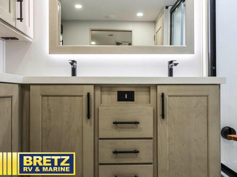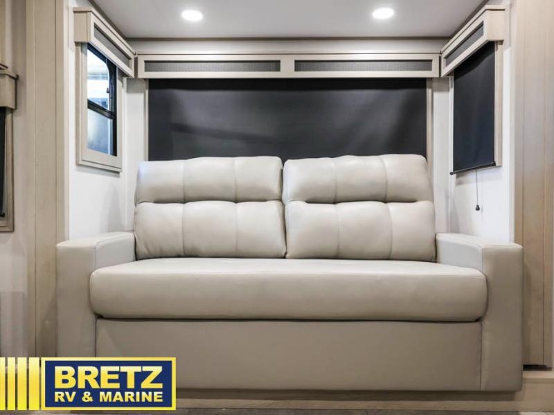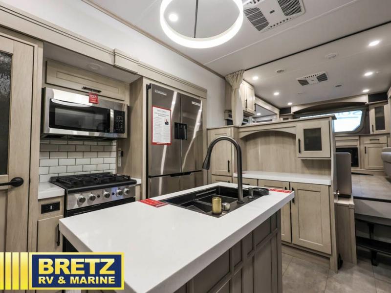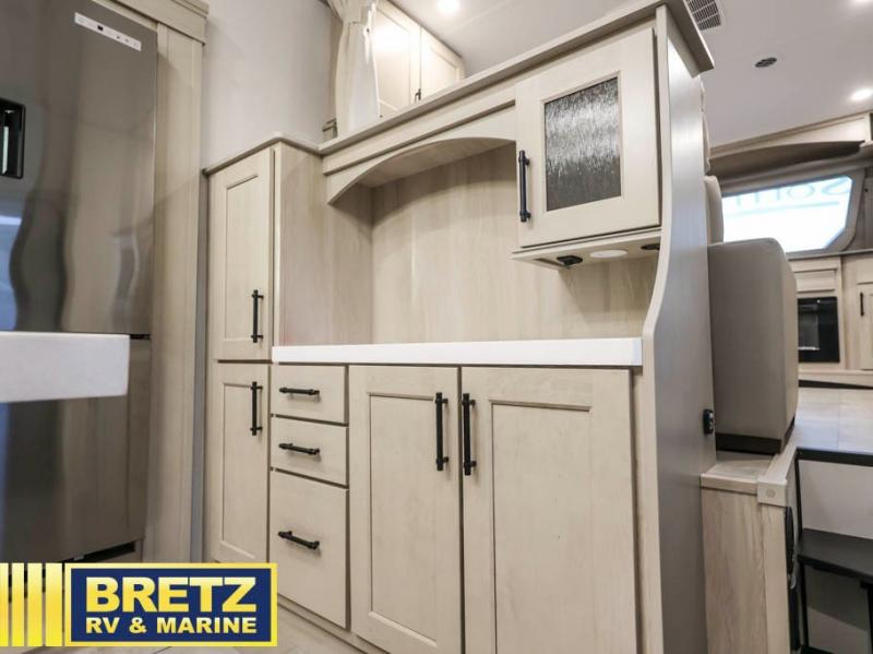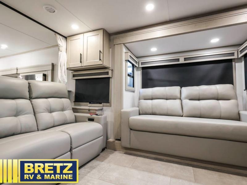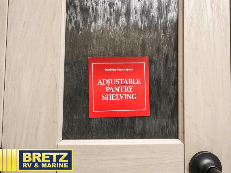 Five slide outs, a full bathroom with dual sinks, a half bath off of the kitchen, and a separate front living room and entertainment area are a few reasons you will enjoy your time spent in this fifth wheel! The separate kitchen is a dream with stainless steel appliances including a built-in oven, a pantry and hutch with counter space, a kitchen island plus a free-standing dinette slide with windows for great views. The entertainment center offers an LED Smart TV with a fireplace below and storage, and the dual opposing tri-fold sofas provide added sleeping space at night. The master bedroom includes a queen bed plus space savings sliding doors that lead you to the rear full bathroom with dual sinks, linen storage, and washer/dryer prep. The exterior has several storage choices as well including a pass-through compartment for fishing poles and such, plus the unique sliding tray in the rear allows you to bring along larger items such as camping tables, portable grills, golf clubs, totes and more.