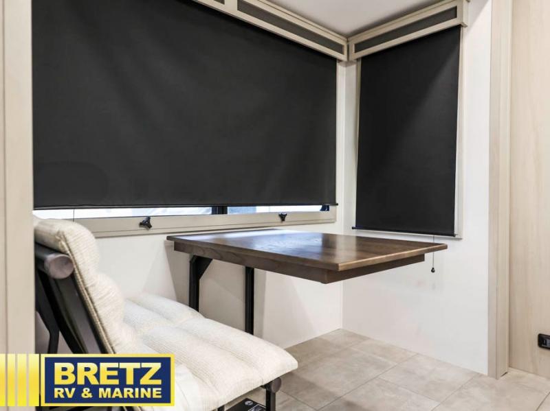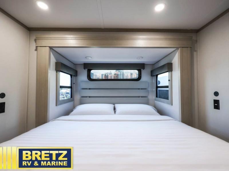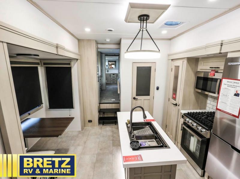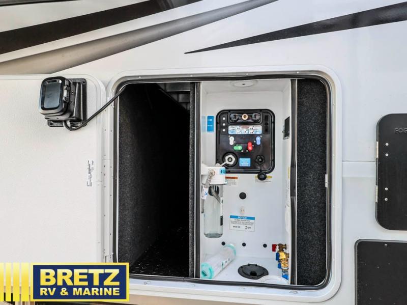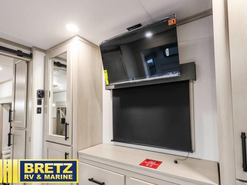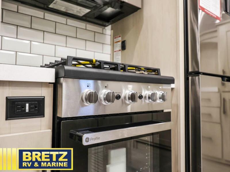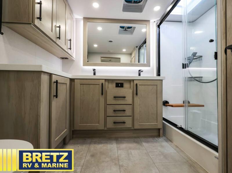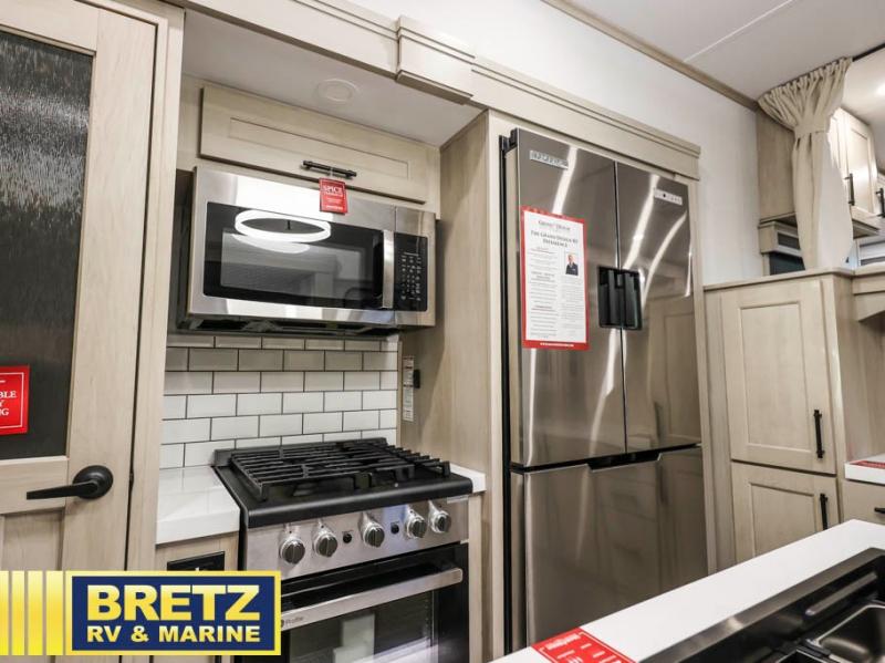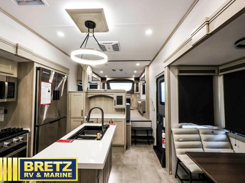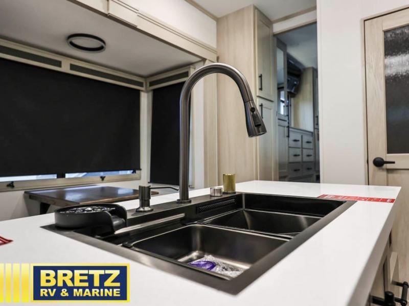 Five slide outs, a full bathroom with dual sinks, a half bath off of the kitchen, and a separate front living room and entertainment area are a few reasons you will enjoy your time spent in this fifth wheel! The separate kitchen is a dream with stainless steel appliances including a built-in oven, a pantry and hutch with counter space, a kitchen island plus a free-standing dinette slide with windows for great views. The entertainment center offers an LED Smart TV with a fireplace below and storage, and the dual opposing tri-fold sofas provide added sleeping space at night. The master bedroom includes a queen bed plus space savings sliding doors that lead you to the rear full bathroom with dual sinks, linen storage, and washer/dryer prep. The exterior has several storage choices as well including a pass-through compartment for fishing poles and such, plus the unique sliding tray in the rear allows you to bring along larger items such as camping tables, portable grills, golf clubs, totes and more.