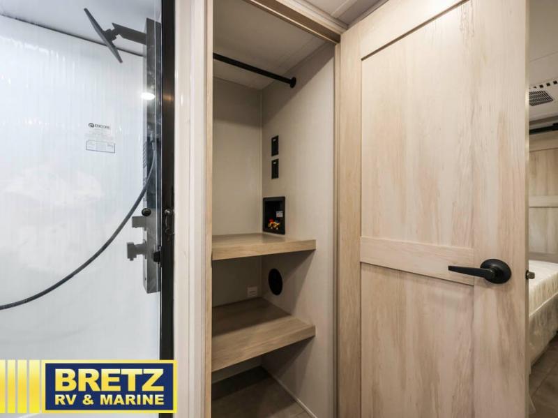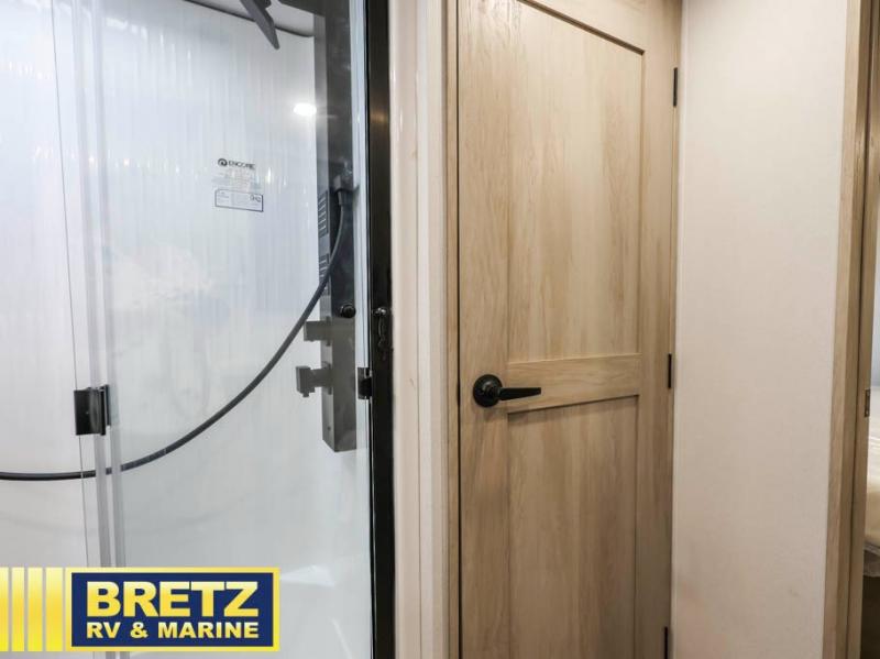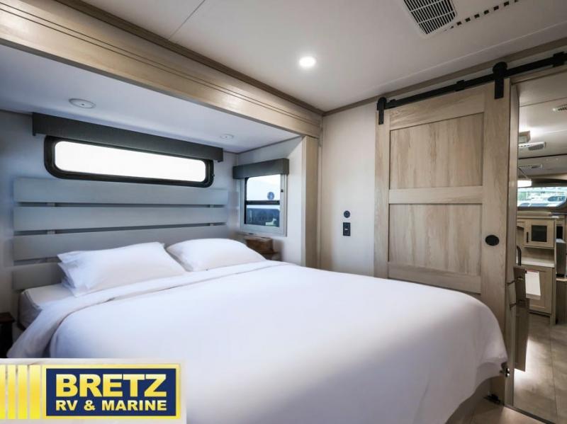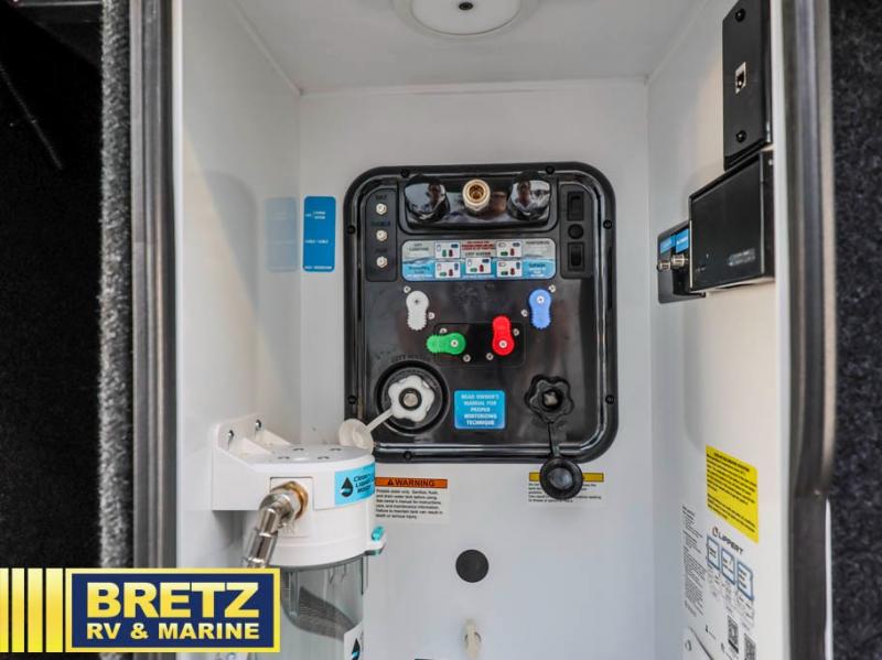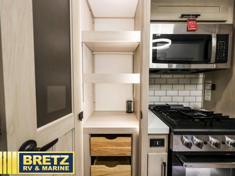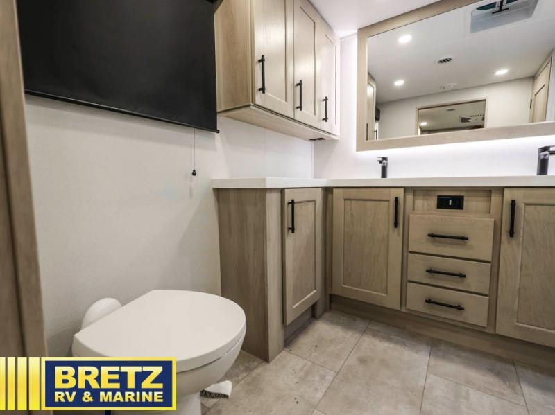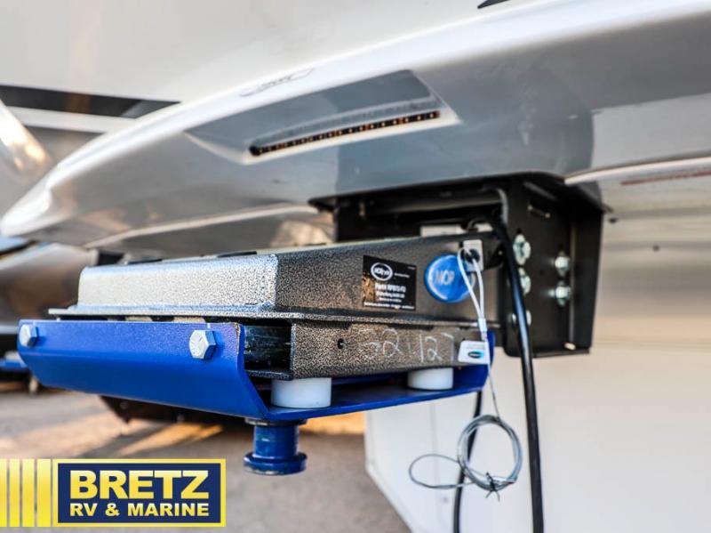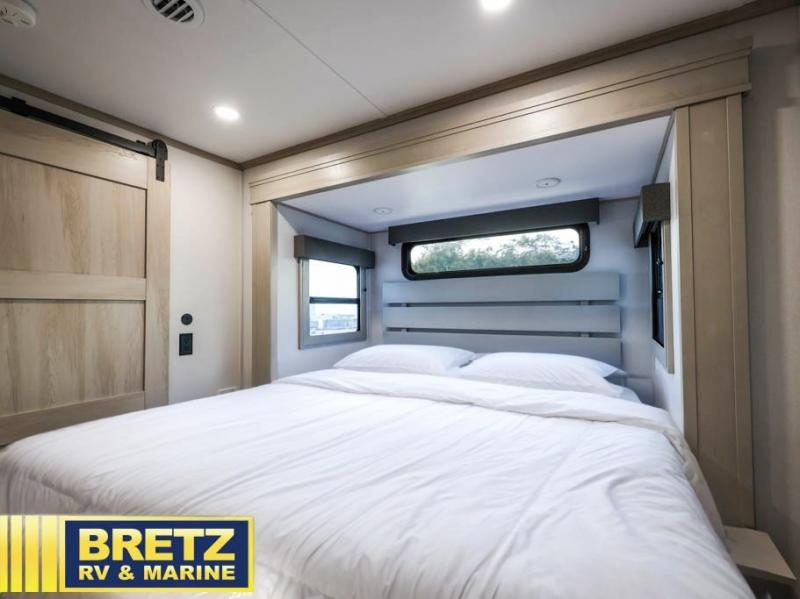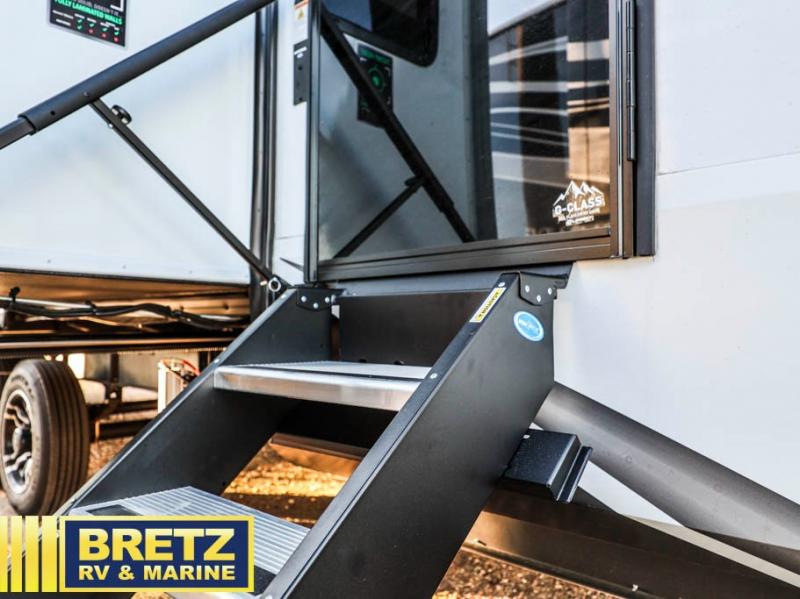 Five slide outs, a full bathroom with dual sinks, a half bath off of the kitchen, and a separate front living room and entertainment area are a few reasons you will enjoy your time spent in this fifth wheel! The separate kitchen is a dream with stainless steel appliances including a built-in oven, a pantry and hutch with counter space, a kitchen island plus a free-standing dinette slide with windows for great views. The entertainment center offers an LED Smart TV with a fireplace below and storage, and the dual opposing tri-fold sofas provide added sleeping space at night. The master bedroom includes a queen bed plus space savings sliding doors that lead you to the rear full bathroom with dual sinks, linen storage, and washer/dryer prep. The exterior has several storage choices as well including a pass-through compartment for fishing poles and such, plus the unique sliding tray in the rear allows you to bring along larger items such as camping tables, portable grills, golf clubs, totes and more.