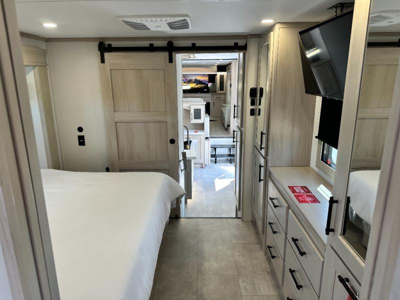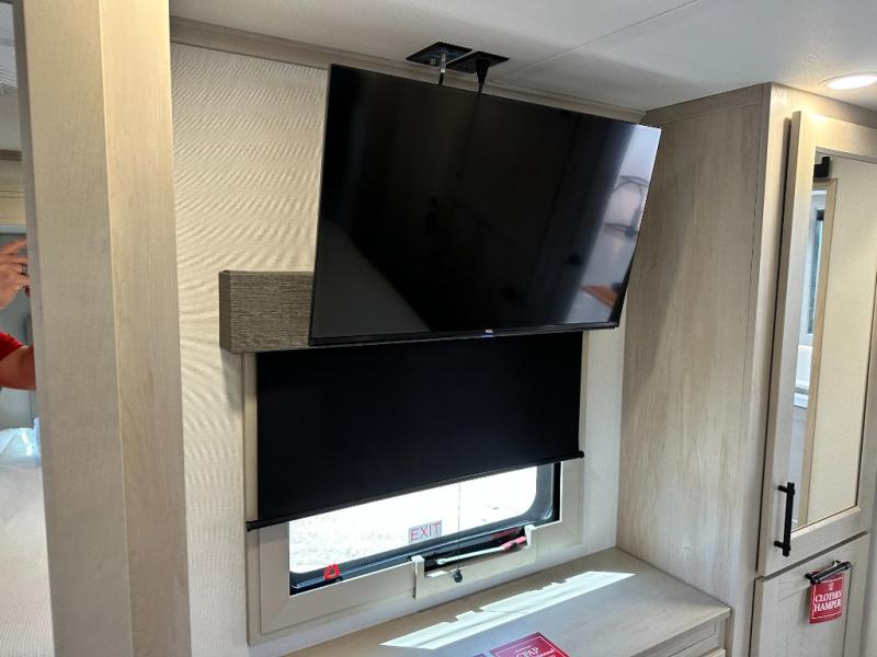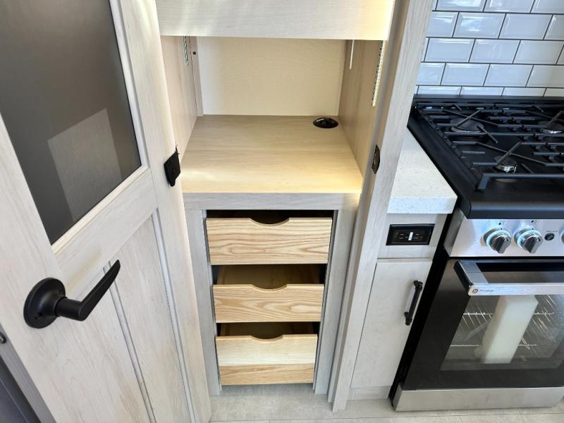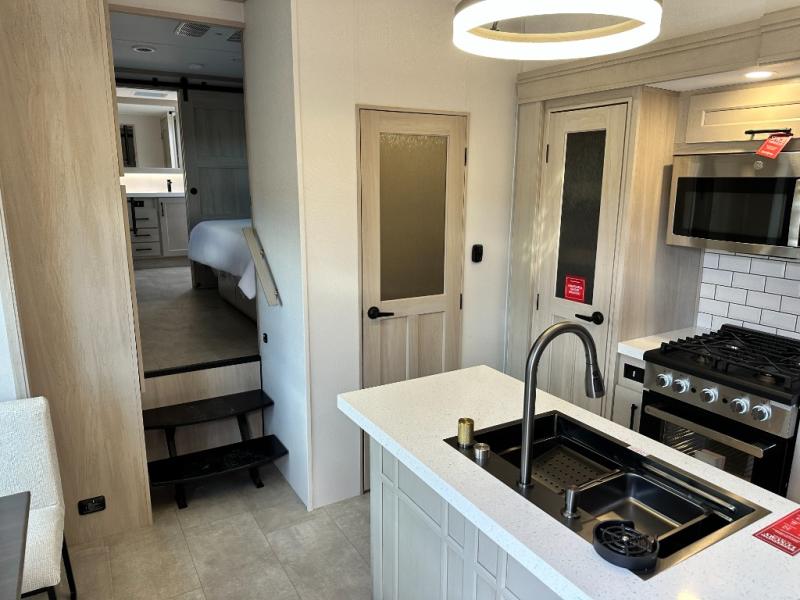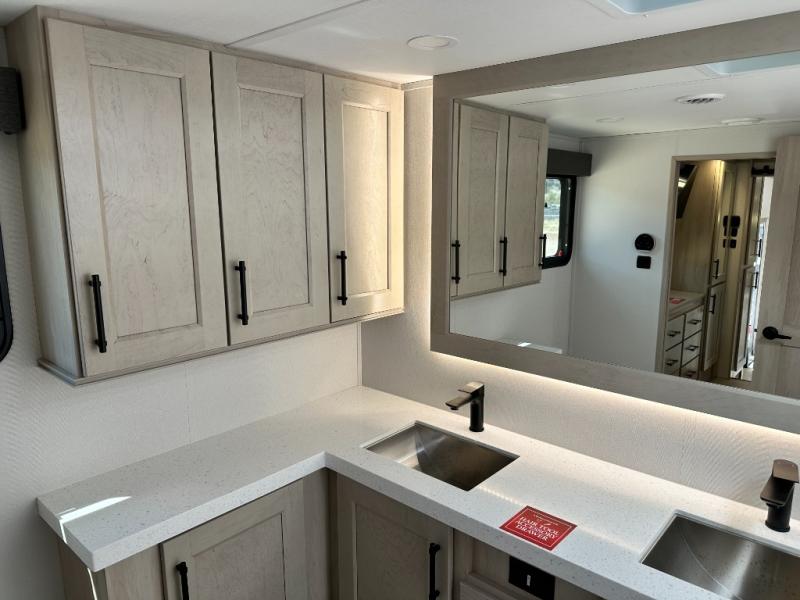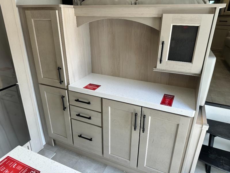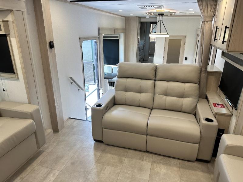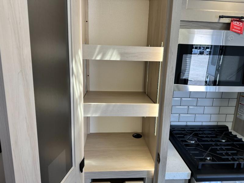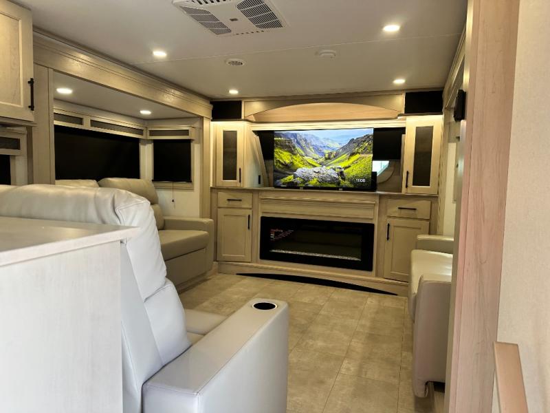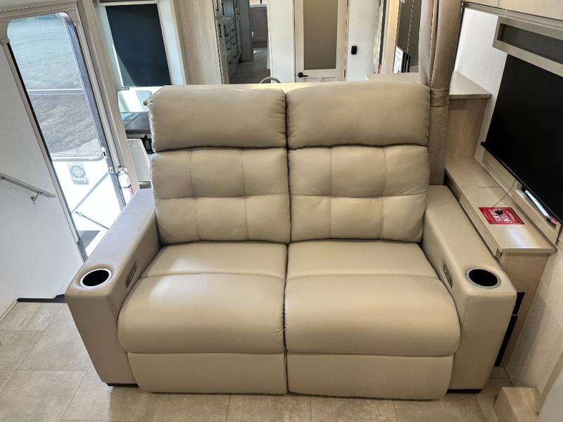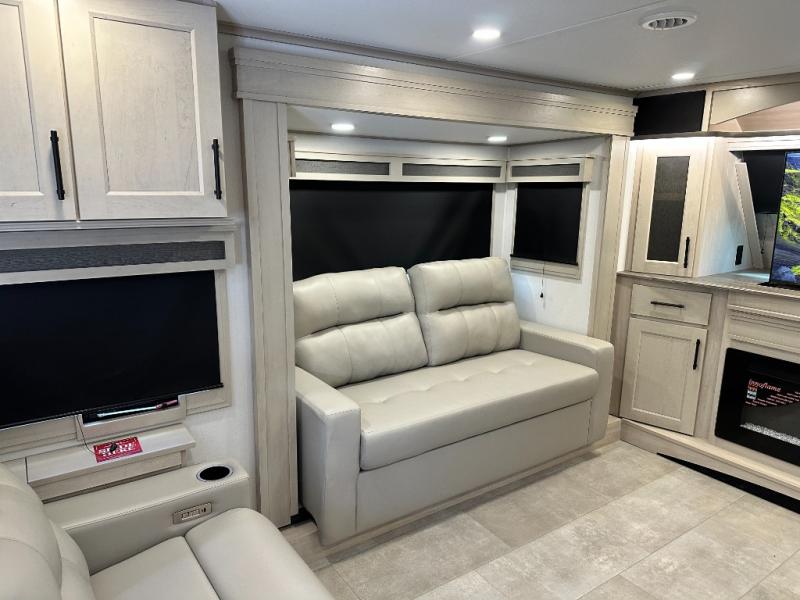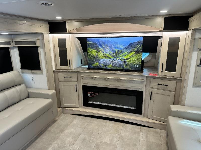Five slide outs, a full bathroom with dual sinks, a half bath off of the kitchen, and a separate front living room and entertainment area are a few reasons you will enjoy your time spent in this fifth wheel! The separate kitchen is a dream with stainless steel appliances including a built-in oven, a pantry and hutch with counter space, a kitchen island plus a free-standing dinette slide with windows for great views. The entertainment center offers an LED Smart TV with a fireplace below and storage, and the dual opposing tri-fold sofas provide added sleeping space at night. The master bedroom includes a queen bed plus space savings sliding doors that lead you to the rear full bathroom with dual sinks, linen storage, and washer/dryer prep. The exterior has several storage choices as well including a pass-through compartment for fishing poles and such, plus the unique sliding tray in the rear allows you to bring along larger items such as camping tables, portable grills, golf clubs, totes and more.