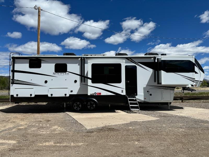 Each Solitude fifth wheel by Grand Design features a 101" wide-body construction, heavy duty 8,000 lb. axles, frameless tinted windows, and high-gloss gel coat sidewalls. You can camp year around thanks to the Weather-Tek Package that includes a 35K BTU high-capacity furnace, an all-in-one enclosed and heated utility center, and a fully enclosed underbelly with heated tanks and storage. Inside, you'll love the premium roller shades, hardwood cabinet doors, solid surface countertops, plus residential finishes throughout to make you truly feel at home. Each model also includes a MORryde CRE3000 suspension system, self adjusting brakes, and a MORryde pin box that will provide smooth towing from home to campground. Affordable luxury is possible with the Solitude fifth wheels; choose yours today!