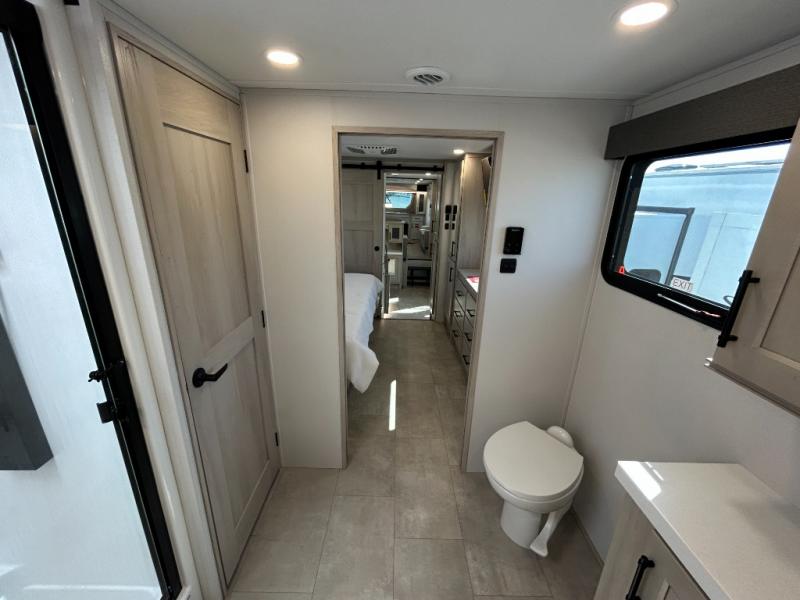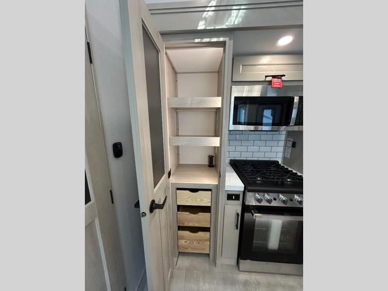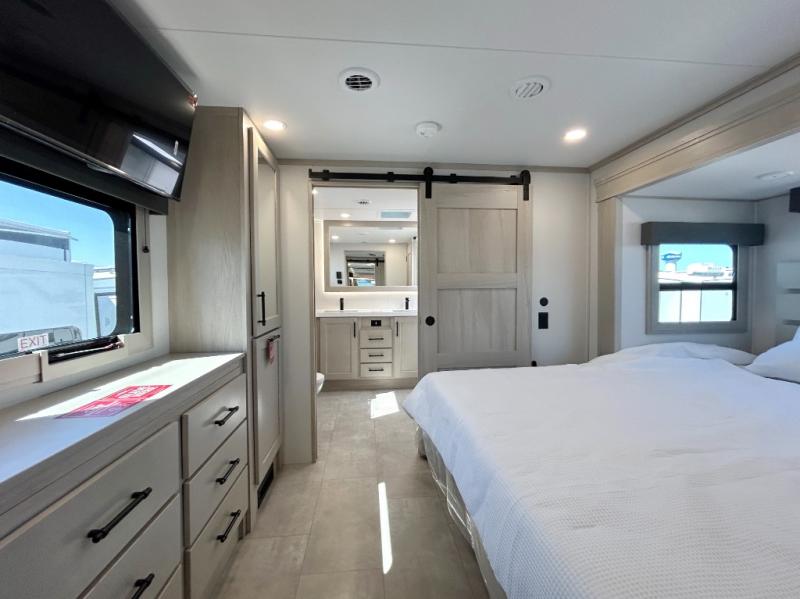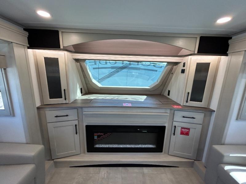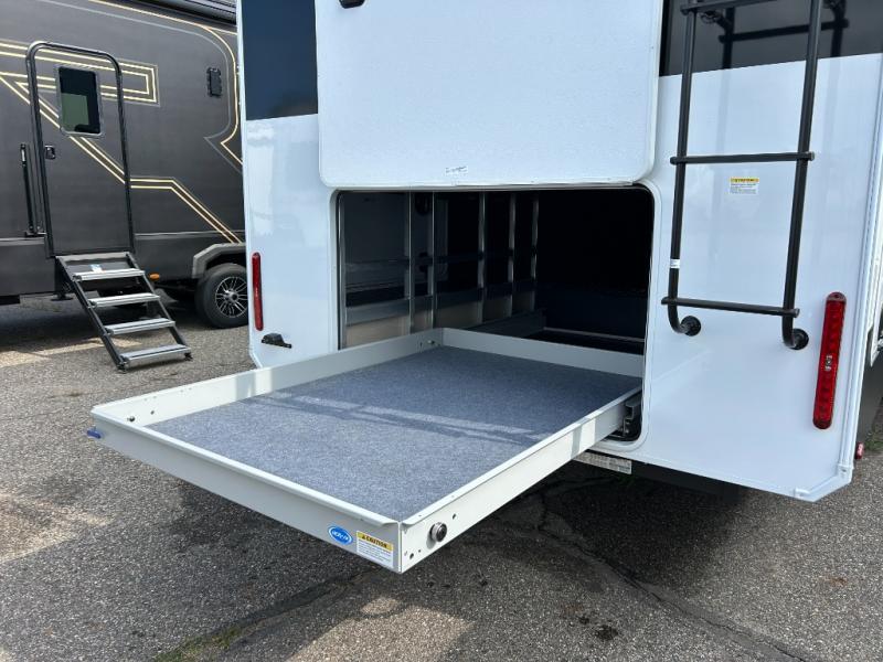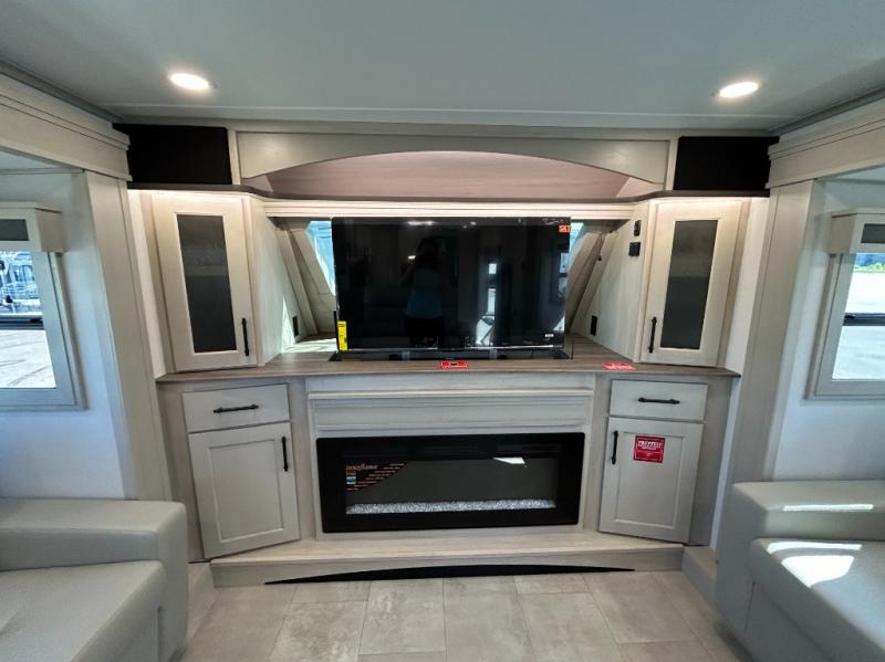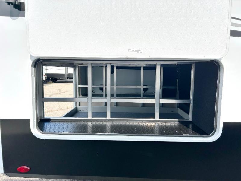 Five slide outs, a full bathroom with dual sinks, a half bath off of the kitchen, and a separate front living room and entertainment area are a few reasons you will enjoy your time spent in this fifth wheel! The separate kitchen is a dream with stainless steel appliances including a built-in oven, a pantry and hutch with counter space, a kitchen island plus a free-standing dinette slide with windows for great views. The entertainment center offers an LED Smart TV with a fireplace below and storage, and the dual opposing tri-fold sofas provide added sleeping space at night. The master bedroom includes a queen bed plus space savings sliding doors that lead you to the rear full bathroom with dual sinks, linen storage, and washer/dryer prep. The exterior has several storage choices as well including a pass-through compartment for fishing poles and such, plus the unique sliding tray in the rear allows you to bring along larger items such as camping tables, portable grills, golf clubs, totes and more.