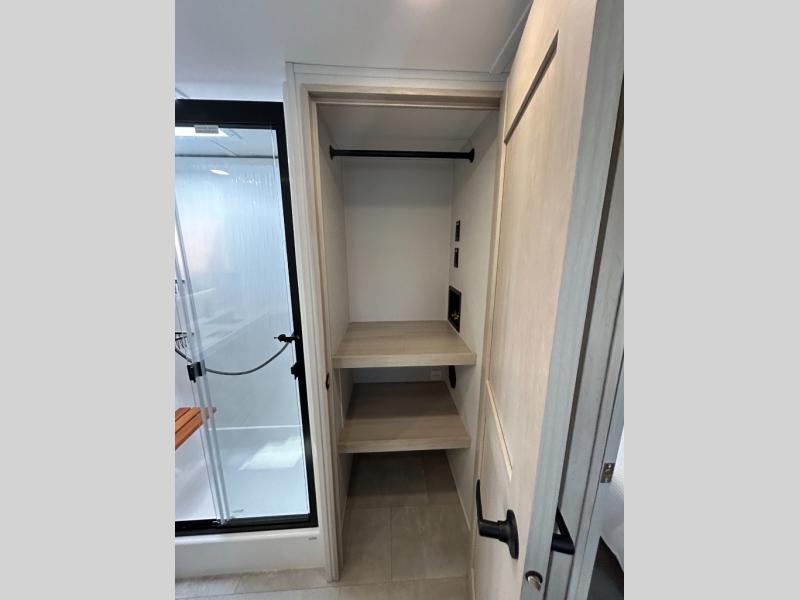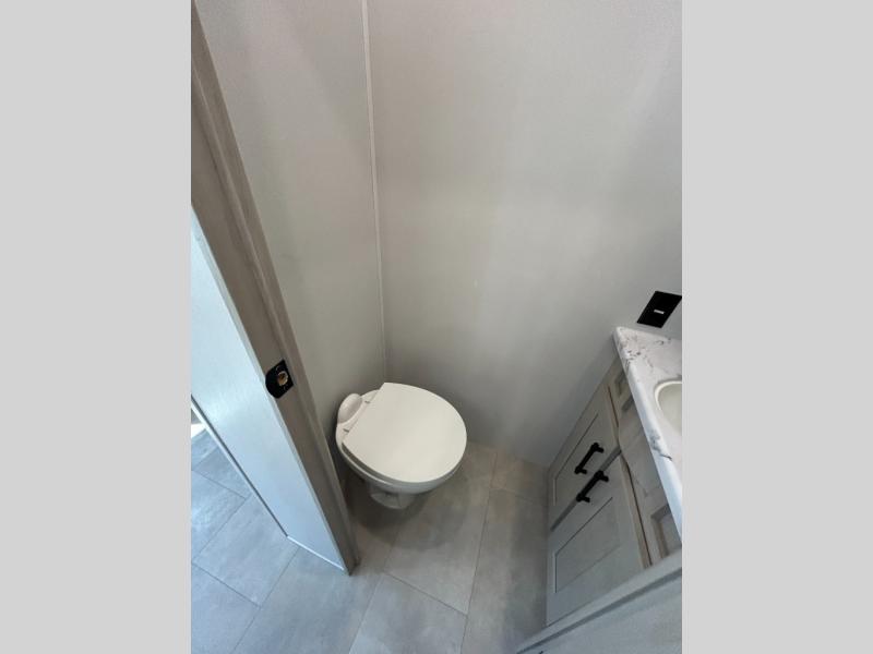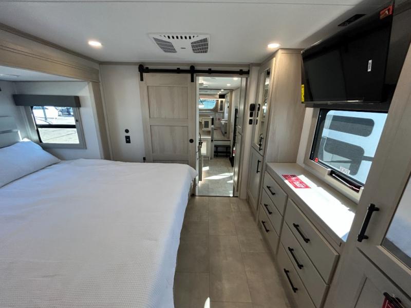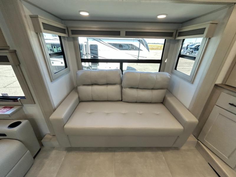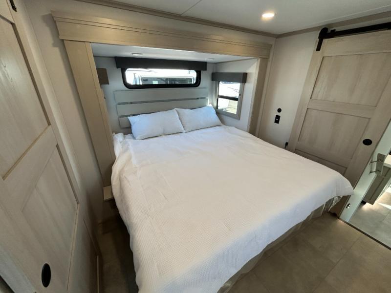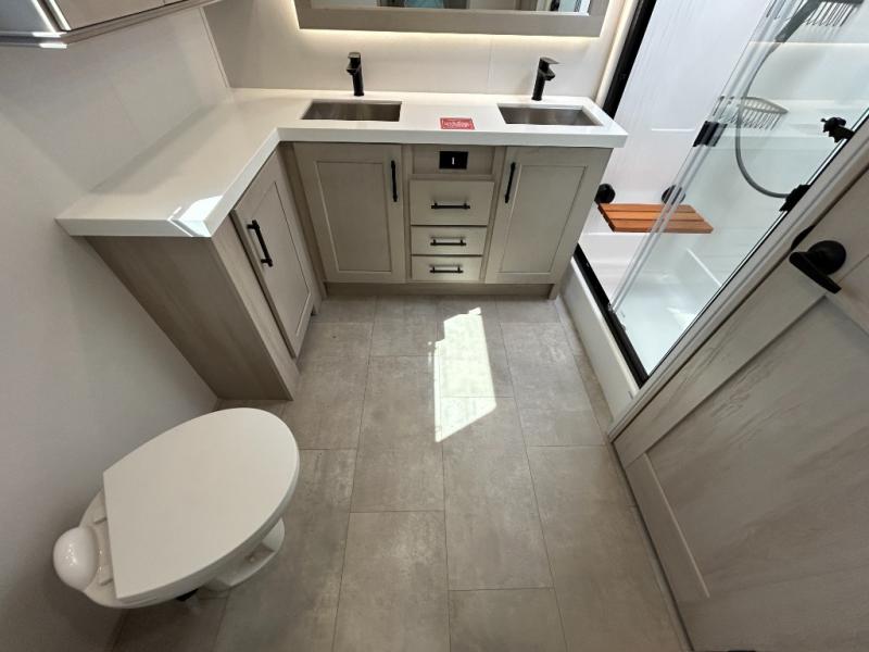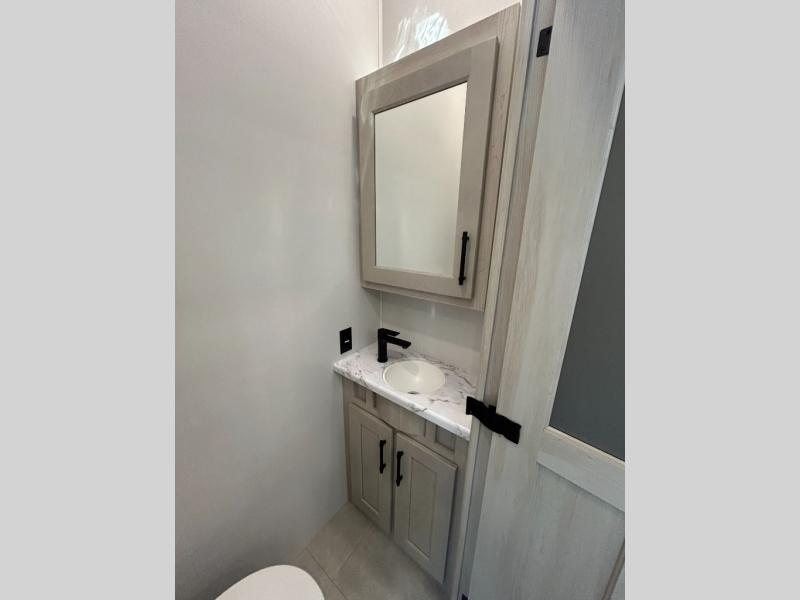 Five slide outs, a full bathroom with dual sinks, a half bath off of the kitchen, and a separate front living room and entertainment area are a few reasons you will enjoy your time spent in this fifth wheel! The separate kitchen is a dream with stainless steel appliances including a built-in oven, a pantry and hutch with counter space, a kitchen island plus a free-standing dinette slide with windows for great views. The entertainment center offers an LED Smart TV with a fireplace below and storage, and the dual opposing tri-fold sofas provide added sleeping space at night. The master bedroom includes a queen bed plus space savings sliding doors that lead you to the rear full bathroom with dual sinks, linen storage, and washer/dryer prep. The exterior has several storage choices as well including a pass-through compartment for fishing poles and such, plus the unique sliding tray in the rear allows you to bring along larger items such as camping tables, portable grills, golf clubs, totes and more.