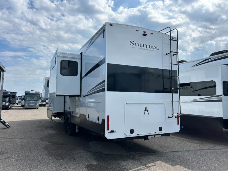 Each Solitude fifth wheel by Grand Design features a 101" wide-body construction, heavy duty 8,000 lb. axles, frameless tinted windows, and high-gloss gel coat sidewalls. You can camp year around thanks to the Weather-Tek Package that includes a 35K BTU high-capacity furnace, an all-in-one enclosed and heated utility center, and a fully enclosed underbelly with heated tanks and storage. Inside, you'll love the premium roller shades, hardwood cabinet doors, solid surface countertops, plus residential finishes throughout to make you truly feel at home. Each model also includes a MORryde CRE3000 suspension system, self adjusting brakes, and a MORryde pin box that will provide smooth towing from home to campground. Affordable luxury is possible with the Solitude fifth wheels; choose yours today!