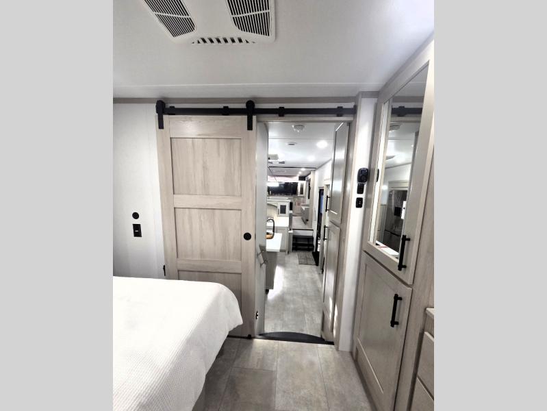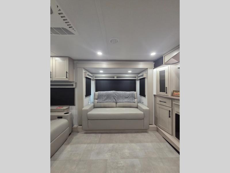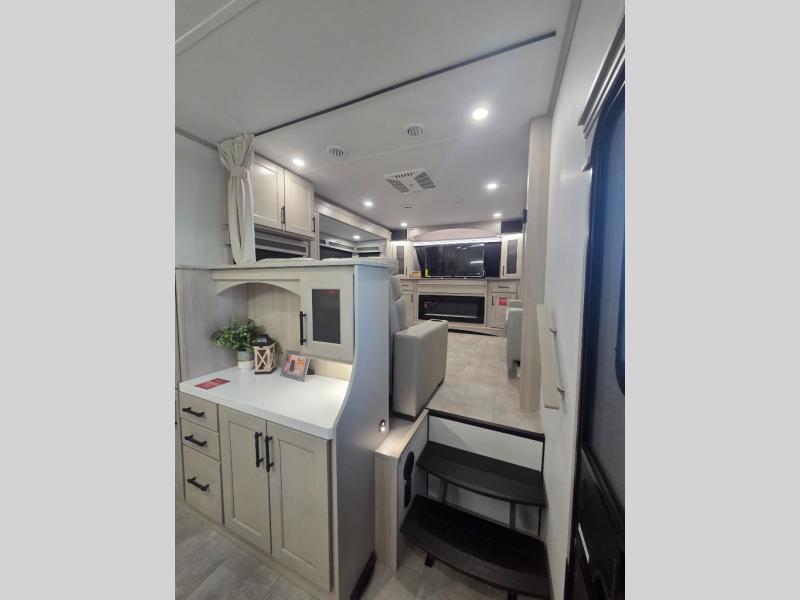 Five slide outs, a full bathroom with dual sinks, a half bath off of the kitchen, and a separate front living room and entertainment area are a few reasons you will enjoy your time spent in this fifth wheel! The separate kitchen is a dream with stainless steel appliances including a built-in oven, a pantry and hutch with counter space, a kitchen island plus a free-standing dinette slide with windows for great views. The entertainment center offers an LED Smart TV with a fireplace below and storage, and the dual opposing tri-fold sofas provide added sleeping space at night. The master bedroom includes a queen bed plus space savings sliding doors that lead you to the rear full bathroom with dual sinks, linen storage, and washer/dryer prep. The exterior has several storage choices as well including a pass-through compartment for fishing poles and such, plus the unique sliding tray in the rear allows you to bring along larger items such as camping tables, portable grills, golf clubs, totes and more.
