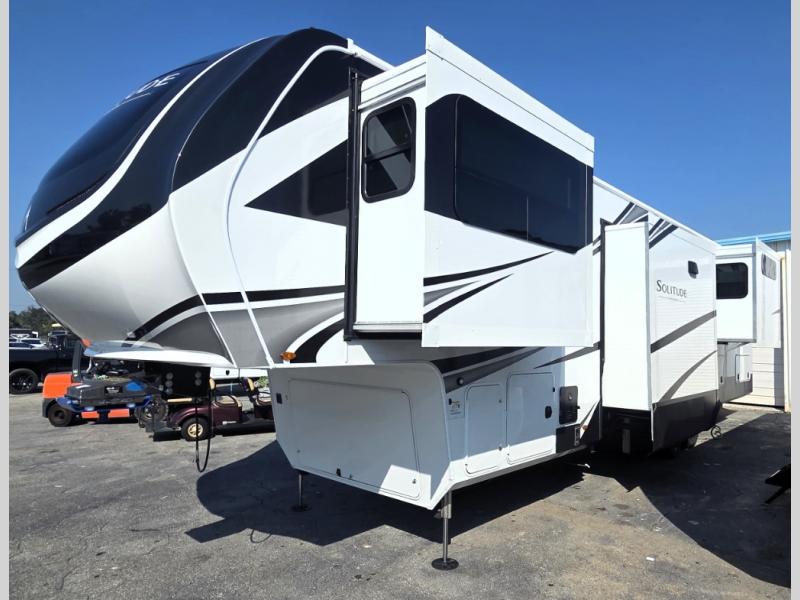 Each Solitude fifth wheel by Grand Design features a 101" wide-body construction, heavy duty 8,000 lb. axles, frameless tinted windows, and high-gloss gel coat sidewalls. You can camp year around thanks to the Weather-Tek Package that includes a 35K BTU high-capacity furnace, an all-in-one enclosed and heated utility center, and a fully enclosed underbelly with heated tanks and storage. Inside, you'll love the premium roller shades, hardwood cabinet doors, solid surface countertops, plus residential finishes throughout to make you truly feel at home. Each model also includes a MORryde CRE3000 suspension system, self adjusting brakes, and a MORryde pin box that will provide smooth towing from home to campground. Affordable luxury is possible with the Solitude fifth wheels; choose yours today!