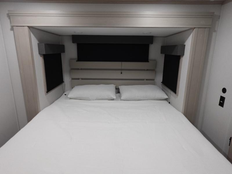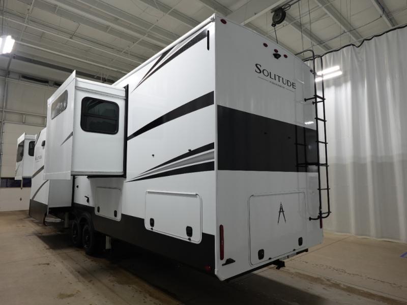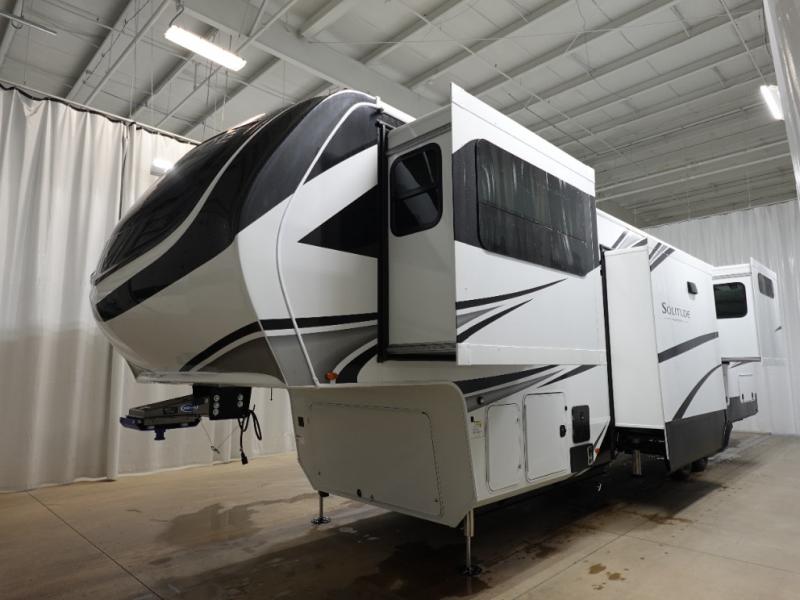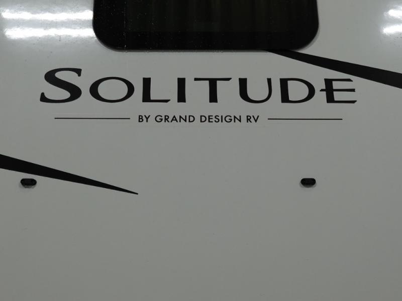 Each Solitude fifth wheel by Grand Design features a 101" wide-body construction, heavy duty 8,000 lb. axles, frameless tinted windows, and high-gloss gel coat sidewalls. You can camp year around thanks to the Weather-Tek Package that includes a 35K BTU high-capacity furnace, an all-in-one enclosed and heated utility center, and a fully enclosed underbelly with heated tanks and storage. Inside, you'll love the premium roller shades, hardwood cabinet doors, solid surface countertops, plus residential finishes throughout to make you truly feel at home. Each model also includes a MORryde CRE3000 suspension system, self adjusting brakes, and a MORryde pin box that will provide smooth towing from home to campground. Affordable luxury is possible with the Solitude fifth wheels; choose yours today!