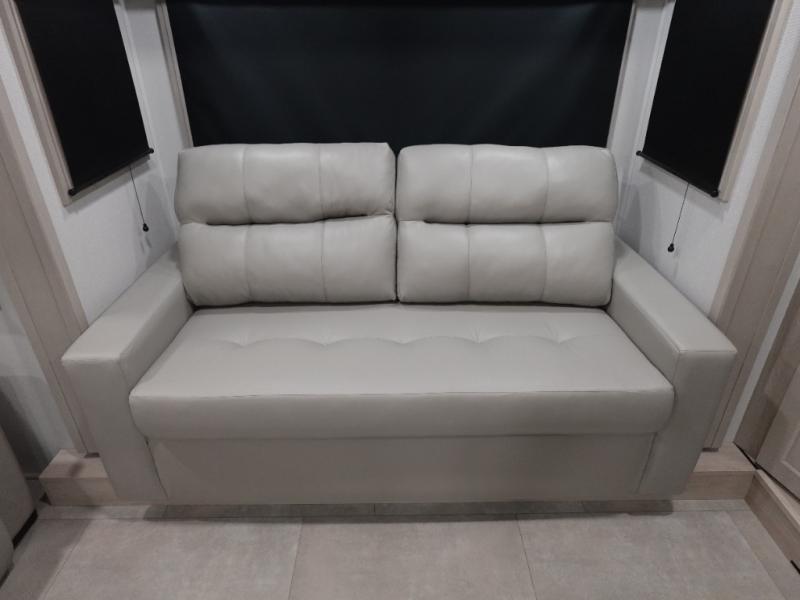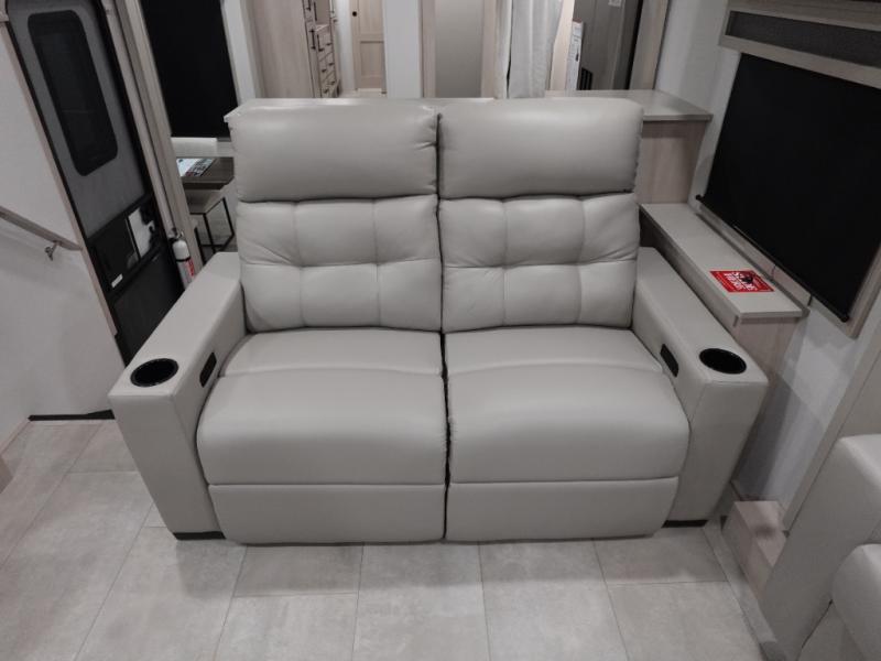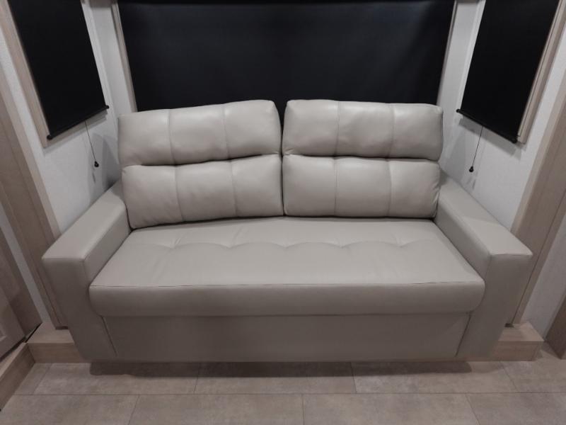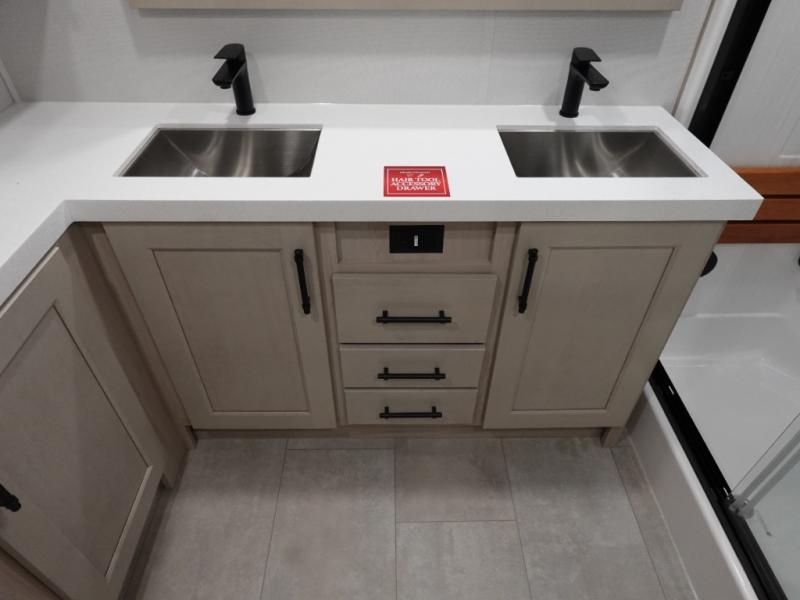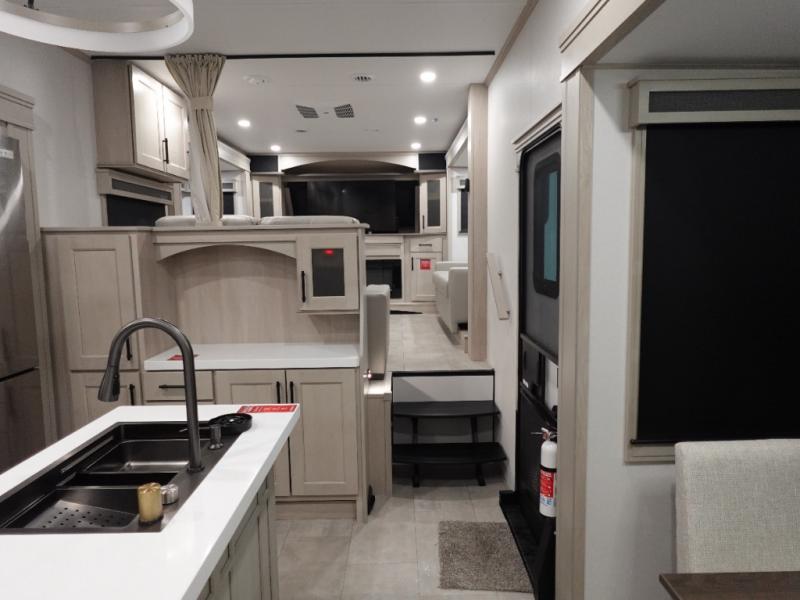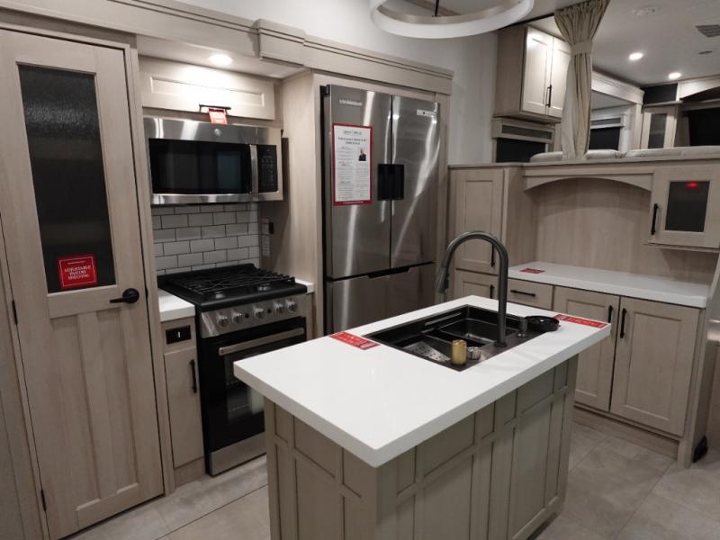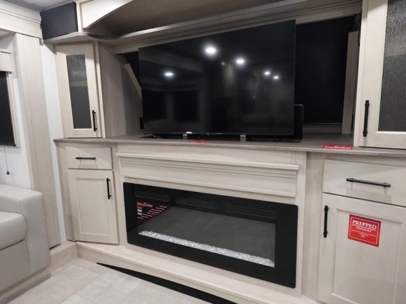 Five slide outs, a full bathroom with dual sinks, a half bath off of the kitchen, and a separate front living room and entertainment area are a few reasons you will enjoy your time spent in this fifth wheel! The separate kitchen is a dream with stainless steel appliances including a built-in oven, a pantry and hutch with counter space, a kitchen island plus a free-standing dinette slide with windows for great views. The entertainment center offers an LED Smart TV with a fireplace below and storage, and the dual opposing tri-fold sofas provide added sleeping space at night. The master bedroom includes a bed plus space savings sliding doors that lead you to the rear full bathroom with dual sinks and linen storage. The exterior has several storage choices as well including a pass-through compartment for fishing poles and such, plus the unique sliding tray in the rear allows you to bring along larger items such as camping tables, portable grills, golf clubs, totes and more.