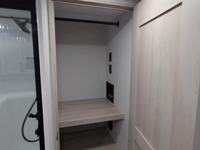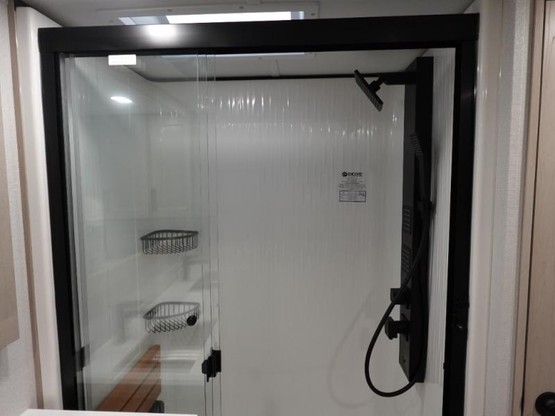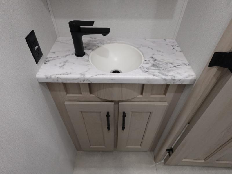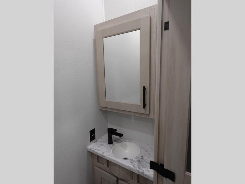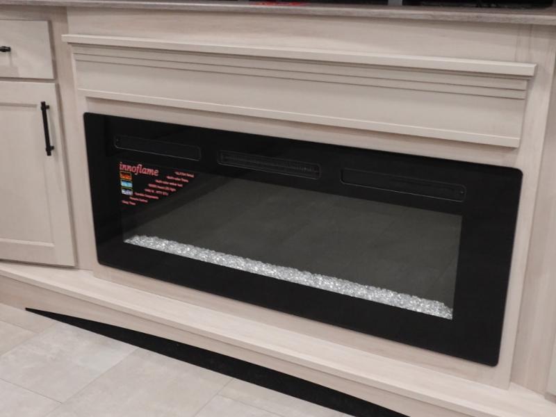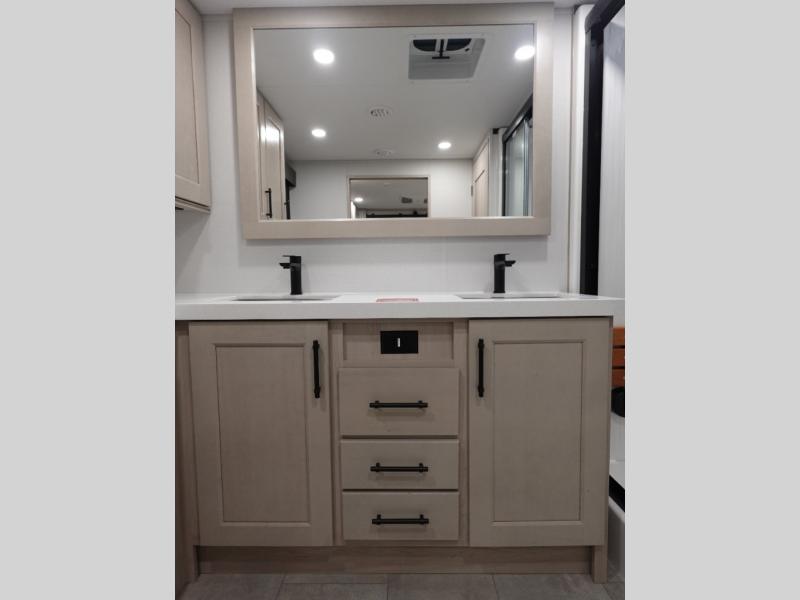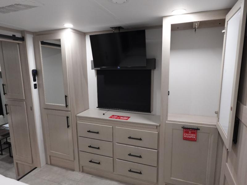 Five slide outs, a full bathroom with dual sinks, a half bath off of the kitchen, and a separate front living room and entertainment area are a few reasons you will enjoy your time spent in this fifth wheel! The separate kitchen is a dream with stainless steel appliances including a built-in oven, a pantry and hutch with counter space, a kitchen island plus a free-standing dinette slide with windows for great views. The entertainment center offers an LED Smart TV with a fireplace below and storage, and the dual opposing tri-fold sofas provide added sleeping space at night. The master bedroom includes a bed plus space savings sliding doors that lead you to the rear full bathroom with dual sinks and linen storage. The exterior has several storage choices as well including a pass-through compartment for fishing poles and such, plus the unique sliding tray in the rear allows you to bring along larger items such as camping tables, portable grills, golf clubs, totes and more.