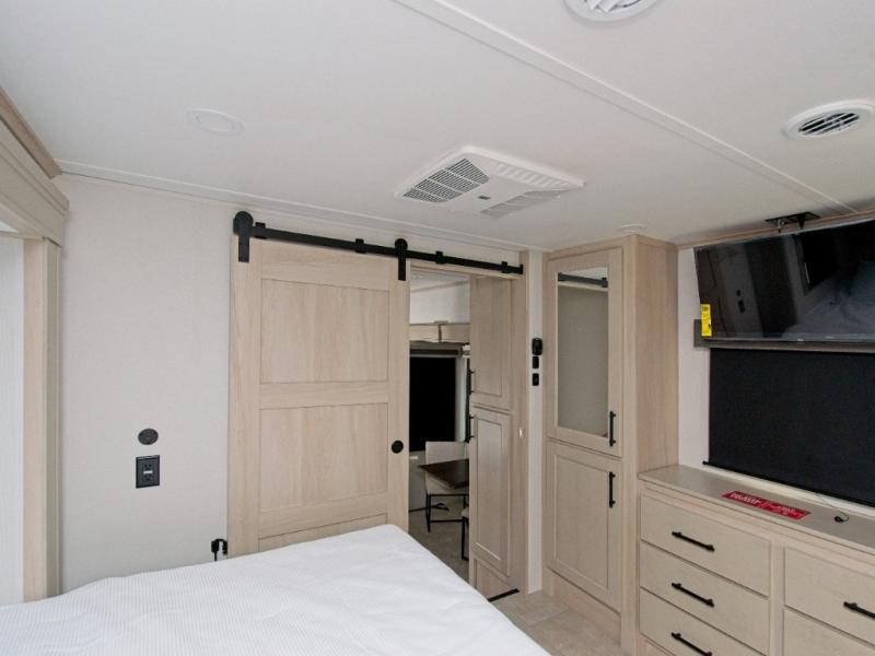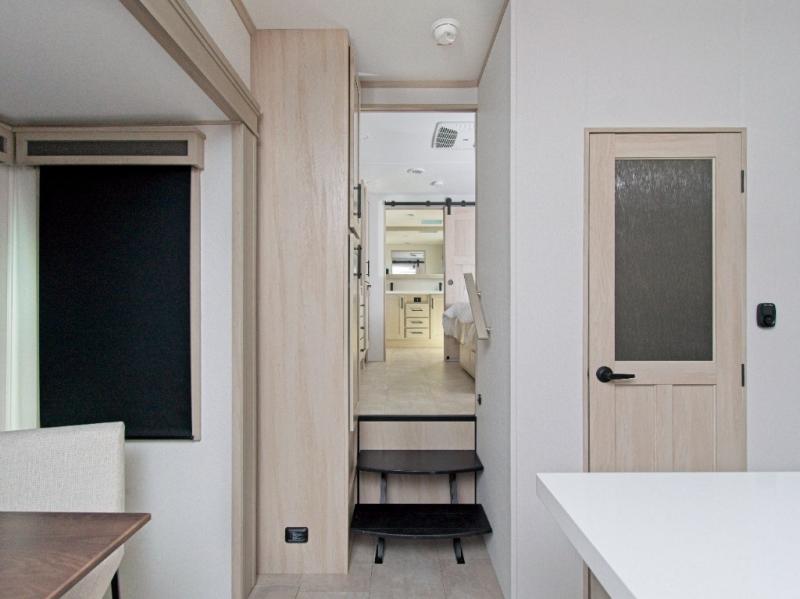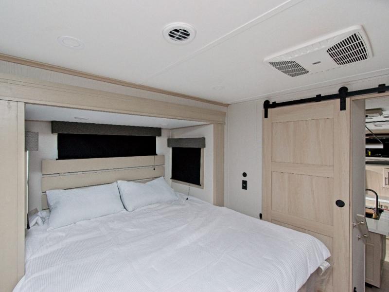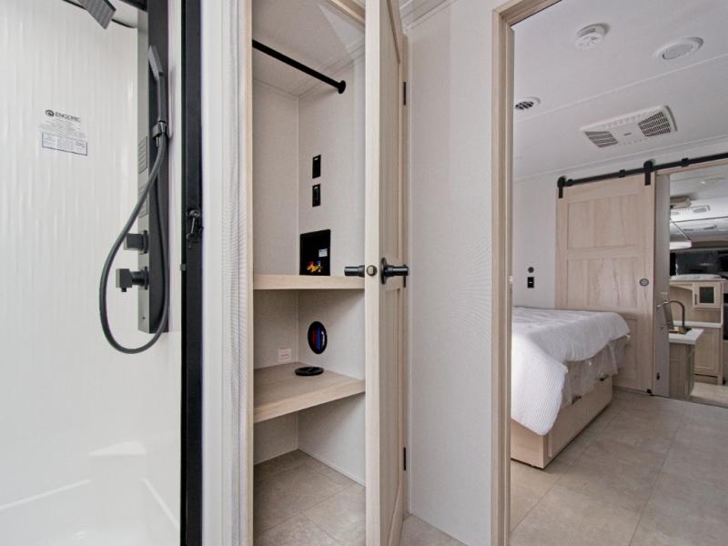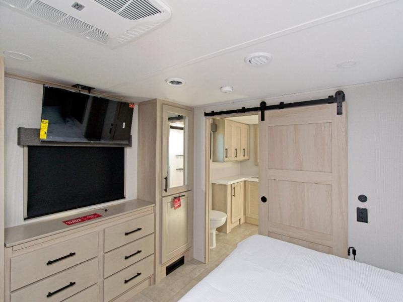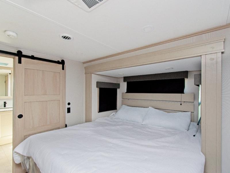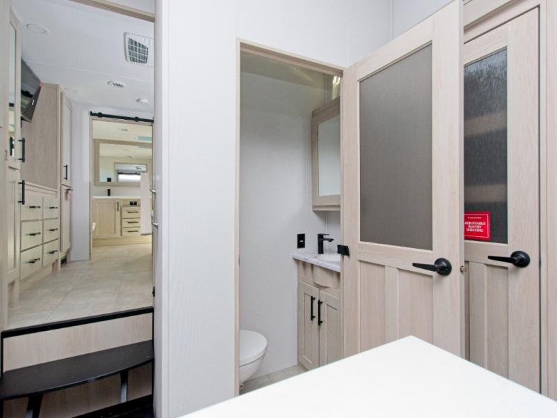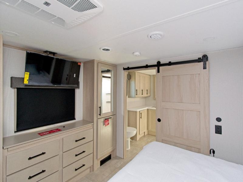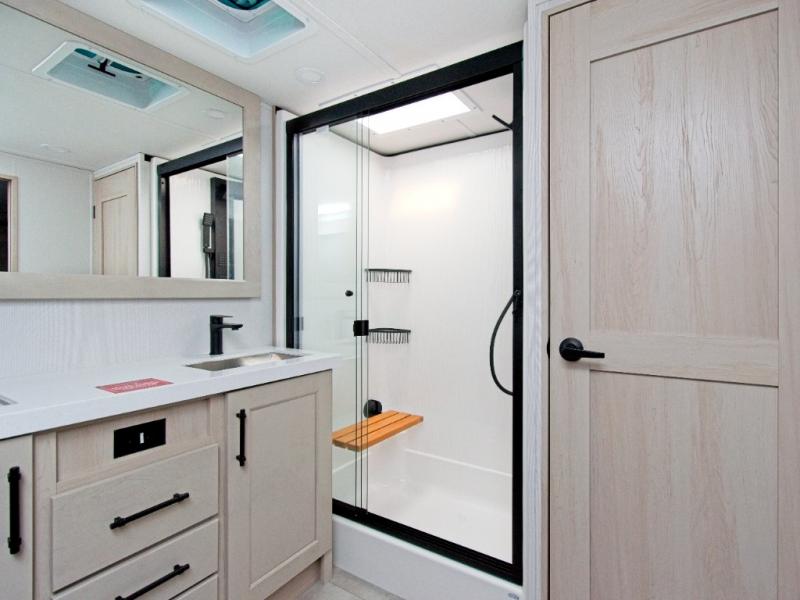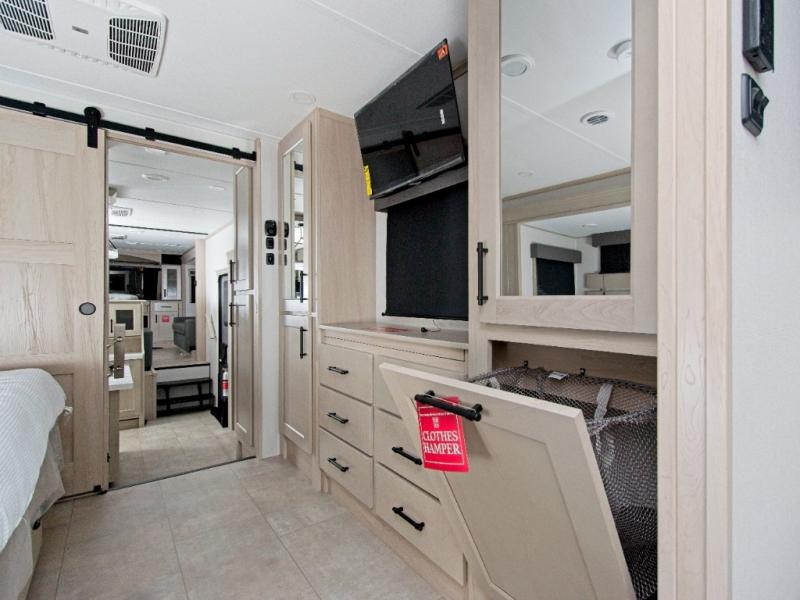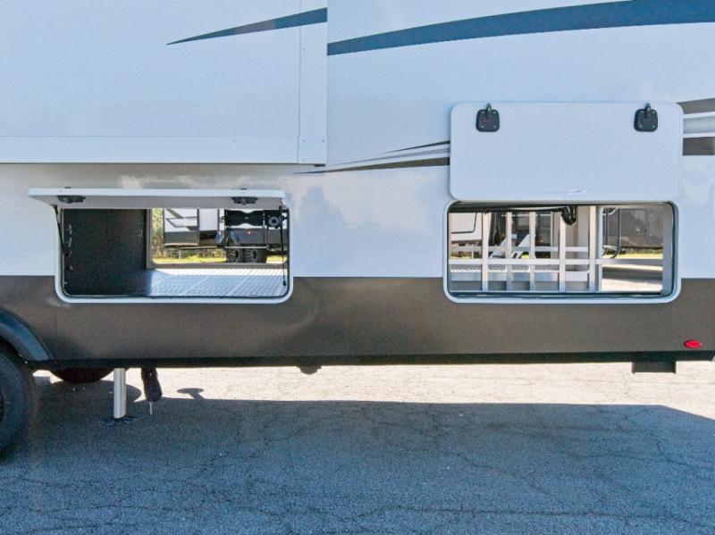 The rear master suite includes a queen bed and sliding doors that lead to a luxurious full bathroom with a dual-sink vanity, linen storage, and washer/dryer prep. A half bath off the kitchen adds convenience for guests. Outside, the pass-through storage and sliding rear tray make it easy to bring along large items like grills, golf clubs, and camping gear.