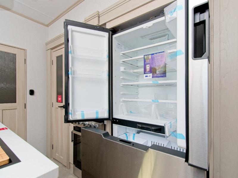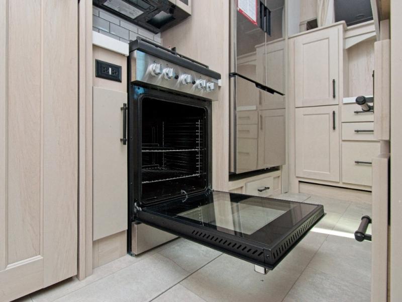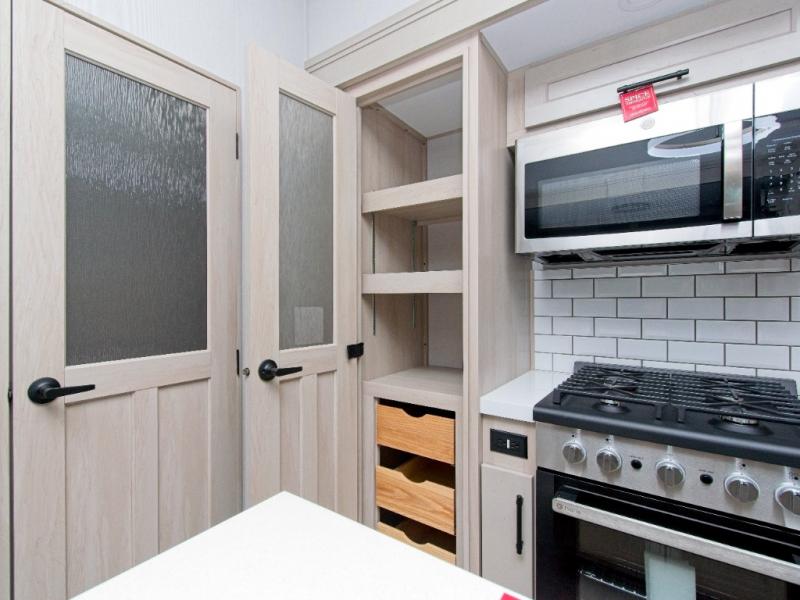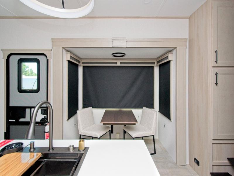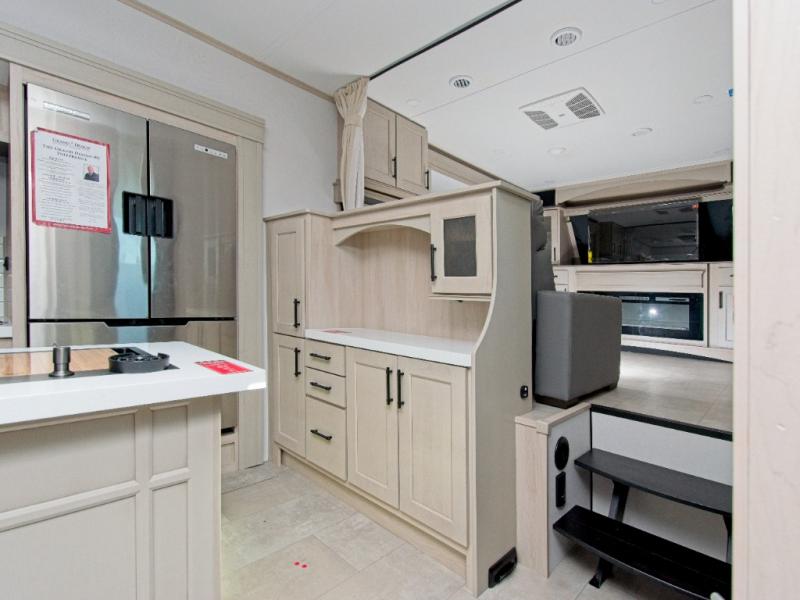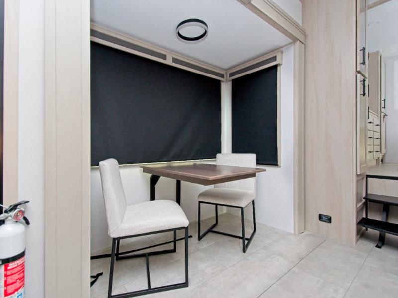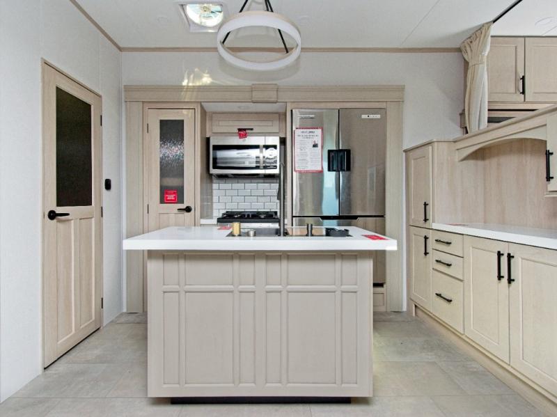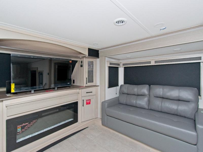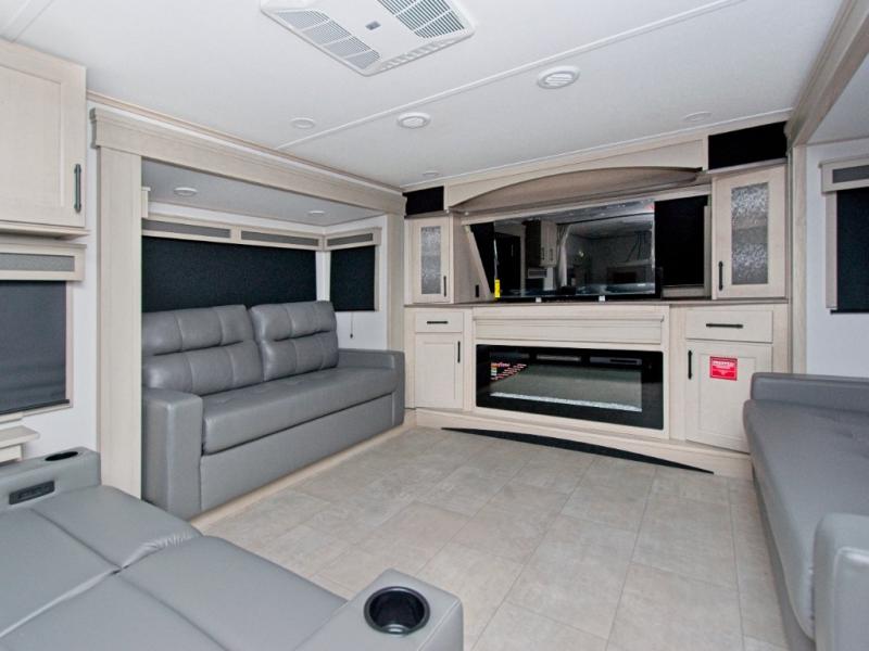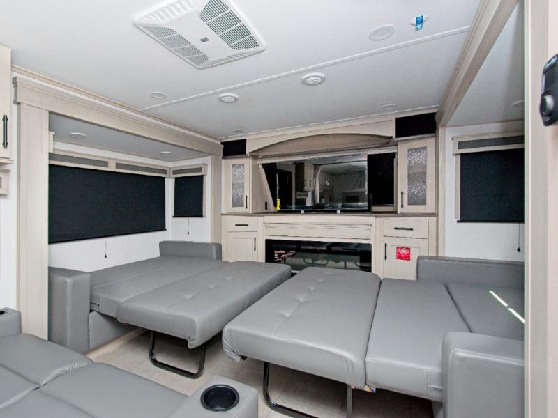 Enjoy cozy evenings with dual tri-fold sofas, theater-style seating, and a 50" LED Smart TV above a warm fireplace. The chef-inspired kitchen features a built-in stainless steel oven, residential microwave, pantry, hutch, and a kitchen island for extra prep space. A free-standing dinette with panoramic windows adds charm and natural light.