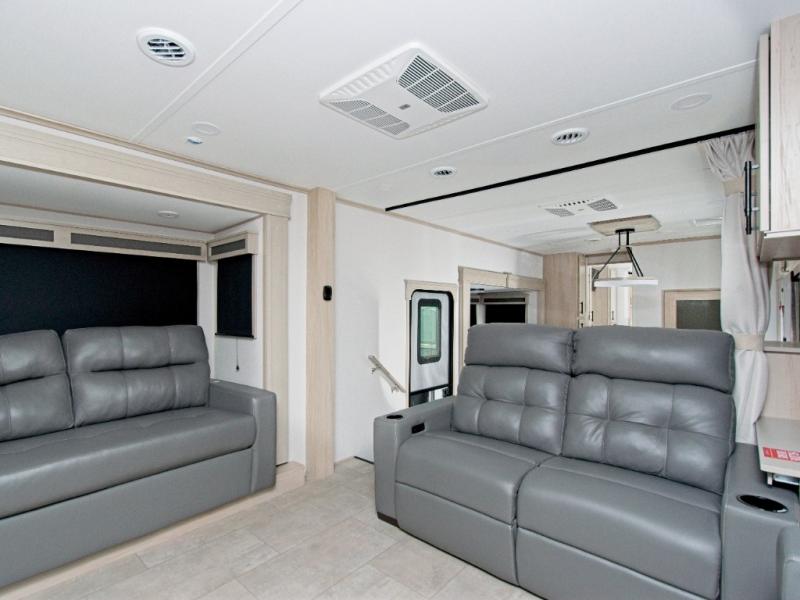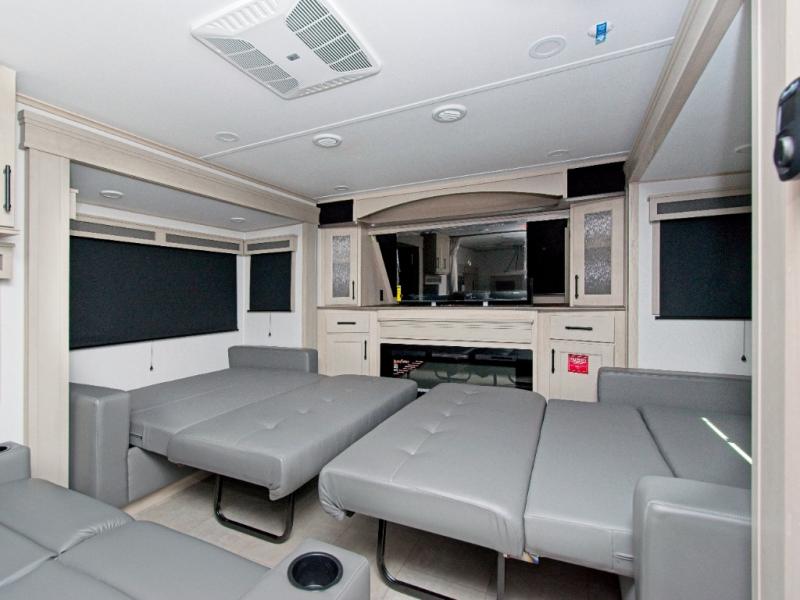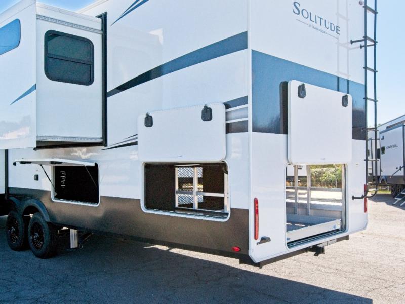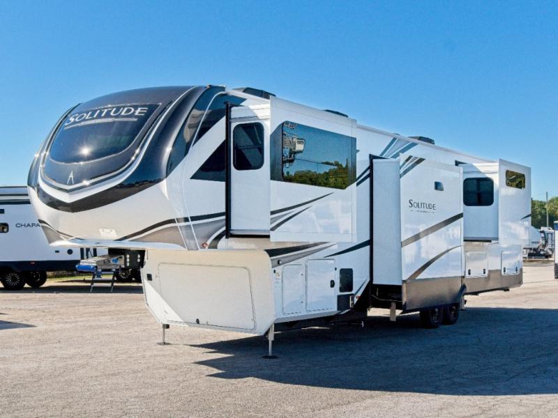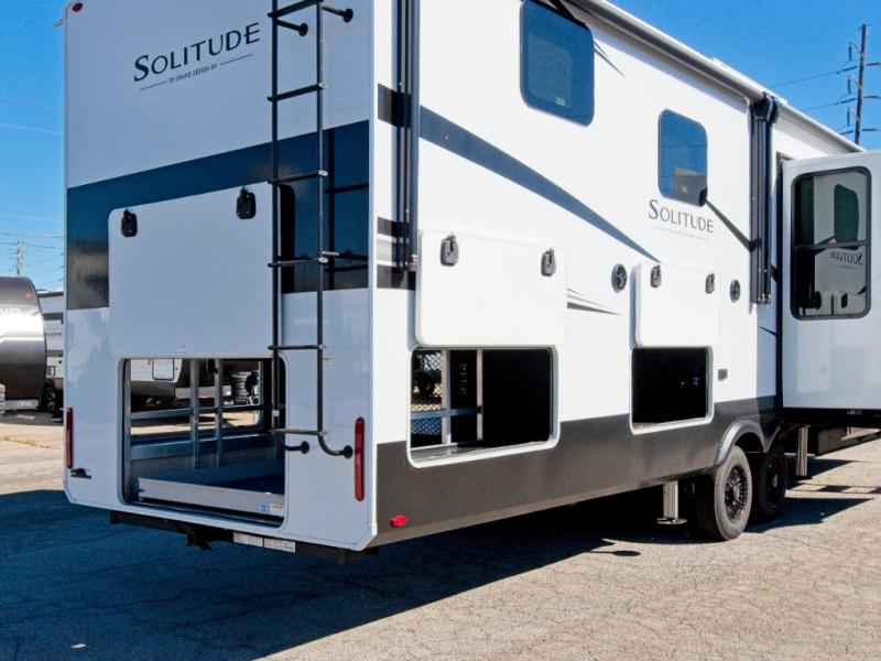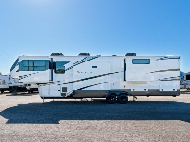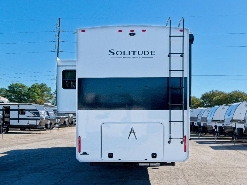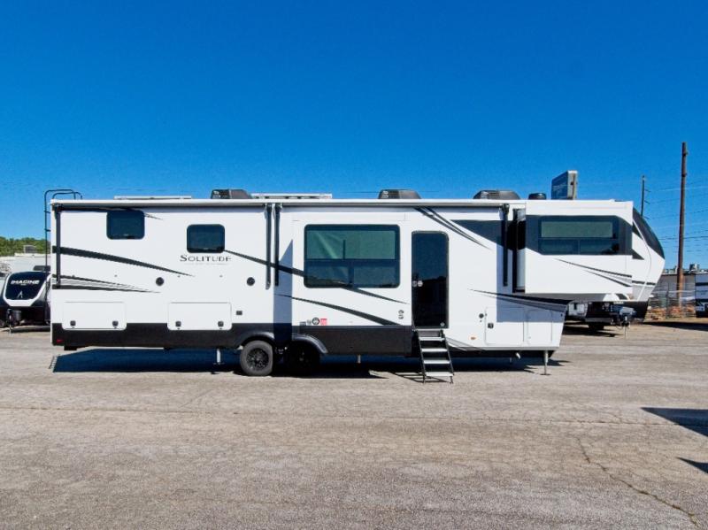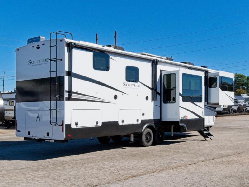 Experience residential-style comfort and spacious living with the Grand Design Solitude 380FL, a luxury fifth wheel designed for extended stays and full-time RV living. With five slide-outs, this model offers expansive interior space, including a private front living area perfect for entertaining or relaxing.